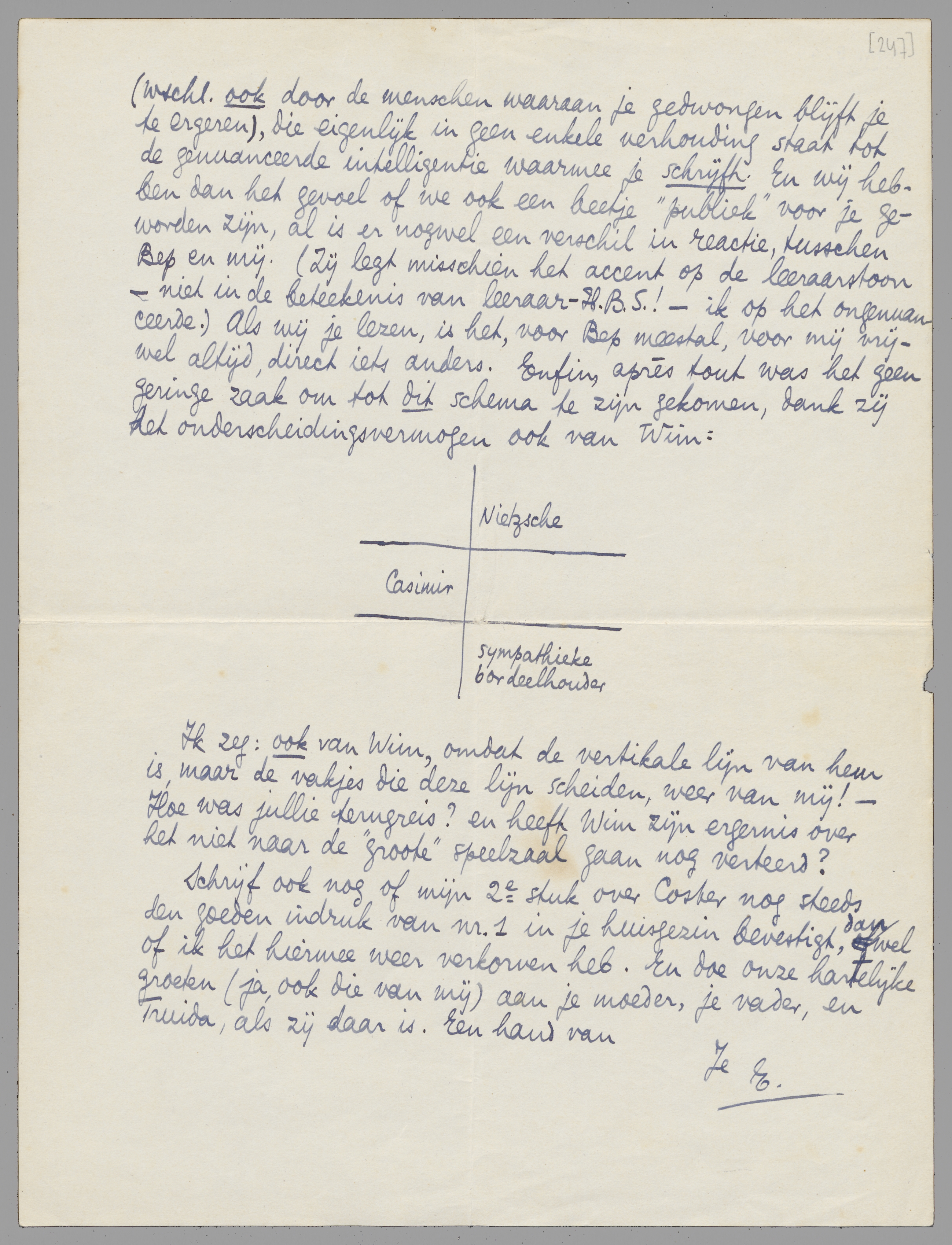 Wij hebben beiden het gevoel dat we je wel erg ondankbaar en agressief bejegend hebben, toen we spraken over dat toekomstige boek van je, dat nogwel aan ons opgedragen zal zijn! Maar de kwestie komt hierop neer, dat je je hoe langer hoe meer een paradoxale, boutade-achtige manier van praten hebt aangewend, (wschl. ook door de menschen waaraan je gedwongen blijft je te ergeren), die eigenlijk in geen enkele verhouding staat tot de genuanceerde intelligentie waarmee je schrijft. En wij hebben dan het gevoel of we ook een beetje ‘publiek’ voor je geworden zijn, al is er nogwel een verschil in reactie, tusschen Bep en mij. (Zij legt misschien het accent op de leeraarstoon - niet in de beteekenis van leeraar-H.B.S.! - ik op het ongenuanceerde.) Als wij je lezen, is het, voor Bep meestal, voor mij vrijwel altijd, direct iets anders. Enfin, après tout was het geen geringe zaak om tot dit schema te zijn gekomen, dank zij het onderscheidingsvermogen ook van Wim: