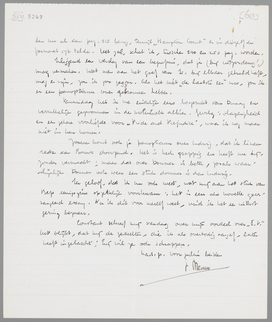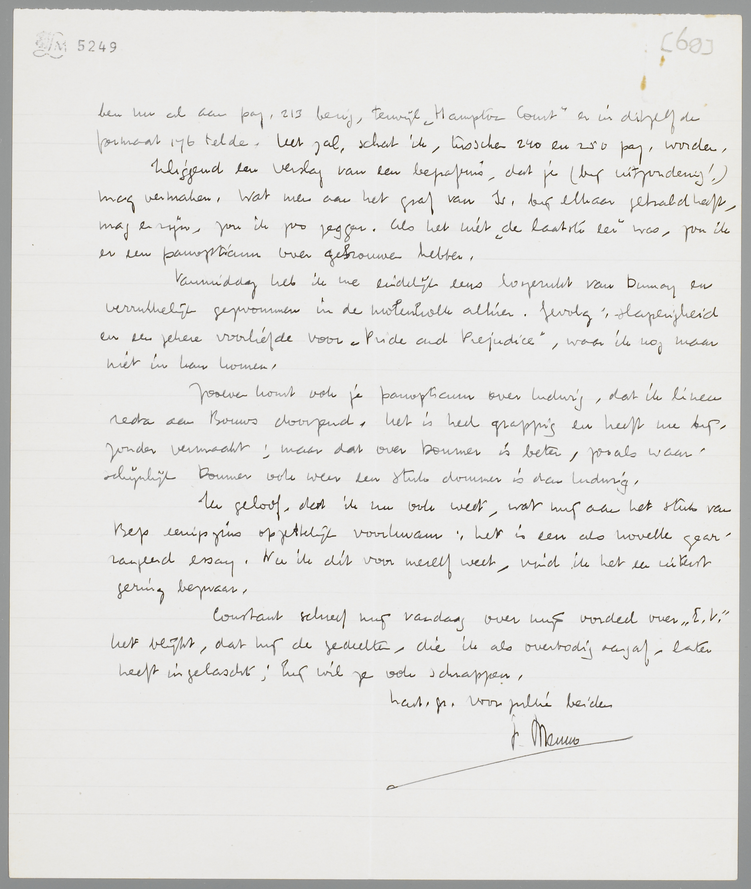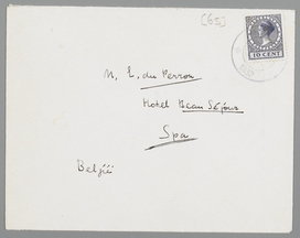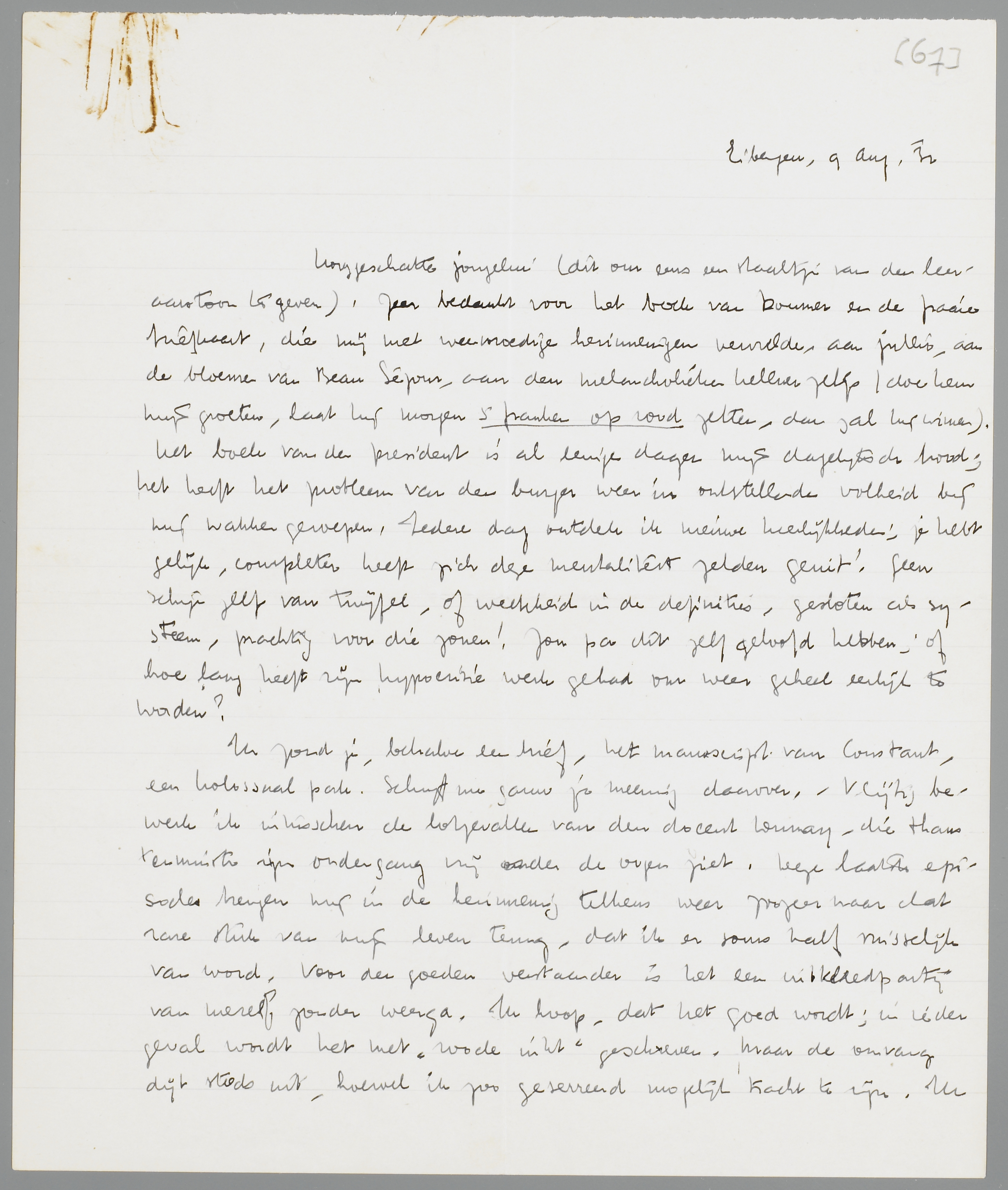 Ik zond je, behalve een brief, het manuscript van Constant, een kolossaal pak. Schrijf me gauw je meening daarover. - Vlijtig bewerk ik intusschen de lotgevallen van den docent Dumay, die thans tenminste zijn ondergang vrij onder de oogen ziet. Deze laatste episodes brengen mij in de herinnering telkens weer zoozeer naar dat rare stuk van mijn leven terug, dat ik er soms half misselijk van word. Voor den goeden verstaander is het een uitkleedpartij van mezelf zonder weerga. Ik hoop, dat het goed wordt; in ieder geval wordt het met ‘roode inkt’ geschreven. Maar de omvang dijt steeds uit, hoewel ik zoo geserreerd mogelijk tracht te zijn. Ik ben nu al aan pag. 213 bezig, terwijl Hampton Court er in ditzelfde formaat 176 telde. Het zal, schat ik, tusschen 240 en 250 pag. worden.