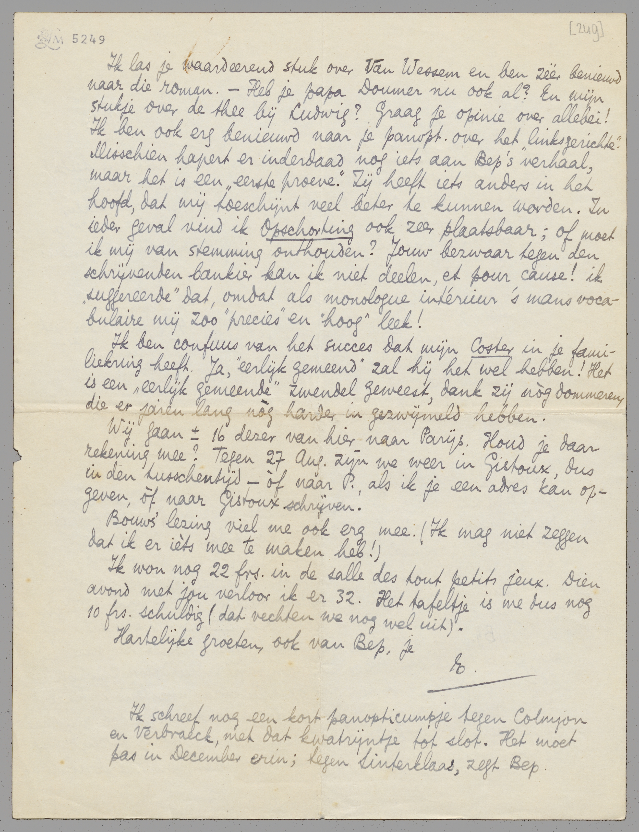 Ik las je waardeerend stuk over Van Wessem en ben zéér benieuwd naar die roman. - Heb je papa Doumer nu ook al? En mijn stukje over de thee bij Ludwig? Graag je opinie over allebei! Ik ben ook erg benieuwd naar je panopt. over het ‘linksgerichte’. Misschien hapert er inderdaad nog iets aan Bep's verhaal, maar het is een ‘eerste proeve’. Zij heeft iets anders in het hoofd, dat mij toeschijnt veel beter te kunnen worden. In ieder geval vind ik Opschorting ook zeer plaatsbaar; of moet ik mij van stemming onthouden? Jouw bezwaar tegen den schrijvenden bankier kan ik niet deelen, et pour cause! ik ‘suggereerde’ dat, omdat als monologue intérieur 's mans vocabulaire mij zoo ‘precies’ en ‘hoog’ leek!