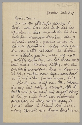 Dit uit een allerliefst plaatsje bij Parijs, maar het is het derde dat we afzoeken in deze smoorhitte. We doen niets dan limonade drinken, eten is bijzaak, zweeten gebeurt zonder één seconde oponthoud: iedere drie minuten een natte zakdoek. We hebben van allerlei gezien, maar nog niets geschikts gevonden; en het leven wordt echt duur. Vandaag hebben we een gesplitste campagne; Bep in Suresnes, ik hier; rendez-vous tegen avondval in Le Val d'Or! (mooie naam, hè?)