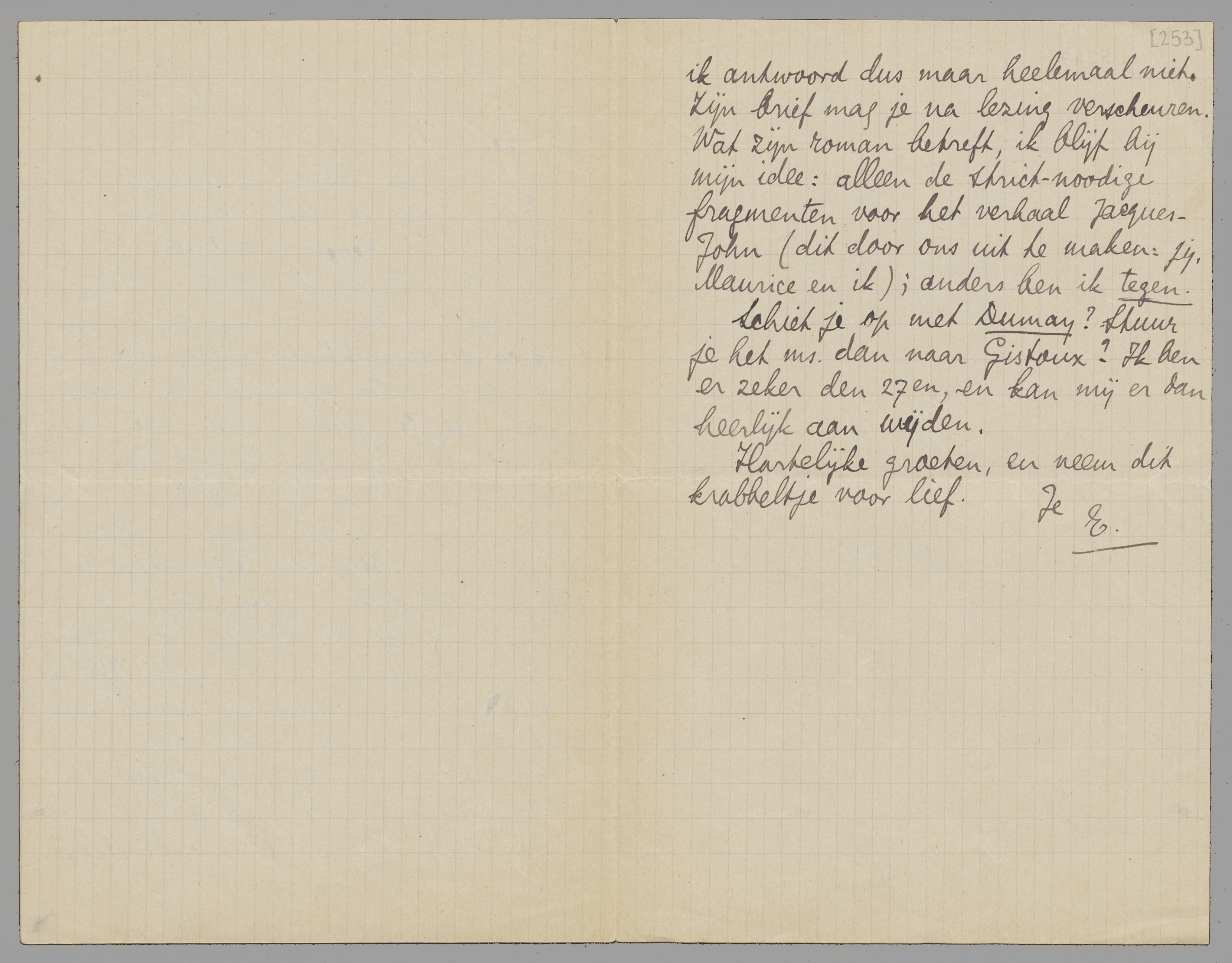 Hierbij een brief van Van Wessem die mij met walging vervult. Als ik deed wat ‘mijn hart mij ingaf’, schreef ik hierop: ‘Je bent een verdomde ouwehoer en loop verder naar de pomp’. Maar ik bedenk dat het in menig opzicht een brave kerel is en ik antwoord dus maar heelemaal niet. Zijn brief mag je na lezing verscheuren. Wat zijn roman betreft, ik blijf bij mijn idee: alleen de strict-noodige fragmenten voor het verhaal Jacques - John (dit door ons uit te maken: jij, Maurice en ik); anders ben ik tegen. Schiet je op met Dumay? Stuur je het ms. dan naar Gistoux? Ik ben er zeker den 27en, en kan mij er dan heerlijk aan wijden.