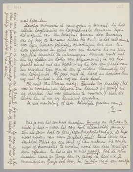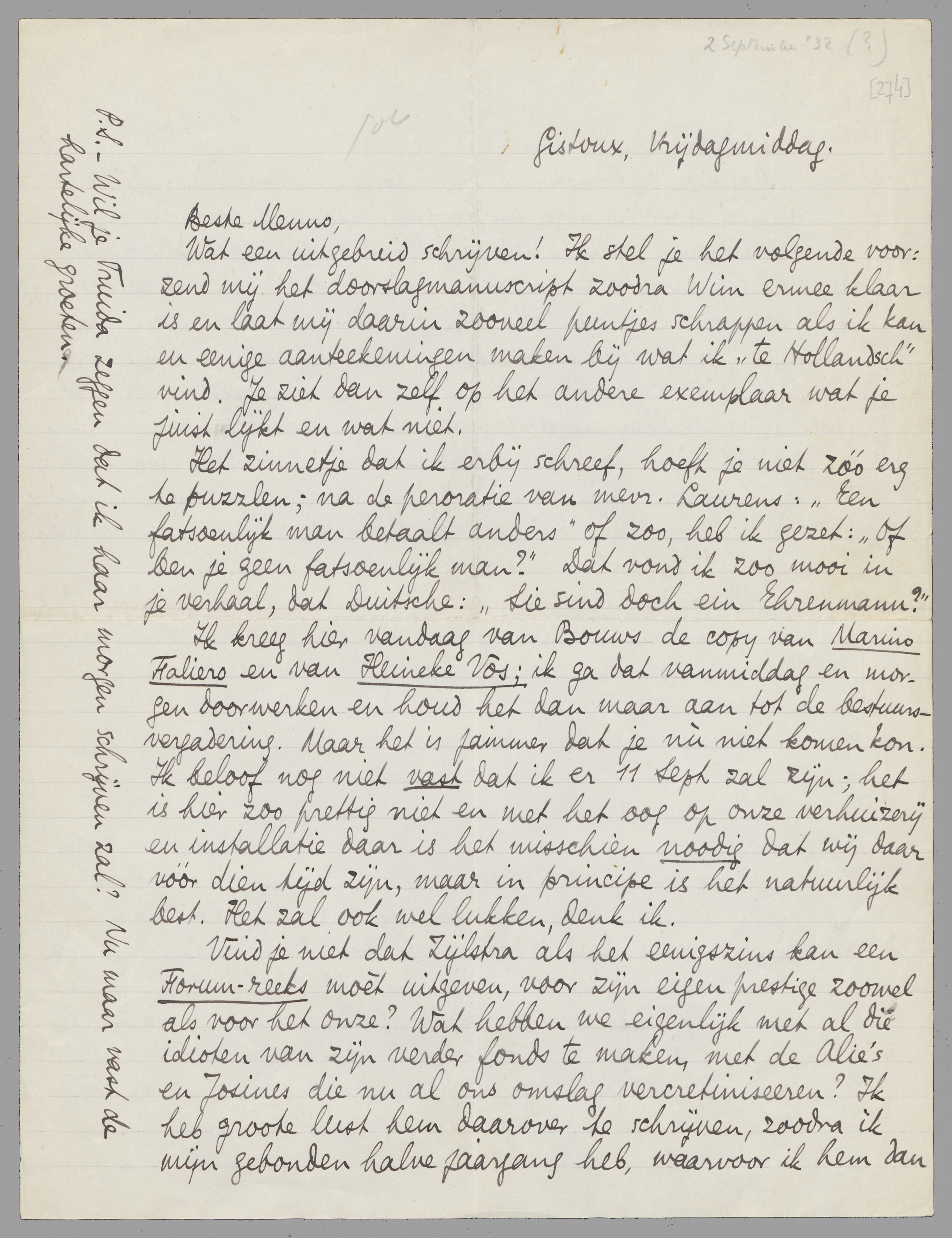 Ik kreeg hier vandaag van Bouws de copy van Marino Faliero en van Heineke Vos; ik ga dat vanmiddag en morgen doorwerken en houd het dan maar aan tot de bestuursvergadering. Maar het is jammer dat je nù niet komen kon. Ik beloof nog niet vast dat ik er 11 Sept. zal zijn; het is hier zoo prettig niet en met het oog op onze verhuizerij en installatie daar is het misschien noodig dat wij daar vóór dien tijd zijn, maar in principe is het natuurlijk best. Het zal ook wel lukken, denk ik.