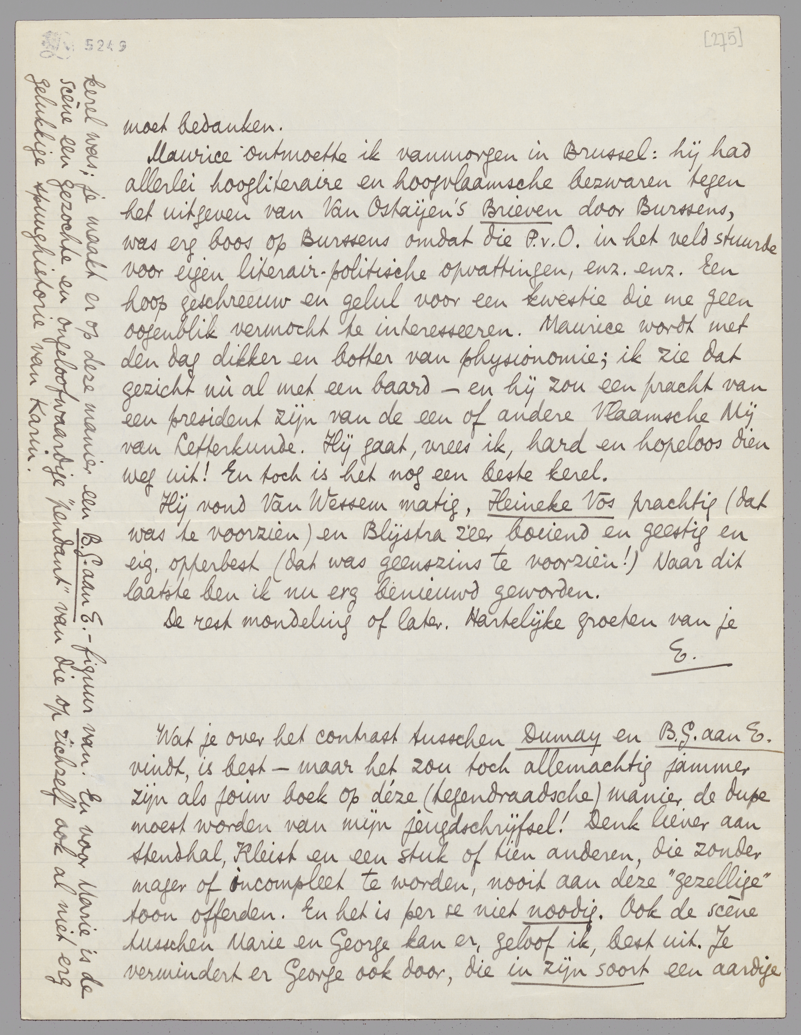 Maurice ontmoette ik vanmorgen in Brussel: hij had allerlei hoogliteraire en hoogvlaamsche bezwaren tegen het uitgeven van Van Ostaijen's Brieven door Burssens, was erg boos op Burssens omdat die P.v.O. in het veld stuurde voor eigen literair-politische opvattingen, enz. enz. Een hoop geschreeuw en gelul voor een kwestie die me geen oogenblik vermocht te interesseeren. Maurice wordt met den dag dikker en botter van physionomie; ik zie dat gezicht nù al met een baard - en hij zou een pracht van een president zijn van de een of andere Vlaamsche Mij van Letterkunde. Hij gaat, vrees ik, hard en hopeloos dien weg uit! En toch is het nog een beste kerel.