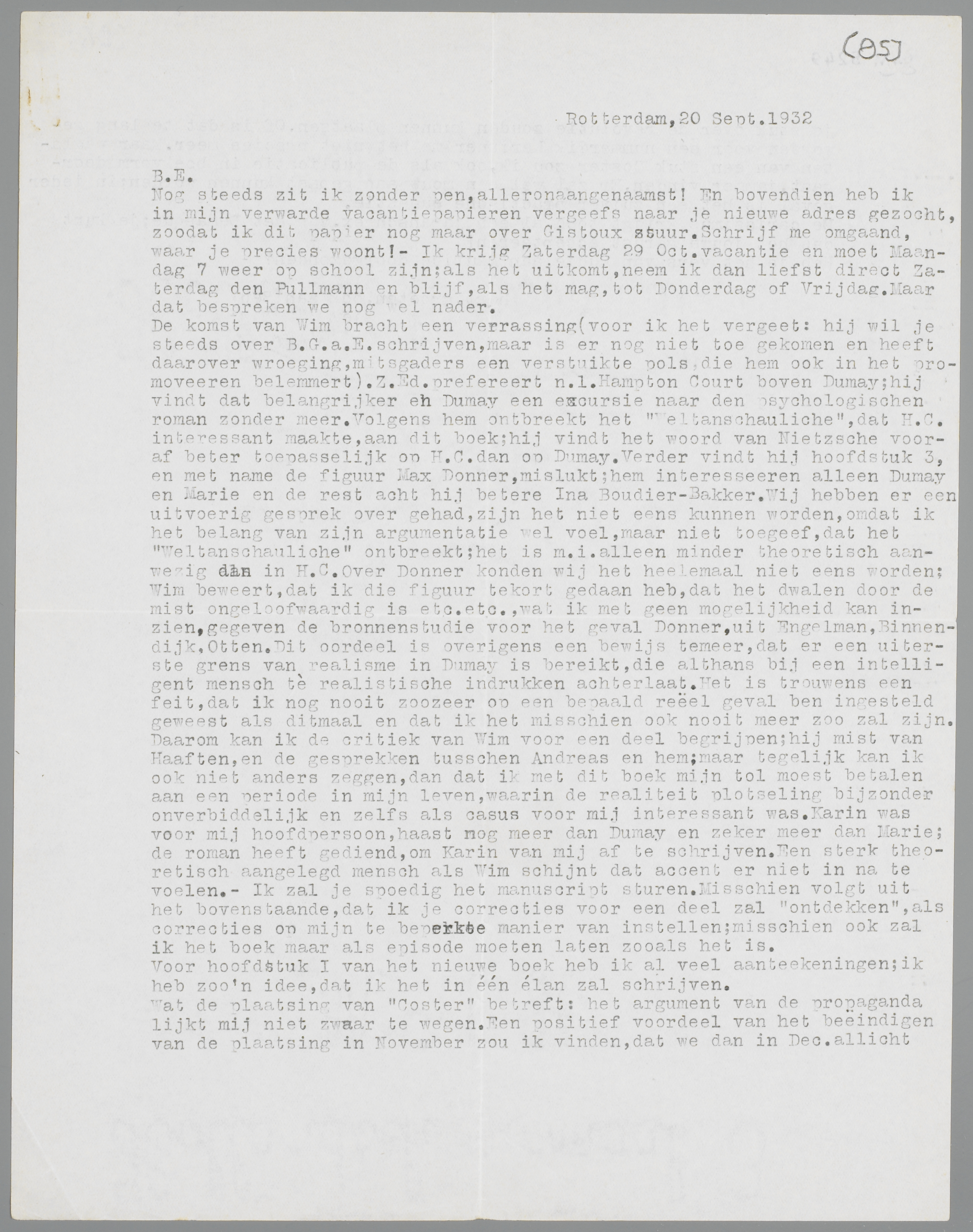 De komst van Wim bracht een verrassing (voor ik het vergeet: hij wil je steeds over B.G.a.E. schrijven, maar is er nog niet toe gekomen en heeft daarover wroeging, mitsgaders een verstuikte pols, die hem ook in het promoveeren belemmert). Z.Ed. prefereert n.l. Hampton Court boven Dumay; hij vindt dat belangrijker en Dumay een excursie naar den psychologischen roman zonder meer. Volgens hem ontbreekt het ‘Weltanschauliche’, dat H.C. interessant maakte, aan dit boek; hij vindt het woord van Nietzsche vooraf beter toepasselijk op H.C. dan op Dumay. Verder vindt hij hoofdstuk 3, en met name de figuur Max Donner, mislukt; hem interesseeren alleen Dumay en Marie en de rest acht hij betere Ina Boudier-Bakker. Wij hebben er een uitvoerig gesprek over gehad, zijn het niet eens kunnen worden, omdat ik het belang van zijn argumentatie wel voel, maar niet toegeef, dat het ‘Weltanschauliche’ ontbreekt; het is m.i. alleen minder theoretisch aanwezig dan in H.C. Over Donner konden wij het heelemaal niet eens worden; Wim beweert, dat ik die figuur tekort gedaan heb, dat het dwalen door de mist ongeloofwaardig is etc. etc., wat ik met geen mogelijkheid kan inzien, gegeven de bronnenstudie voor het geval Donner, uit Engelman, Binnendijk, Otten. Dit oordeel is overigens een bewijs temeer, dat er een uiterste grens van realisme in Dumay is bereikt, die althans bij een intelligent mensch tè realistische indrukken achterlaat. Het is trouwens een feit, dat ik nog nooit zoozeer op een bepaald reëel geval ben ingesteld geweest als ditmaal en dat ik het misschien ook nooit meer zoo zal zijn. Daarom kan ik de critiek van Wim voor een deel begrijpen; hij mist van Haaften, en de gesprekken tusschen Andreas en hem; maar tegelijk kan ik ook niet anders zeggen, dan dat ik met dit boek mijn tol moest betalen aan een periode in mijn leven, waarin de realiteit plotseling bijzonder onverbiddelijk en zelfs als casus voor mij interessant was. Karin was voor mij hoofdpersoon, haast nog meer dan Dumay en zeker meer dan Marie; de roman heeft gediend, om Karin van mij af te schrijven. Een sterk theoretisch aangelegd mensch als Wim schijnt dat accent er niet in na te voelen. - Ik zal je spoedig het manuscript sturen. Misschien volgt uit het bovenstaande, dat ik je correcties voor een deel zal ‘ontdekken’; als correcties op mijn te beperkte manier van instellen; misschien ook zal ik het boek maar als episode moeten laten zooals het is.