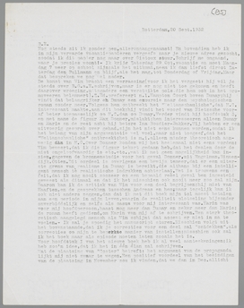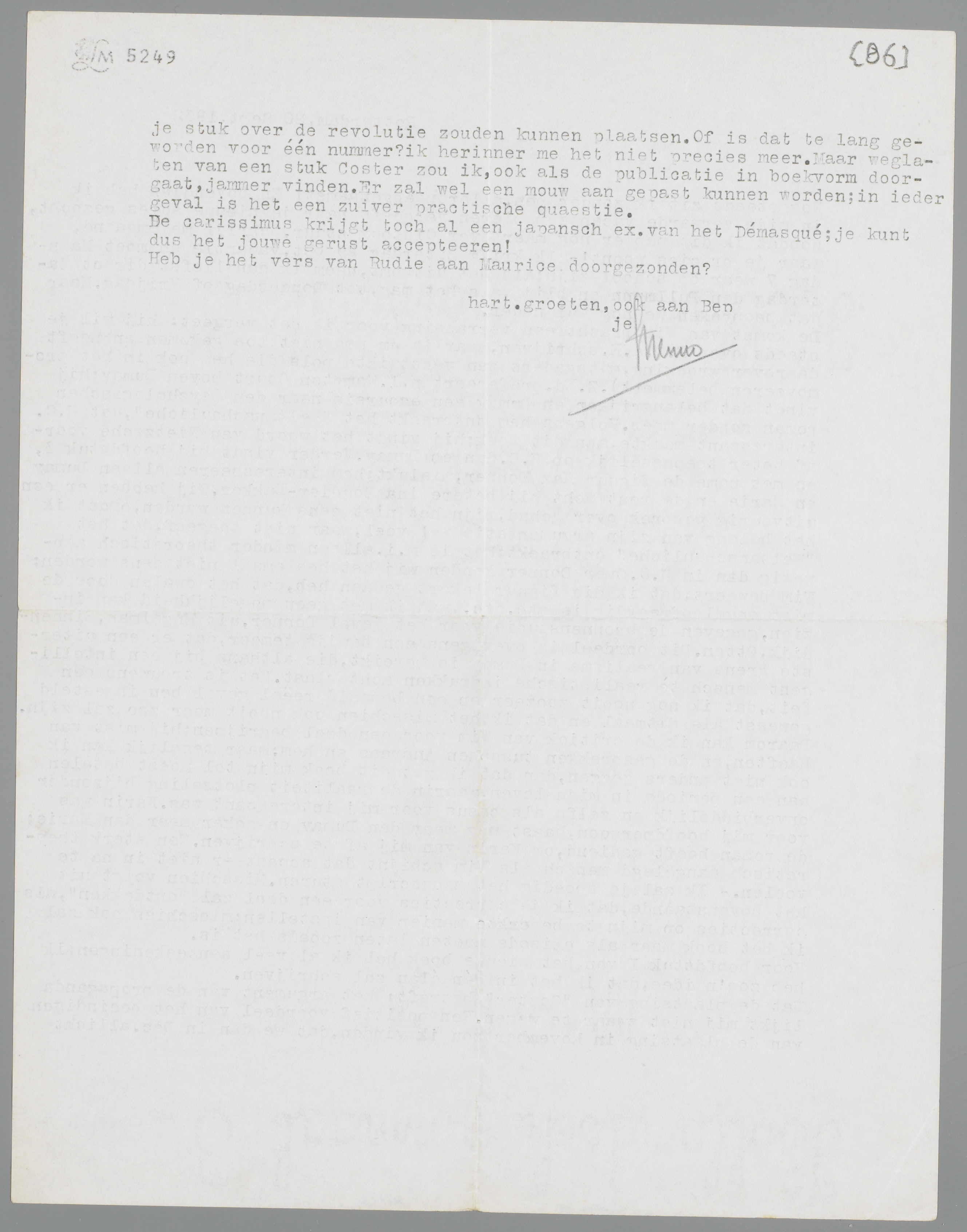 Wat de plaatsing van Coster betreft: het argument van de propaganda lijkt mij niet zwaar te wegen. Een positief voordeel van het beëindigen van de plaatsing in November zou ik vinden, dat we dan in Dec. allicht je stuk over de revolutie zouden kunnen plaatsen. Of is dat te lang geworden voor één nummer? ik herinner me het niet precies meer. Maar weglaten van een stuk Coster zou ik, ook als de publicatie in boekvorm doorgaat, jammer vinden. Er zal wel een mouw aan gepast kunnen worden; in ieder geval is het een zuiver practische quaestie.
