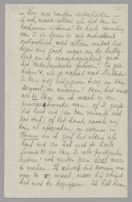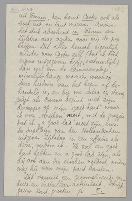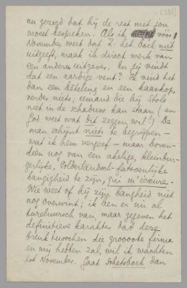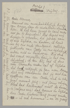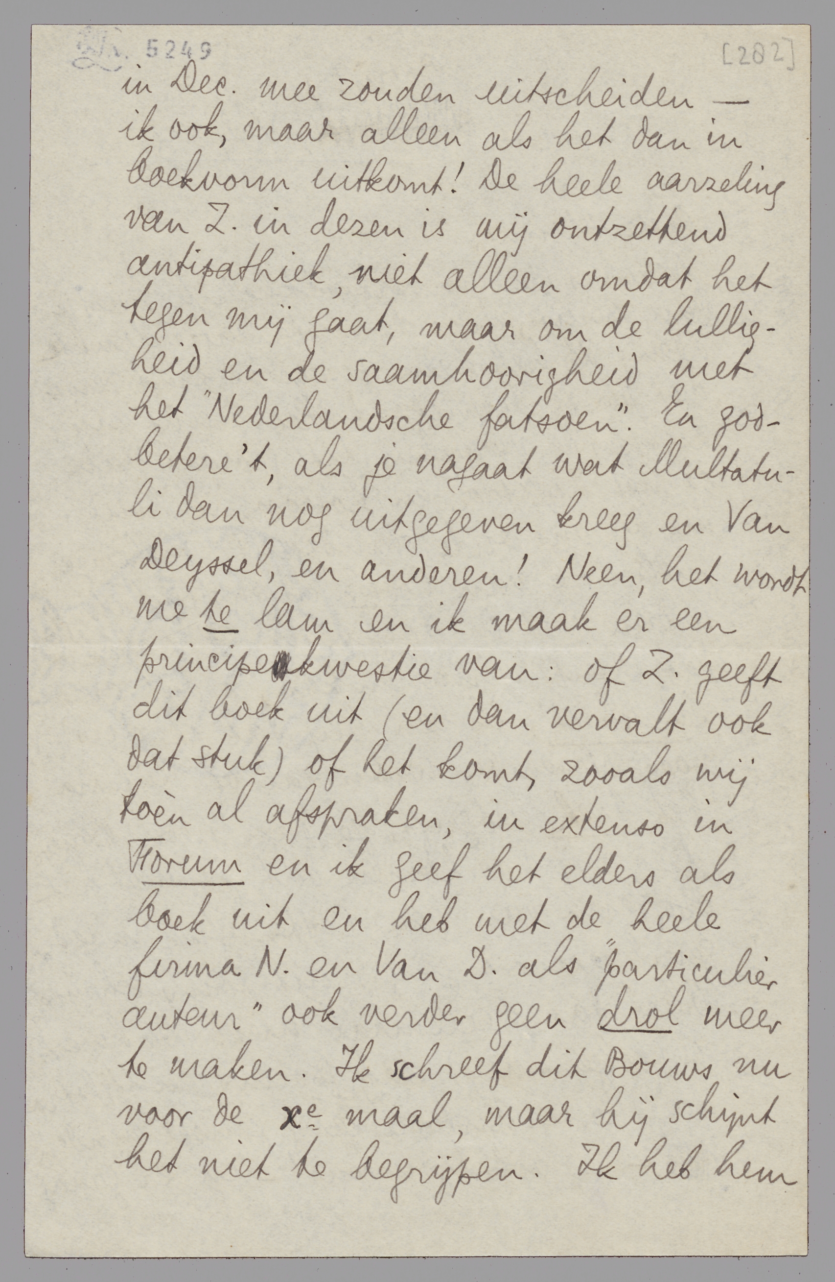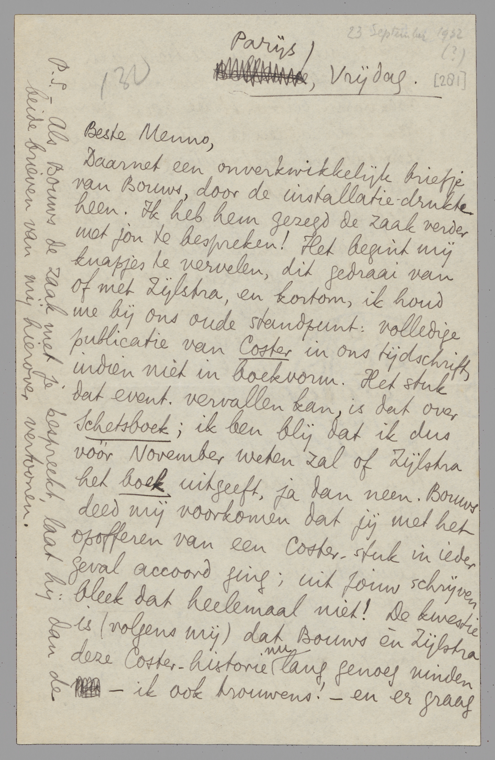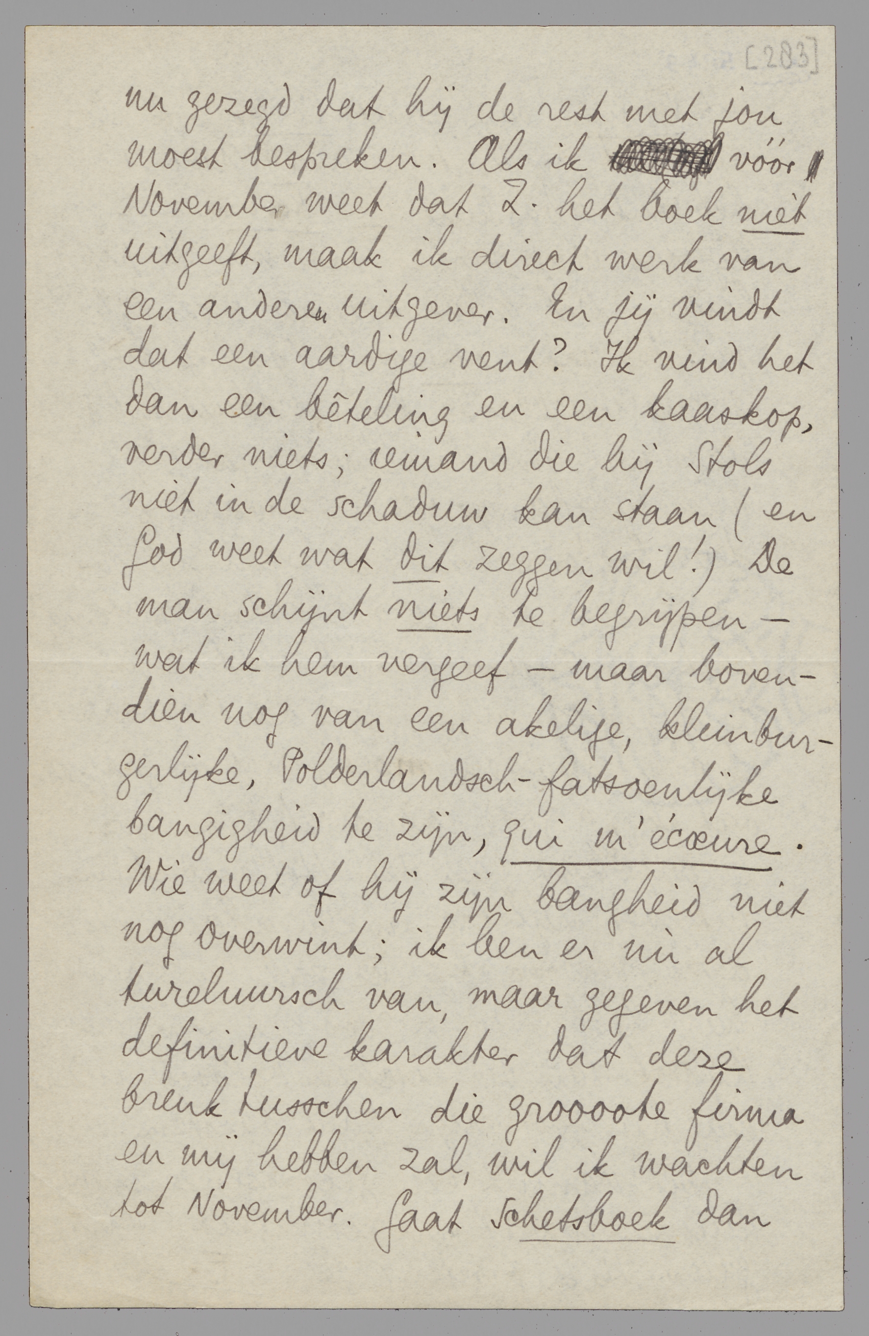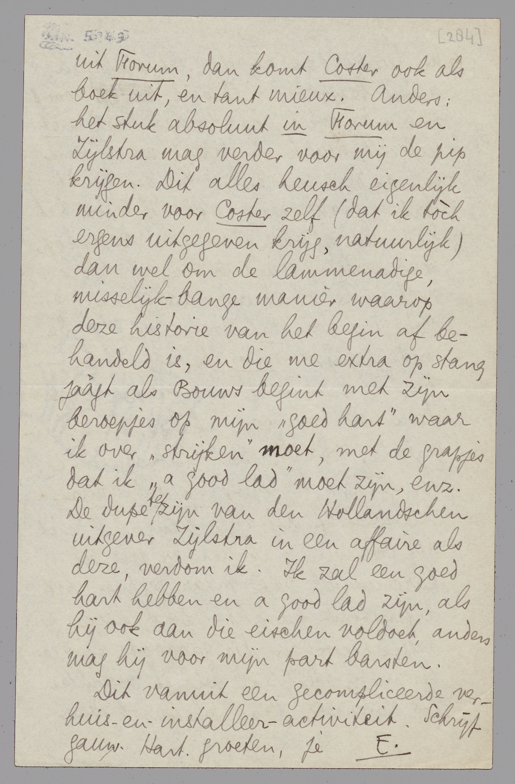Daarnet een onverkwikkelijk briefje van Bouws, door de installatie-drukte heen. Ik heb hem gezegd de zaak verder met jou te bespreken! Het begint mij knapjes te vervelen, dit gedraai van of met Zijlstra, en kortom, ik houd me bij ons oude standpunt: volledige publicatie van Coster in ons tijdschrift, indien niet in boekvorm. Het stuk dat event. vervallen kan, is dat over Schetsboek; ik ben blij dat ik dus vóór November weten zal of Zijlstra het boek uitgeeft, ja dan neen. Bouws deed mij voorkomen dat jij met het opofferen van een Coster-stuk in ieder geval accoord ging; uit jouw schrijven bleek dat heelemaal niet! De kwestie is (volgens mij) dat Bouws èn Zijlstra deze Coster-historie nu lang genoeg vinden - ik ook trouwens! - en er graag in Dec. mee zouden uitscheiden - ik ook, maar alleen als het dan in boekvorm uitkomt! De heele aarzeling van Z. in dezen is mij ontzettend antipathiek, niet alleen omdat het tegen mij gaat, maar om de lulligheid en de saamhoorigheid met het ‘Nederlandsche fatsoen’. En godbetere 't, als je nagaat wat Multatuli dan nog uitgegeven kreeg en Van Deyssel, en anderen! Neen, het wordt me te lam en ik maak er een principekwestie van: of Z. geeft dit boek uit (en dan vervalt ook dat stuk) of het komt, zooals wij toèn al afspraken, in extenso in Forum en ik geef het elders als boek uit en heb met de heele firma N. en Van D. als ‘particulier auteur’ ook verder geen drol meer te maken. Ik schreef dit Bouws nu voor de xe maal, maar hij schijnt het niet te begrijpen. Ik heb hem nu gezegd dat hij de rest met jou moest bespreken. Als ik vóór 1 November weet dat Z. het boek niet uitgeeft, maak ik direct werk van een anderen uitgever. En jij vindt dat een aardige vent? Ik vind het dan een bêteling en een kaaskop, verder niets; iemand die bij Stols niet in de schaduw kan staan (en God weet wat dit zeggen wil!) De man schijnt niets te begrijpen - wat ik hem vergeef - maar bovendien nog van een akelige, kleinburgerlijke, Polderlandsch-fatsoenlijke bangigheid te zijn, qui m'écoeure. Wie weet of hij zijn bangheid niet nog overwint; ik ben er nù al tureluursch van, maar gegeven het definitieve karakter dat deze breuk tusschen die groooote firma en mij hebben zal, wil ik wachten tot November. Gaat Schetsboek dan uit Forum, dan komt Coster ook als boek uit, en tant mieux. Anders: het stuk absoluut in Forum en Zijlstra mag verder voor mij de pip krijgen. Dit alles heusch eigenlijk minder voor Coster zelf (dat ik tòch ergens uitgegeven krijg, natuurlijk) dan wel om de lammenadige, misselijk-bange manier waarop deze historie van het begin af behandeld is, en die me extra op stang jaagt als Bouws begint met zijn beroepjes op mijn ‘goed hart’ waar ik over ‘strijken’ moet, met de grapjes dat ik ‘a good lad’ moet zijn, enz. De dupe te zijn van den Hollandschen uitgever Zijlstra in een affaire als deze, verdom ik. Ik zal een goed hart hebben en a good lad zijn, als hij ook aan die eischen voldoet, anders mag hij voor mijn part barsten.