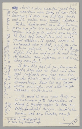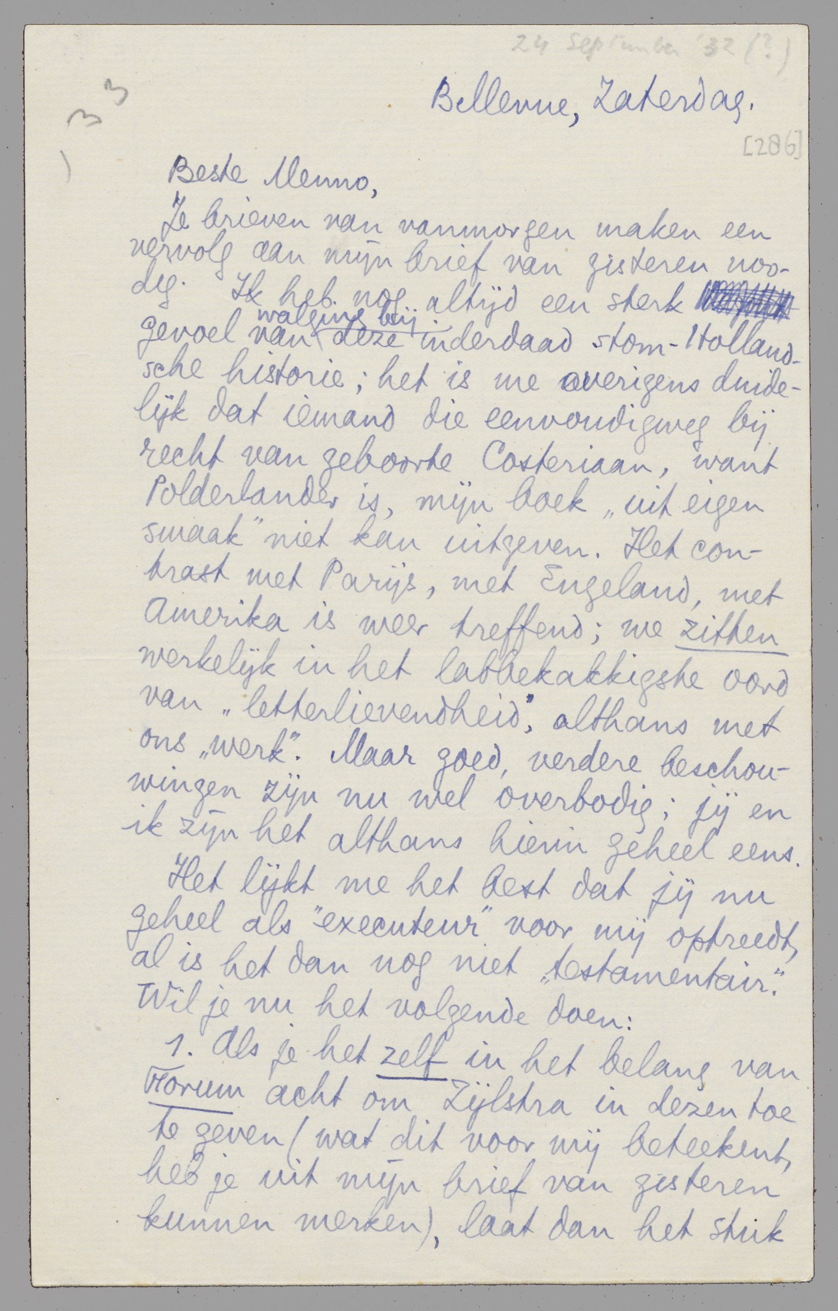 Je brieven van vanmorgen maken een vervolg aan mijn brief van gisteren noodig. Ik heb nog altijd een sterk gevoel van walging bij deze inderdaad stom-Hollandsche historie; het is me overigens duidelijk dat iemand die eenvoudigweg bij recht van geboorte Costeriaan, want Polderlander is, mijn boek ‘uit eigen smaak’ niet kan uitgeven. Het contrast met Parijs, met Engeland, met Amerika is weer treffend; we zitten werkelijk in het labbekakkigste oord van ‘letterlievendheid’, althans met ons ‘werk’. Maar goed, verdere beschouwingen zijn nu wel overbodig; jij en ik zijn het althans hierin geheel eens.