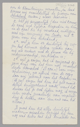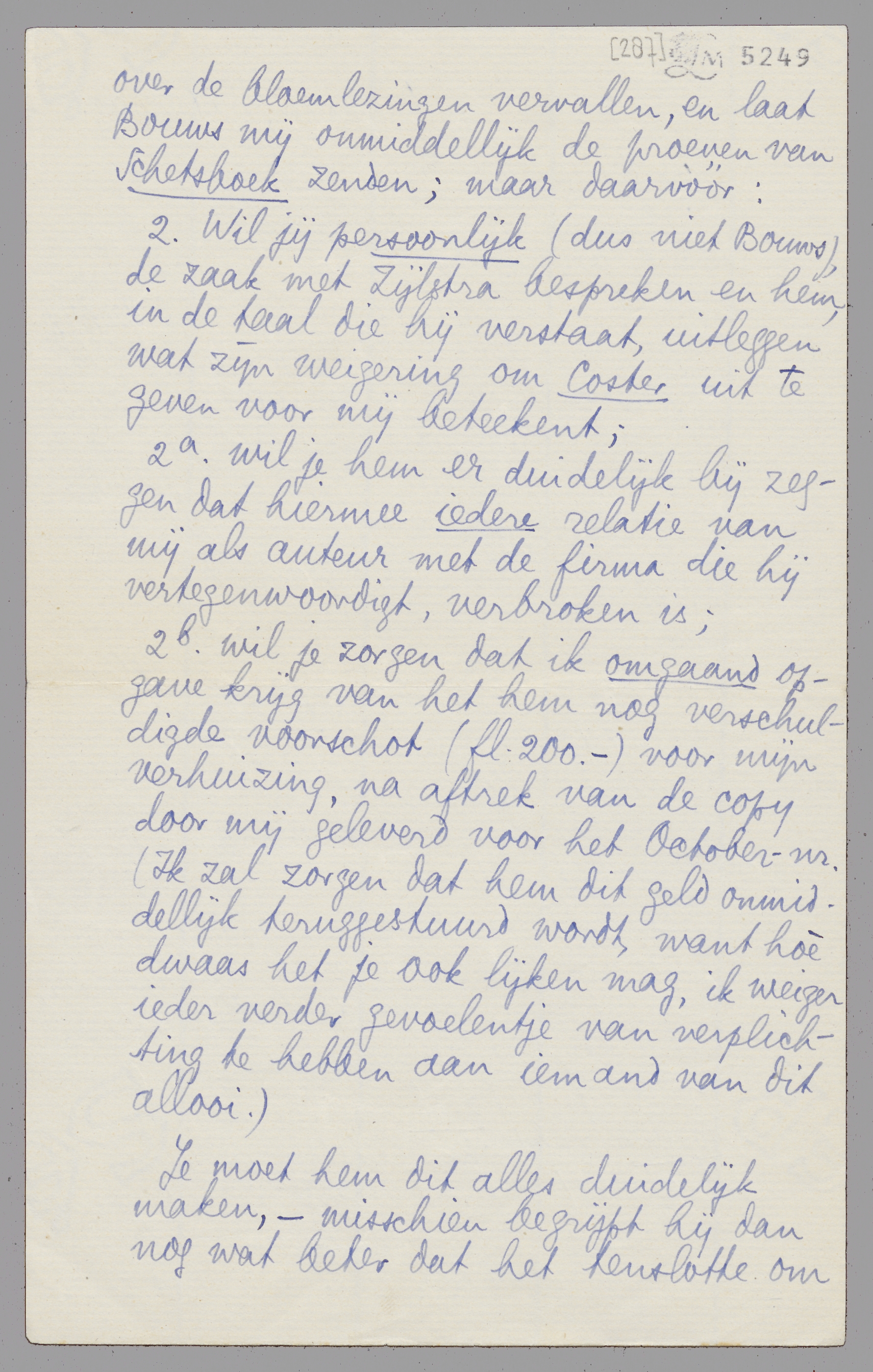 2b. wil je zorgen dat ik omgaand opgave krijg van het hem nog verschuldigde voorschot (fl. 200.-) voor mijn verhuizing, na aftrek van de copy door mij geleverd voor het October-nr. (Ik zal zorgen dat hem dit geld onmiddellijk teruggestuurd wordt, want hoè dwaas het je ook lijken mag, ik weiger ieder verder gevoelentje van verplichting te hebben aan iemand van dit allooi.) Je moet hem dit alles duidelijk maken, - misschien begrijpt hij dan nog wat beter dat het tenslotte om ‘heele andere waarden’ gaat dan zijn voorkeur voor Coster of voor Alie Smeding; ik voor mij heb dan verder met den goeden man totaal afgedaan.
