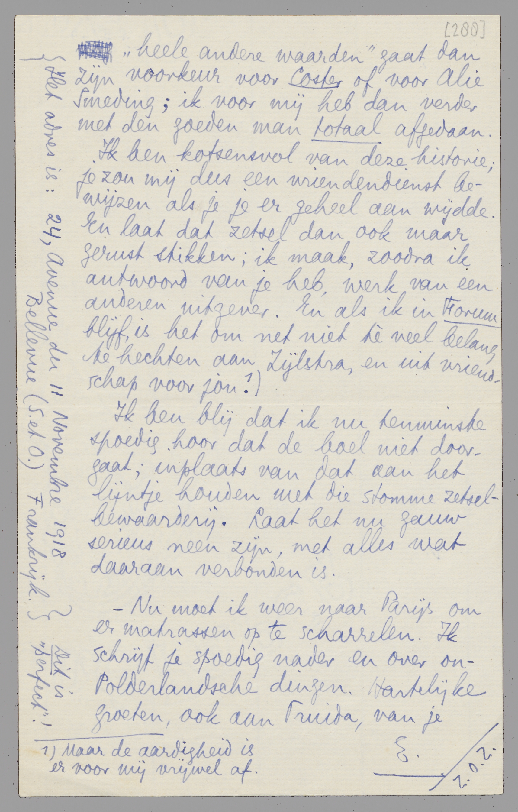 - Nu moet ik weer naar Parijs om er matrassen op te scharrelen. Ik schrijf je spoedig nader en over on-Polderlandsche dingen. Hartelijke groeten, ook aan Truida, van je