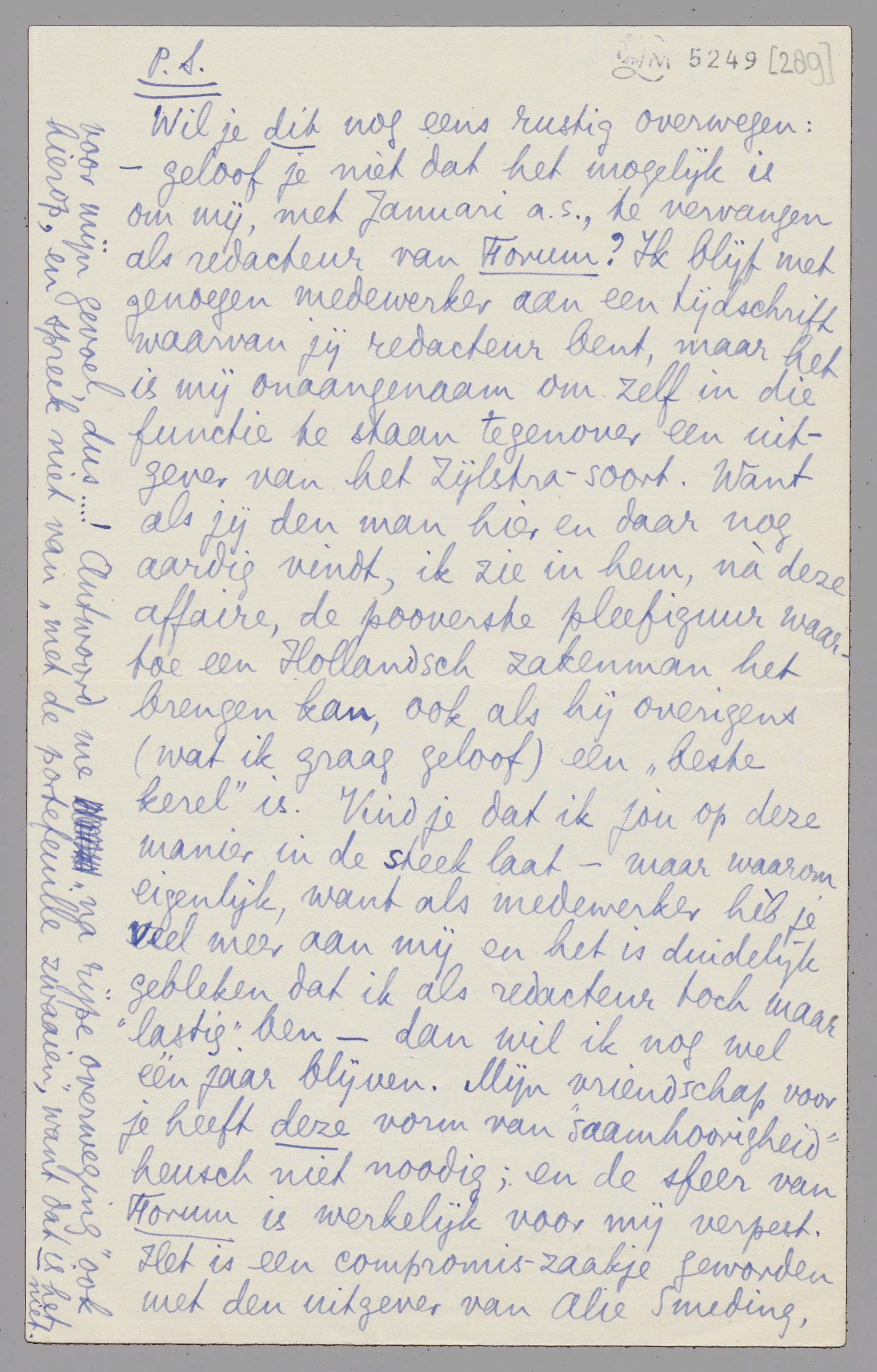 P.S. Wil je dit nog eens rustig overwegen: - geloof je niet dat het mogelijk is om mij, met Januari a.s., te vervangen als redacteur van Forum? Ik blijf met genoegen medewerker aan een tijdschrift waarvan jij redacteur bent, maar het is mij onaangenaam om zelf in die functie te staan tegenover een uitgever van het Zijlstra-soort. Want als jij den man hier en daar nog aardig vindt, ik zie in hem, nà deze affaire, de pooverste pleefiguur waartoe een Hollandsch zakenman het brengen kan, ook als hij overigens (wat ik graag geloof) een ‘beste kerel’ is. Vind je dat ik jou op deze manier in de steek laat - maar waarom eigenlijk, want als medewerker heb je veel meer aan mij en het is duidelijk gebleken dat ik als redacteur toch maar ‘lastig’ ben - dan wil ik nog wel één jaar blijven. Mijn vriendschap voor je heeft deze vorm van ‘saamhoorigheid’ heusch niet noodig; en de sfeer van Forum is werkelijk voor mij verpest. Het is een compromis-zaakje geworden met den uitgever van Alie Smeding, voor mijn gevoel, dus...! Antwoord me ‘na rijpe overweging’ ook hierop, en spreek niet van ‘met de portefeuille zwaaien’, want dat is het niet.