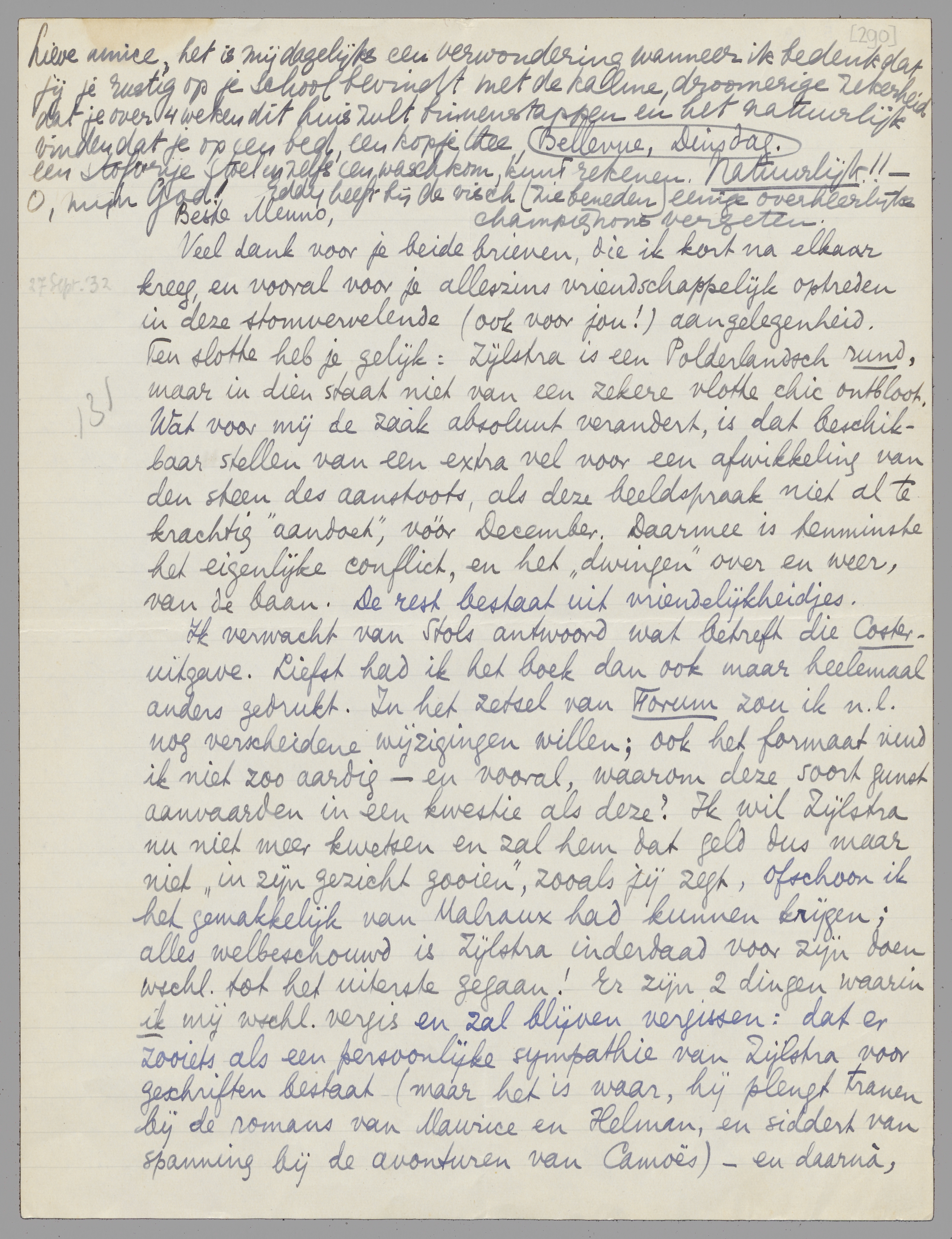 Ik verwacht van Stols antwoord wat betreft die Coster-uitgave. Liefst had ik het boek dan ook maar heelemaal anders gedrukt. In het zetsel van Forum zou ik n.l. nog verscheidene wijzigingen willen; ook het formaat vind ik niet zoo aardig - en vooral, waarom deze soort gunst aanvaarden in een kwestie als deze? Ik wil Zijlstra nu niet meer kwetsen en zal hem dat geld dus maar niet ‘in zijn gezicht gooien’, zooals jij zegt, ofschoon ik het gemakkelijk van Malraux had kunnen krijgen; alles welbeschouwd is Zijlstra inderdaad voor zijn doen wschl. tot het uiterste gegaan! Er zijn 2 dingen waarin ik mij wschl. vergis en zal blijven vergissen: dat er zooiets als een persoonlijke sympathie van Zijlstra voor geschriften bestaat (maar het is waar, hij plengt tranen bij de romans van Maurice en Helman, en siddert van spanning bij de avonturen van Camoës) - en daarnà, dat er menschen bestaan die daarmee rekening moeten houden. Dat jij en ik zelfs onder deze laatsten behooren is het koddigste; in dit geval ben jij beklagenswaardiger dan ik, omdat voor mij tenminste het begin doorslaggevend is geweest. Maar hoe Dr. Menno ter Braak in zijn verdere literaire loopbaan dit gevoel zal behouden of verliezen, wordt een interessante kwestie op zichzelf.