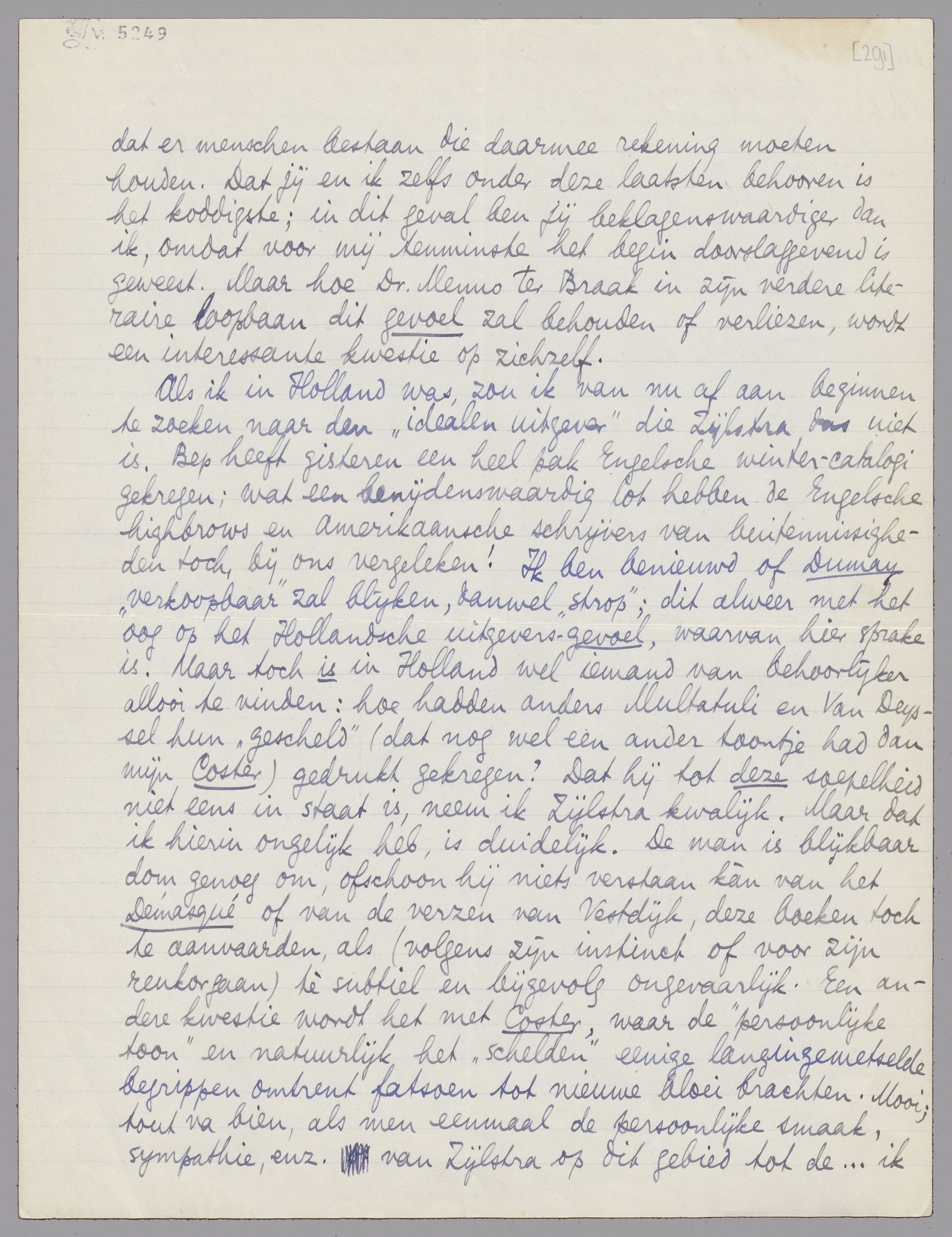 Als ik in Holland was, zou ik van nu af aan beginnen te zoeken naar den ‘idealen uitgever’ die Zijlstra dus niet is. Bep heeft gisteren een heel pak Engelsche winter-catalogi gekregen; wat een benijdenswaardig lot hebben de Engelsche highbrows en Amerikaansche schrijvers van buitennissigheden toch, bij ons vergeleken! Ik ben benieuwd of Dumay ‘verkoopbaar’ zal blijken, danwel ‘strop’; dit alweer met het oog op het Hollandsche uitgevers-gevoel, waarvan hier sprake is. Maar toch is in Holland wel iemand van behoorlijker allooi te vinden: hoe hadden anders Multatuli en Van Deyssel hun ‘gescheld’ (dat nog wel een ander toontje had dan mijn Coster) gedrukt gekregen? Dat hij tot deze soepelheid niet eens in staat is, neem ik Zijlstra kwalijk. Maar dat ik hierin ongelijk heb, is duidelijk. De man is blijkbaar dom genoeg om, ofschoon hij niets verstaan kàn van het Démasqué of van de verzen van Vestdijk, deze boeken toch te aanvaarden, als (volgens zijn instinct of voor zijn reukorgaan) tè subtiel en bijgevolg ongevaarlijk. Een andere kwestie wordt het met Coster, waar de ‘persoonlijke toon’ en natuurlijk het ‘schelden’ eenige langingemetselde begrippen omtrent fatsoen tot nieuwe bloei brachten. Mooi; tout va bien, als men eenmaal de persoonlijke smaak, sympathie, enz. van Zijlstra op dit gebied tot de... ik had haast geschreven: waarheden, maar laat ons niet te ver gaan, laat ons zeggen: tot de ‘aanvaardbare’ mythen en illuzies rekent.