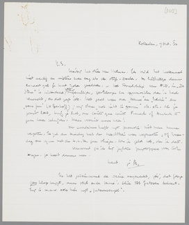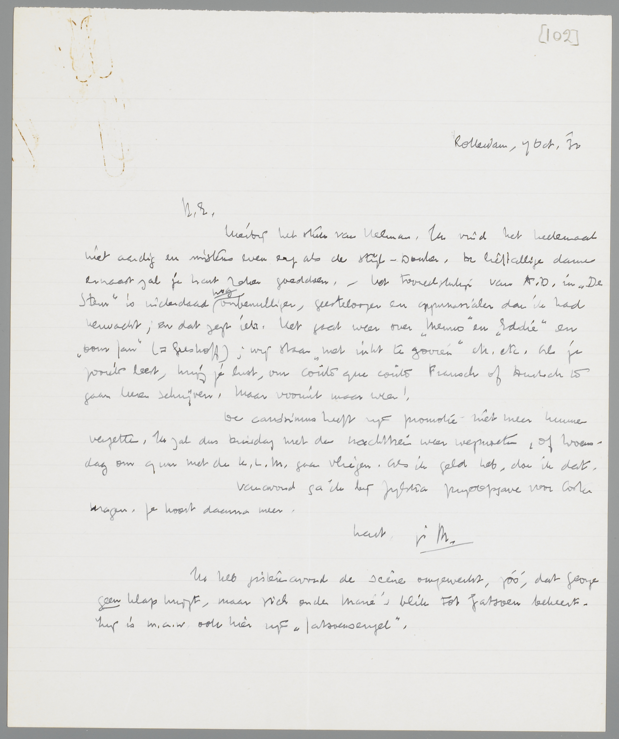 Hierbij het stuk van Helman. Ik vind het heelemaal niet aardig en minstens even erg als de stijl-Donker. De lieftallige dame ernaast zal je hart zeker goeddoen. - Het tooneelstukje van A.D. in De Stem is inderdaad nog onbenulliger, geesteloozer en gymnasialer dan ik had verwacht; en dat zegt iets. Het gaat weer over ‘Menno’ en ‘Eddie’ en ‘oom Jan’ (= Greshoff); wij staan ‘met inkt te gooien’ etc. etc. Als je zooiets leest, krijg je lust, om coûte que coûte Fransch of Duitsch te gaan leeren schrijven. Maar vooruit maar weer!