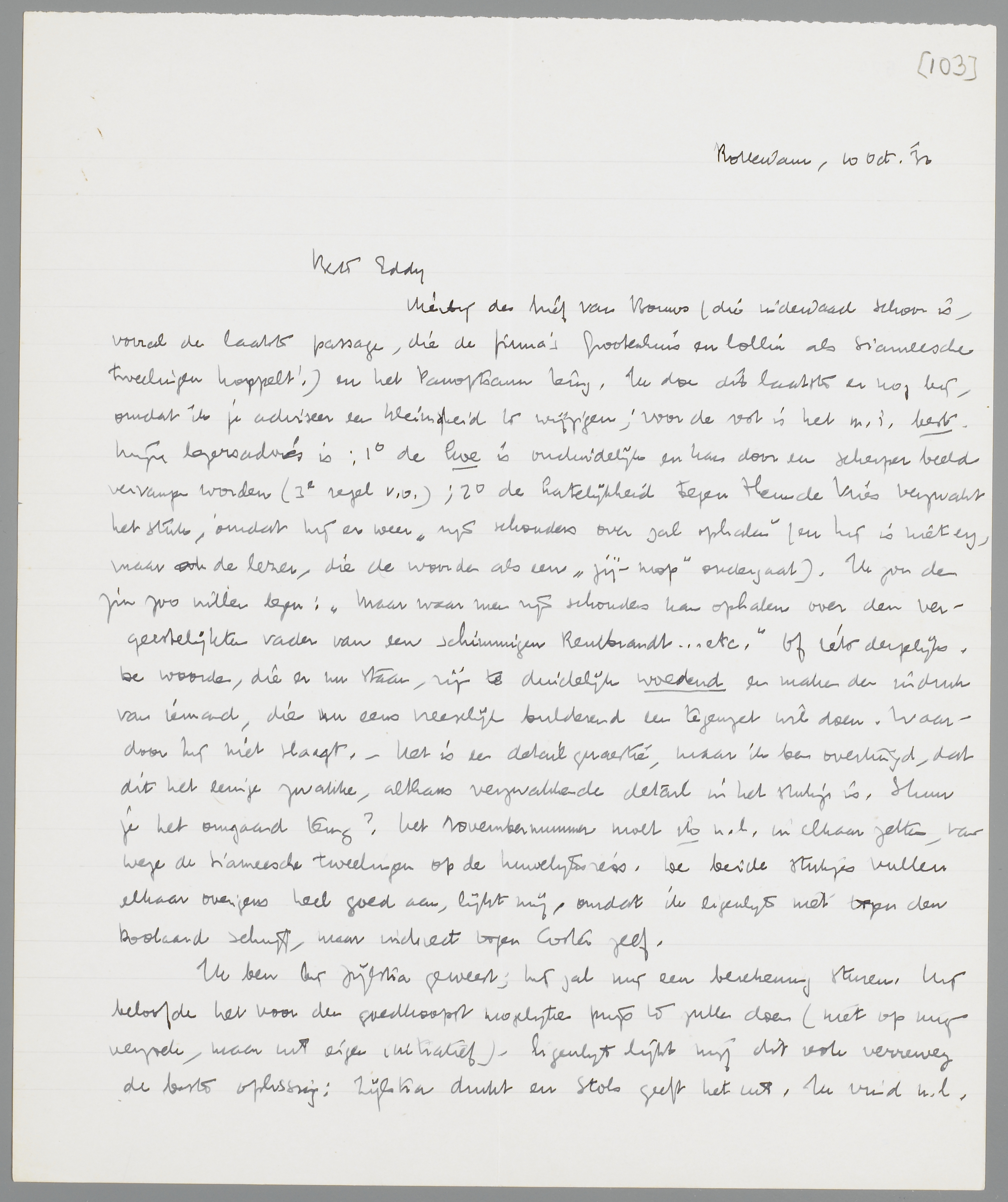 Hierbij den brief van Bouws (die inderdaad schoon is, vooral de laatste passage, die de firma's Grootenhuis en Collin als Siameesche tweelingen koppelt!) en het Panopticum terug. Ik doe dit laatste er nog bij, omdat ik je adviseer een kleinigheid te wijzigen; voor de rest is het m.i. best. Mijn lezersadvies is: 1o de koe is onduidelijk en kan door een scherper beeld vervangen worden (3e regel v.o.); 2o de hatelijkheid tegen Theun de Vries verzwakt het stuk, omdat hij er weer ‘zijn schouders over zal ophalen’ (en hij is niet erg, maar ook de lezer, die de woorden als een ‘jij-mop’ ondergaat). Ik zou den zin zoo willen lezen: ‘Maar waar men zijn schouders kan ophalen over den vergeestelijkten vader van een schimmigen Rembrandt... etc.’ Of iets dergelijks. De woorden, die er nu staan, zijn te duidelijk woedend en maken den indruk van iemand, die nu eens vreeselijk bulderend een tegenzet wil doen. Waardoor hij niet slaagt. - Het is een detailquaestie, maar ik ben overtuigd, dat dit het eenige zwakke, althans verzwakkende detail in het stukje is. Stuur je het omgaand terug? Het November-nummer moet ik n.l. in elkaar zetten, vanwege de Siameesche tweelingen op de huwelijksreis. De beide stukjes vullen elkaar overigens heel goed aan, lijkt mij, omdat ik eigenlijk niet tegen den Doolaard schrijf, maar indirect tegen Coster zelf.
