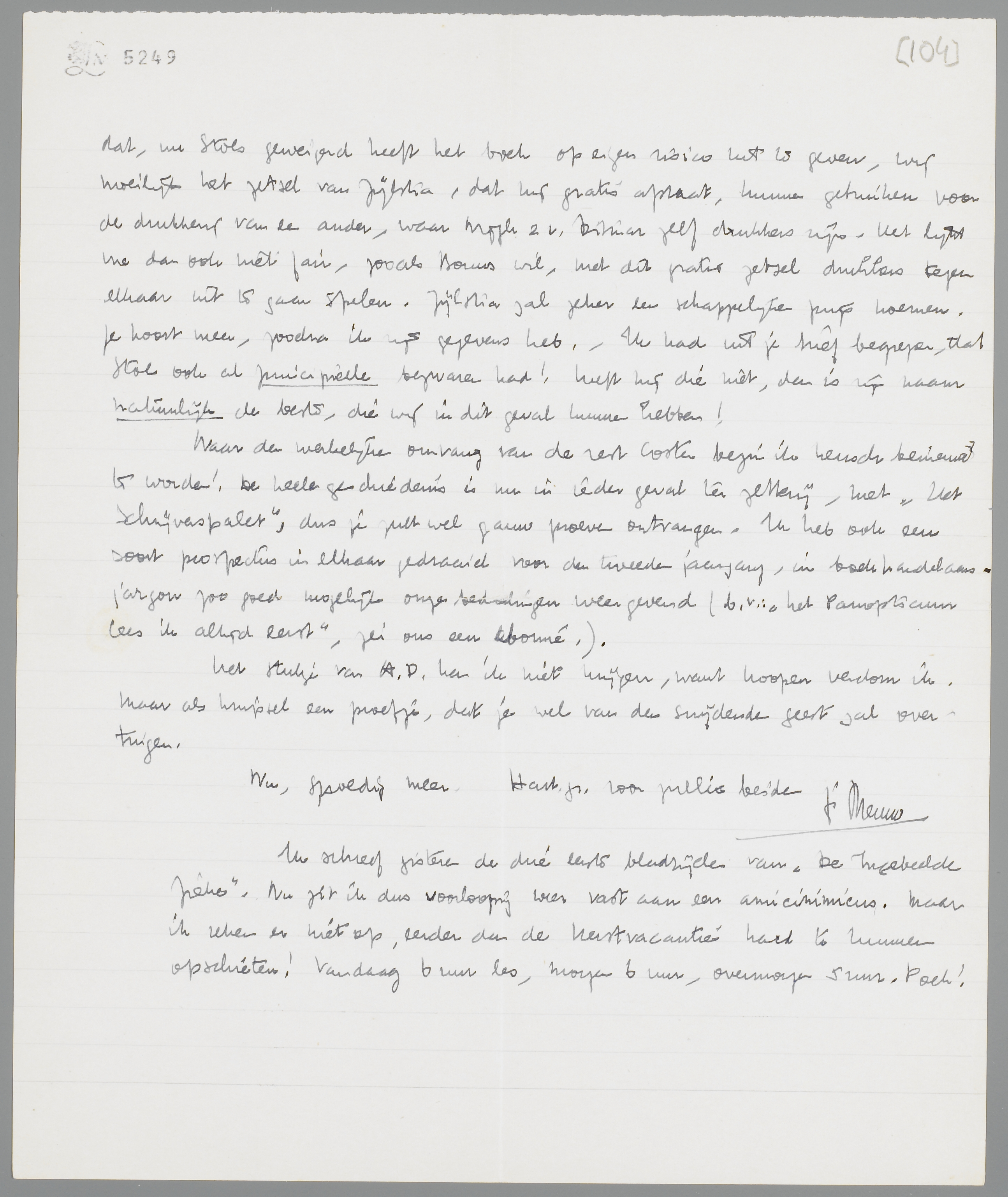 Ik ben bij Zijlstra geweest; hij zal mij een berekening sturen. Hij beloofde het voor den goedkoopst mogelijken prijs te zullen doen (niet op mijn verzoek, maar uit eigen initiatief). Eigenlijk lijkt mij dit ook verreweg de beste oplossing: Zijlstra drukt en Stols geeft het uit. Ik vind n.l. dat, nu Stols geweigerd heeft het boek op eigen risico uit te geven, wij moeilijk het zetsel van Zijlstra, dat hij gratis afstaat, kunnen gebruiken voor de drukkerij van een ander, waar Nijgh & v. Ditmar zelf drukkers zijn. Het lijkt me dan ook niet fair, zooals Bouws wil, met dit gratis zetsel drukkers tegen elkaar uit te gaan spelen. Zijlstra zal zeker een schappelijken prijs noemen. Je hoort meer, zoodra ik zijn gegevens heb. - Ik had uit je brief begrepen, dat Stols ook al principieele bezwaren had! Heeft hij die niet, dan is zijn naam natuurlijk de beste, die wij in dit geval kunnen hebben!