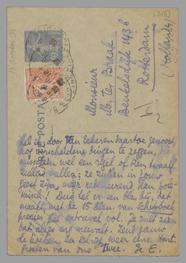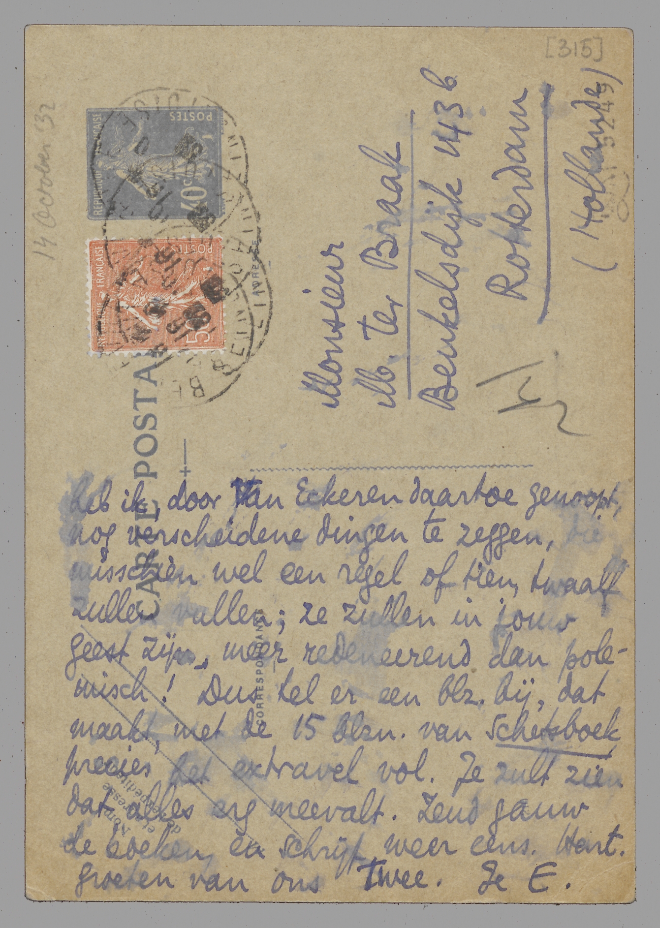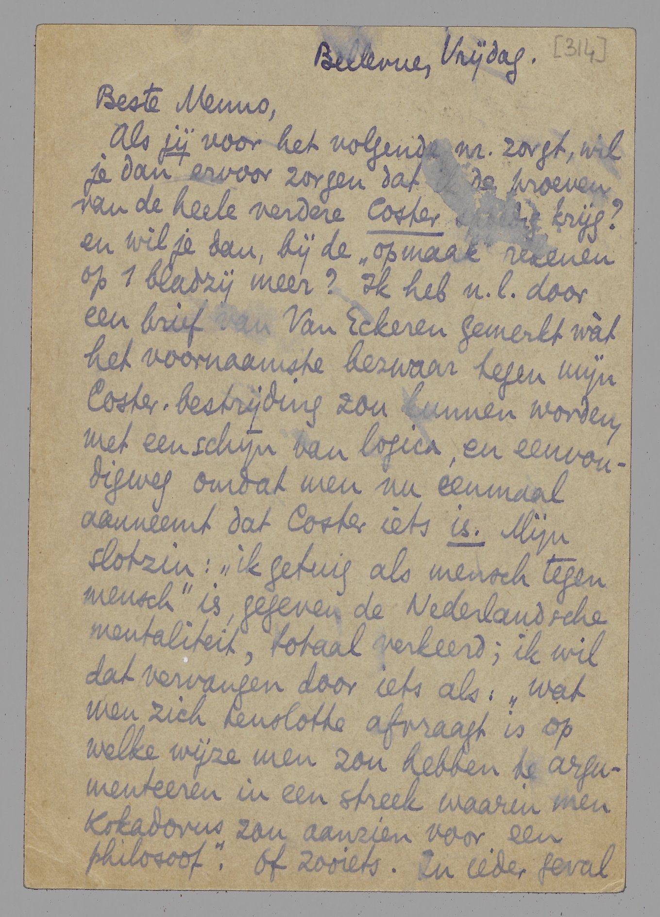 Als jij voor het volgende nr. zorgt, wil je dan ervoor zorgen dat ik de proeven van de heele verdere Coster spoedig krijg? en wil je dan, bij de ‘opmaak’ rekenen op 1 bladzij meer? Ik heb n.l. door een brief van Van Eckeren gemerkt wàt het voornaamste bezwaar tegen mijn Coster-bestrijding zou kunnen worden, met een schijn van logica, en eenvoudigweg omdat men nu eenmaal aanneemt dat Coster iets is. Mijn slotzin: ‘ik getuig als mensch tegen mensch’ is, gegeven de Nederlandsche mentaliteit, totaal verkeerd; ik wil dat vervangen door iets als: ‘wat men zich tenslotte afvraagt is op welke wijze men zou hebben te argumenteeren in een streek waarin men Kokadorus zou aanzien voor een philosoof’. Of zooiets. In ieder geval heb ik, door Van Eckeren daartoe genoopt, nog verscheidene dingen te zeggen, die misschien wel een regel of tien, twaalf zullen vullen; ze zullen in jouw geest zijn, meer redeneerend dan polemisch! Dus tel er een blz. bij, dat maakt, met de 15 blzn. van Schetsboek precies het extra vel vol. Je zult zien dat alles erg meevalt. Zend gauw de boeken en schrijf weer eens. Hart. groeten van ons Twee. Je