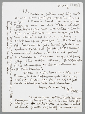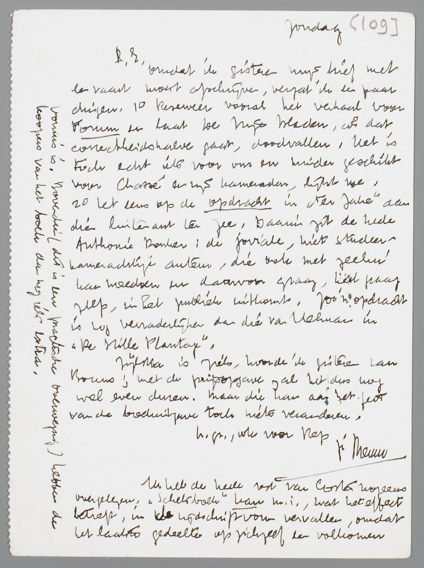 Omdat ik gisteren mijn brief met een vaart moest afschrijven, vergat ik een paar dingen. 1 Reserveer vooral het verhaal voor Forum en laat De Vrije Bladen, als dat correctheidshalve gaat, doodvallen. Het is toch echt iets voor ons en minder geschikt voor Chassé en zijn kameraden, lijkt me. 2o let eens op de opdracht in Ter Zake aan dien luitenant ter zee. Daarin zit de heele Anthonie Donker: de joviale, niet studeerkamerachtige auteur, die ook met zeelui kan meedoen en daarvoor graag, heel graag zelfs, in het publiek uitkomt. Zoo'n opdracht is nog verraderlijker dan die van Helman in De Stille Plantage.
