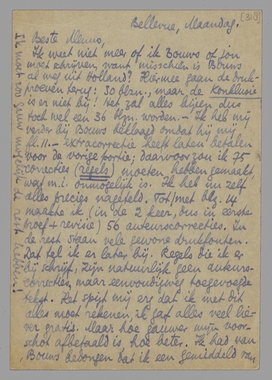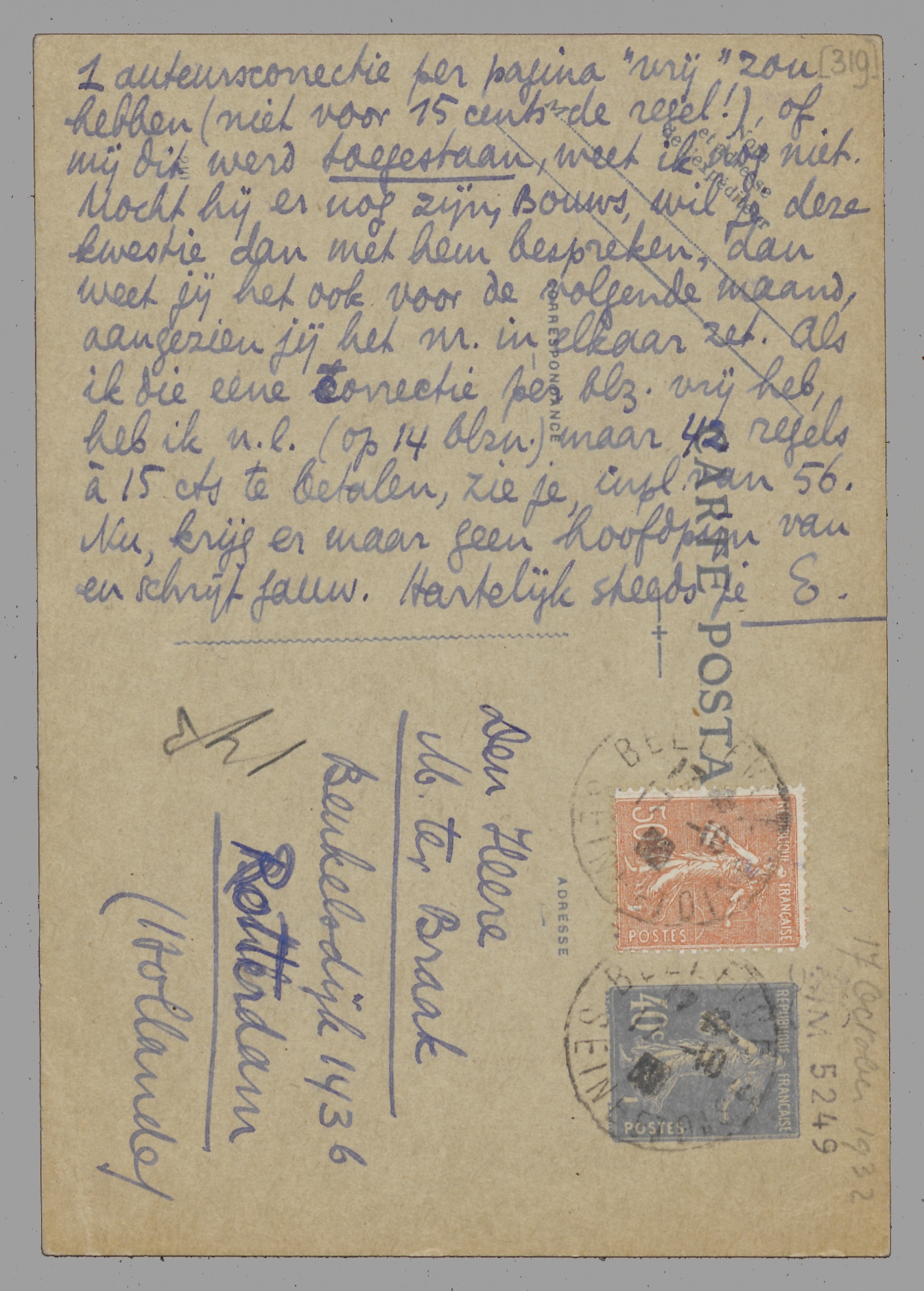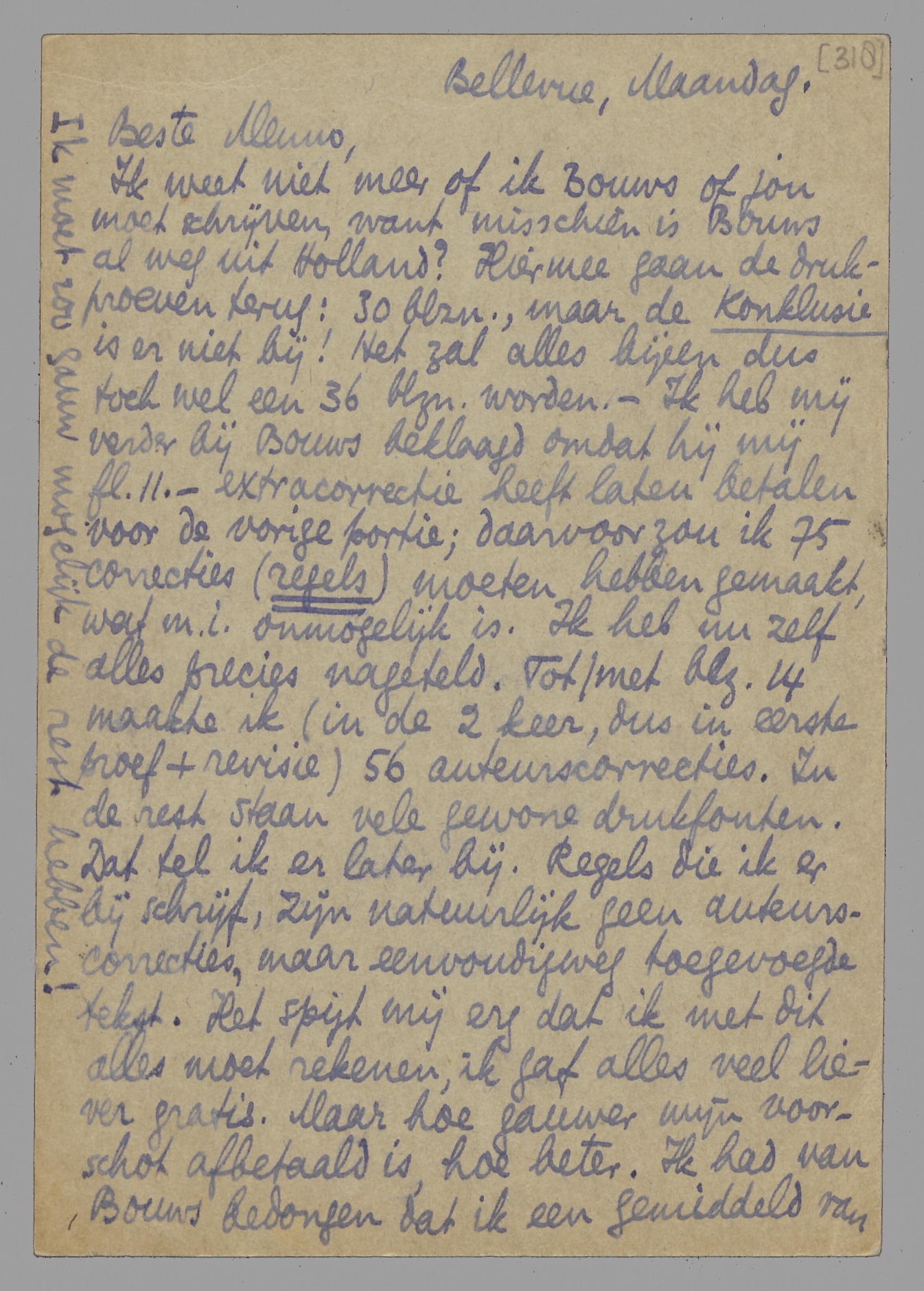 Ik weet niet meer of ik Bouws of jou moet schrijven, want misschien is Bouws al weg uit Holland? Hiermee gaan de drukproeven terug: 30 blzn., maar de Konklusie is er niet bij! Het zal alles bijeen dus toch wel een 36 blzn. worden. - Ik heb mij verder bij Bouws beklaagd omdat hij mij ƒ 11.- extracorrectie heeft laten betalen voor de vorige portie; daarvoor zou ik 75 correcties (regels) moeten hebben gemaakt, wat m.i. onmogelijk is. Ik heb nu zelf alles precies nageteld. Tot/met blz. 14 maakte ik (in de 2 keer, dus in eerste proef + revisie) 56 auteurscorrecties. In de rest staan vele gewone drukfouten. Dat tel ik er later bij. Regels die ik er bij schrijf, zijn natuurlijk geen auteurscorrecties, maar eenvoudigweg toegevoegde tekst. Het spijt mij erg dat ik met dit alles moet rekenen, ik gaf alles veel liever gratis. Maar hoe gauwer mijn voorschot afbetaald is, hoe beter. Ik had van Bouws bedongen dat ik een gemiddeld van 1 auteurscorrectie per pagina ‘vrij’ zou hebben (niet voor 15 cents de regel!), of mij dit werd toegestaan, weet ik nog niet. Mocht hij er nog zijn, Bouws, wil je deze kwestie dan met hem bespreken, dan weet jij het ook voor de volgende maand, aangezien jij het nr. in elkaar zet. Als ik die eene correctie per blz. vrij heb, heb ik n.l. (op 14 blzn.) maar 42 regels à 15 cts te betalen, zie je, inpl. van 56. Nu, krijg er maar geen hoofdpijn van en schrijf gauw. Hartelijk steeds je