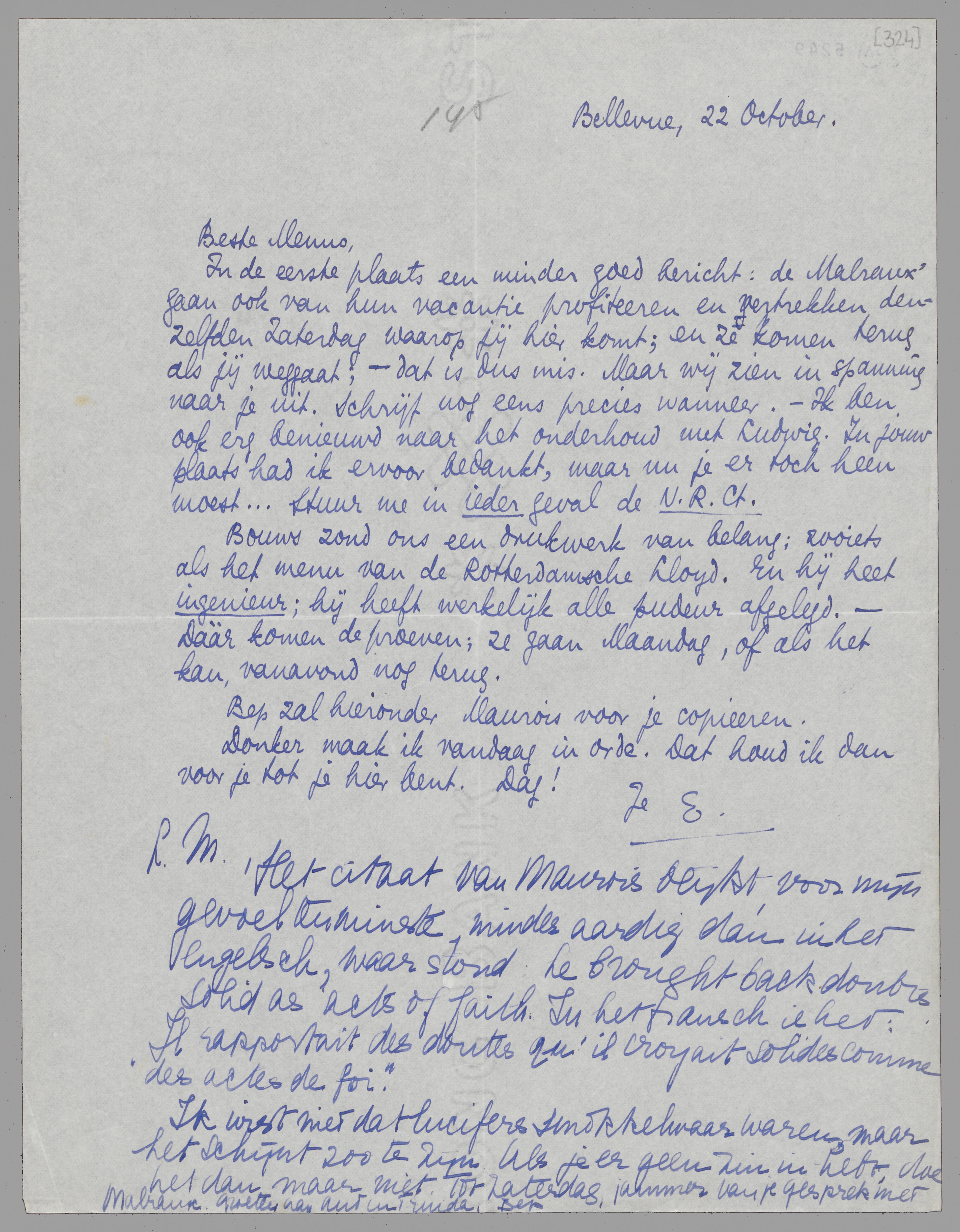 In de eerste plaats een minder goed bericht: de Malraux' gaan ook van hun vacantie profiteeren en vertrekken denzelfden Zaterdag waarop jij hier komt; en ze komen terug als jij weggaat; - dat is dus mis. Maar wij zien in spanning naar je uit. Schrijf nog eens precies wanneer. - Ik ben ook erg benieuwd naar het onderhoud met Ludwig. In jouw plaats had ik ervoor bedankt, maar nu je er toch heen moest... Stuur me in ieder geval de N.R.Ct.