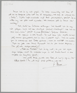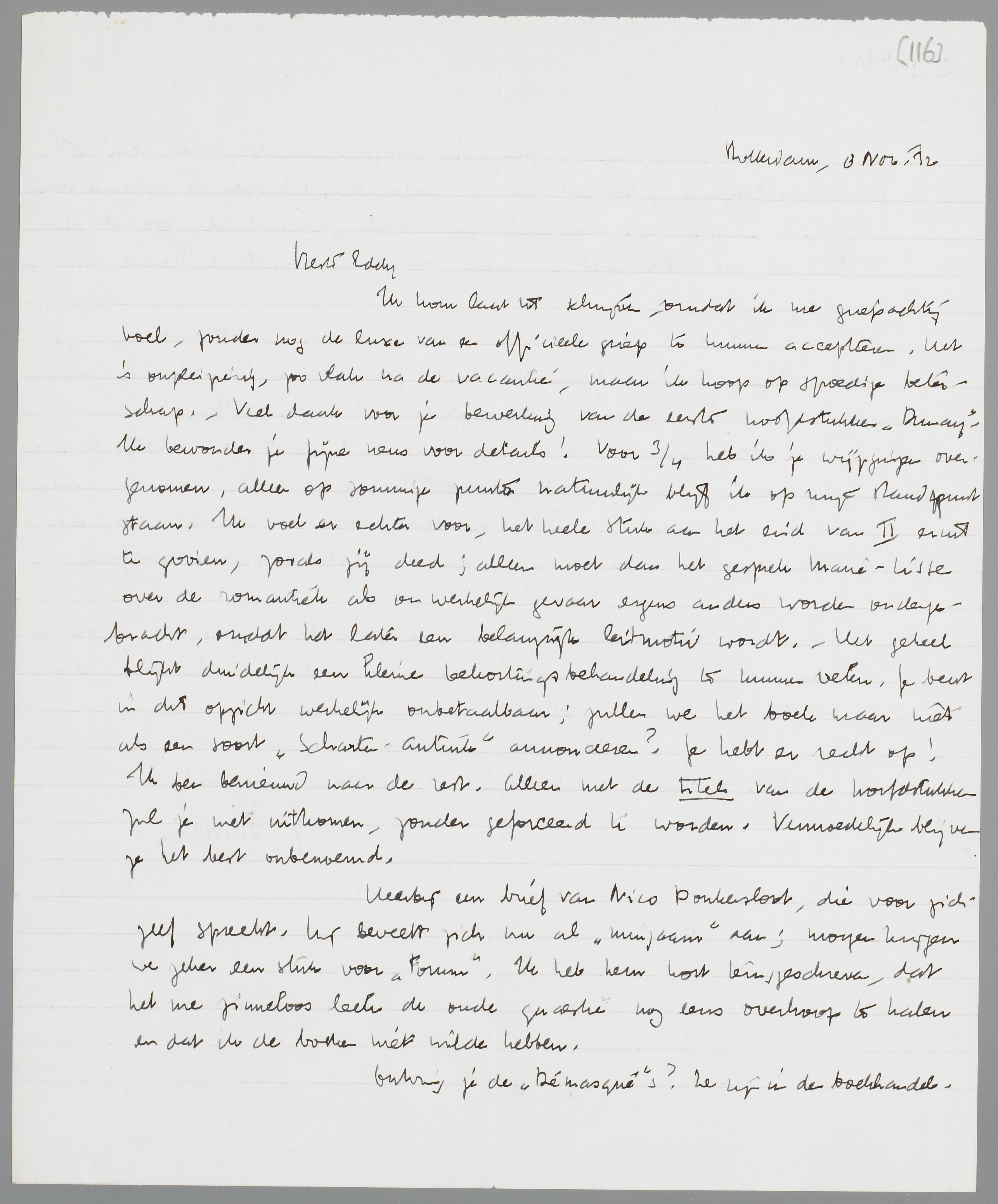 Ik kom laat tot schrijven, omdat ik me griepachtig voel, zonder nog de luxe van een officieele griep te kunnen accepteeren. Het is onpleizierig, zoo vlak na de vacantie, maar ik hoop op spoedige beterschap. - Veel dank voor je bewerking van de eerste hoofdstukken Dumay. Ik bewonder je fijne neus voor details! Voor ¾ heb ik je wijzigingen overgenomen, alleen op sommige punten natuurlijk blijf ik op mijn standpunt staan. Ik voel er echter voor, het heele stuk aan het eind van II eruit te gooien, zooals jij deed; alleen moet dan het gesprek Marie-Lisse over de romantiek als onwerkelijk gevaar ergens anders worden ondergebracht, omdat het later een belangrijk leitmotiv wordt. - Het geheel blijkt duidelijk een kleine bekortingsbehandeling te kunnen velen. Je bent in dit opzicht werkelijk onbetaalbaar; zullen we het boek maar niet als een soort ‘Scharten-Antink’ annonceeren? Je hebt er recht op! Ik ben benieuwd naar de rest. Alleen met de titels van de hoofdstukken zul je niet uitkomen, zonder geforceerd te worden. Vermoedelijk blijven ze het best onbenoemd.
