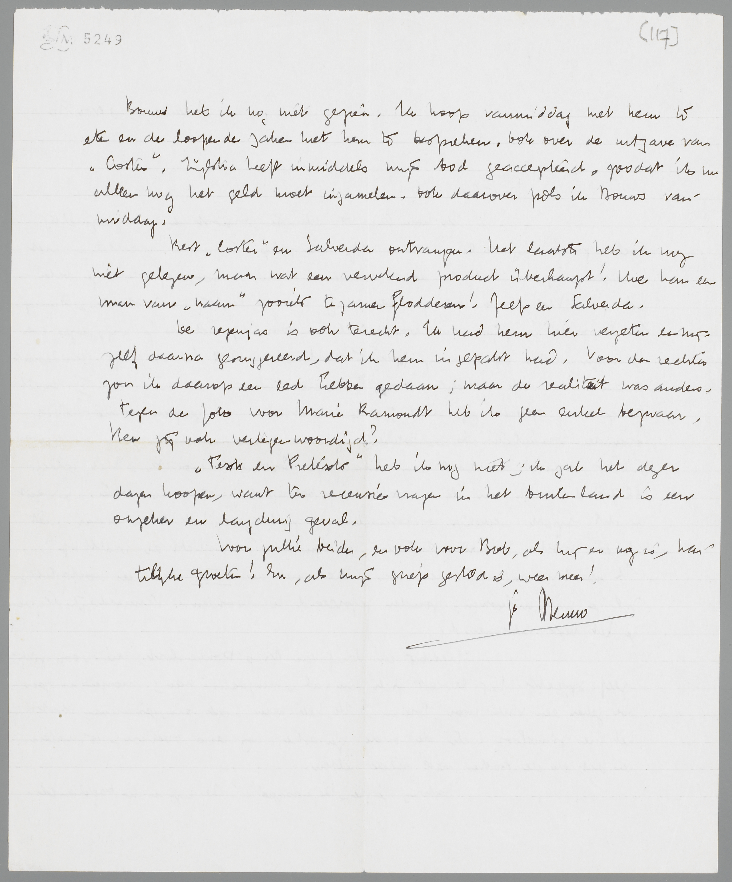 Hierbij een brief van Nico Donkersloot, die voor zichzelf spreekt. Hij beveelt zich nu al ‘minzaam’ aan; morgen krijgen we zeker een stuk voor Forum. Ik heb hem kort teruggeschreven, dat het me zinneloos leek de oude quaestie nog eens overhoop te halen en dat ik de boeken niet wilde hebben.