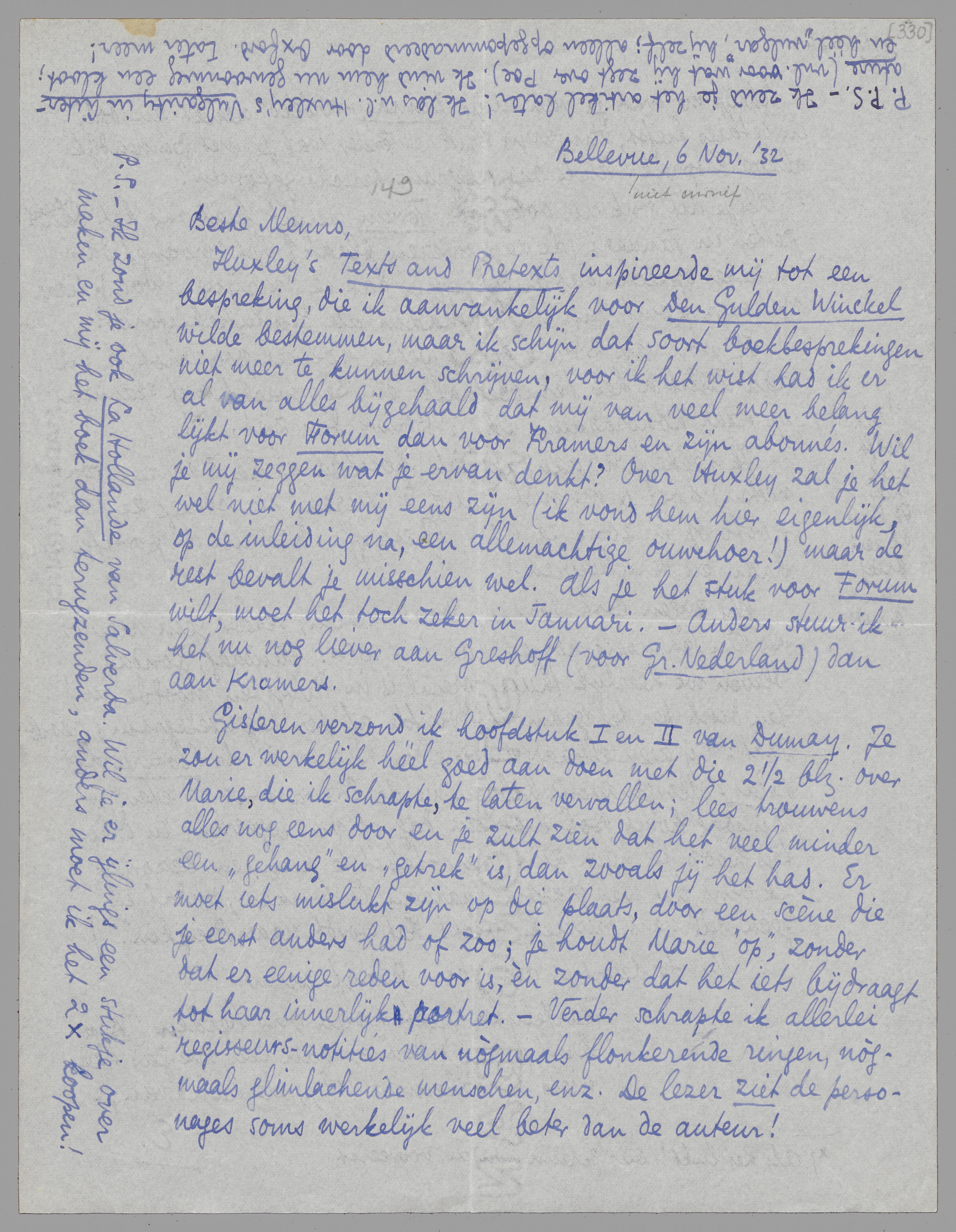 Huxley's Texts and Pretexts inspireerde mij tot een bespreking, die ik aanvankelijk voor Den Gulden Winckel wilde bestemmen, maar ik schijn dat soort boekbesprekingen niet meer te kunnen schrijven, voor ik het wist had ik er al van alles bijgehaald dat mij van veel meer belang lijkt voor Forum dan voor Kramers en zijn abonnés. Wil je mij zeggen wat je ervan denkt? Over Huxley zal je het wel niet met mij eens zijn (ik vond hem hier eigenlijk, op de inleiding na, een allemachtige ouwehoer!) maar de rest bevalt je misschien wel. Als je het stuk voor Forum wilt, moet het toch zeker in Januari. - Anders stuur ik het nu nog liever aan Greshoff (voor Gr. Nederland) dan aan Kramers.