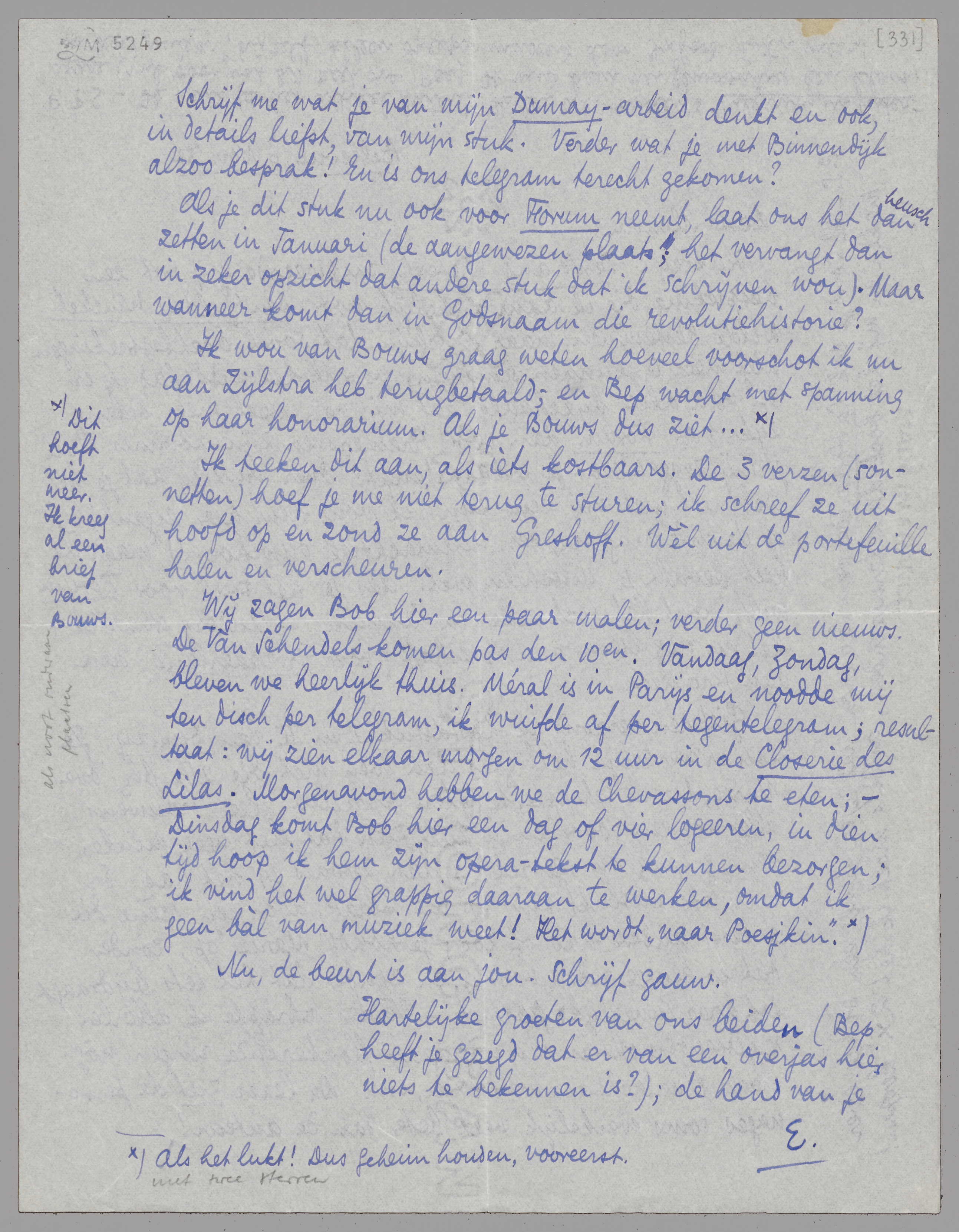 Schrijf me wat je van mijn Dumay-arbeid denkt en ook, in details liefst, van mijn stuk. Verder wat je met Binnendijk alzoo besprak! En is ons telegram terecht gekomen?