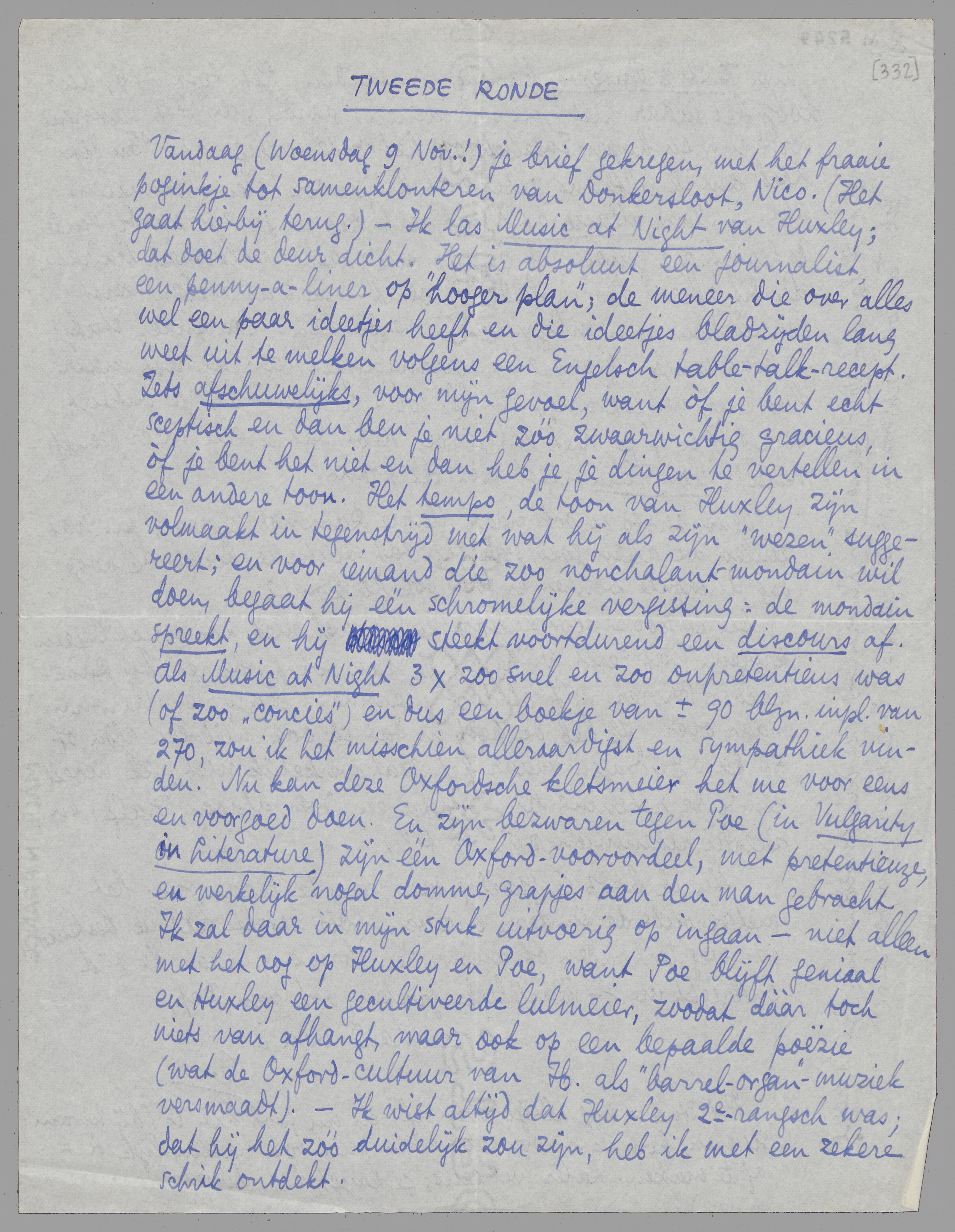 Vandaag (Woensdag 9 Nov.!) je brief gekregen, met het fraaie poginkje tot samenklonteren van Donkersloot, Nico. (Het gaat hierbij terug). - Ik las Music at Night van Huxley; dat doet de deur dicht. Het is absoluut een journalist, een penny-a-liner op ‘hooger plan’; de meneer die over alles wel een paar ideetjes heeft en die ideetjes bladzijden lang weet uit te melken volgens een Engelsch table-talk-recept. Iets afschuwelijks, voor mijn gevoel, want òf je bent echt sceptisch en dan ben je niet zóó zwaarwichtig gracieus, òf je bent het niet en dan heb je je dingen te vertellen in een andere toon. Het tempo, de toon van Huxley zijn volmaakt in tegenstrijd met wat hij als zijn ‘wezen’ suggereert; en voor iemand die zoo nonchalant-mondain wil doen, begaat hij één schromelijke vergissing: de mondain spreekt, en hij steekt voortdurend een discours af. Als Music at Night 3 × zoo snel en zoo onpretentieus was (of zoo ‘concies’) en dus een boekje van ± 90 blzn. inpl. van 270, zou ik het misschien alleraardigst en sympathiek vinden. Nu kan deze Oxfordsche kletsmeier het me voor eens en voorgoed doen. En zijn bezwaren tegen Poe (in Vulgarity in Literature) zijn één Oxford-vooroordeel, met pretentieuze, en werkelijk nogal domme, grapjes aan den man gebracht. Ik zal daar in mijn stuk uitvoerig op ingaan - niet alleen met het oog op Huxley en Poe, want Poe blijft geniaal en Huxley een gecultiveerde lulmeier, zoodat dààr toch niets van afhangt, maar ook op een bepaalde poëzie (wat de Oxford-cultuur van H. als ‘barrel-organ’-muziek versmaadt). - Ik wist altijd dat Huxley 2e rangsch was; dat hij het zóó duidelijk zou zijn, heb ik met een zekere schrik ontdekt.