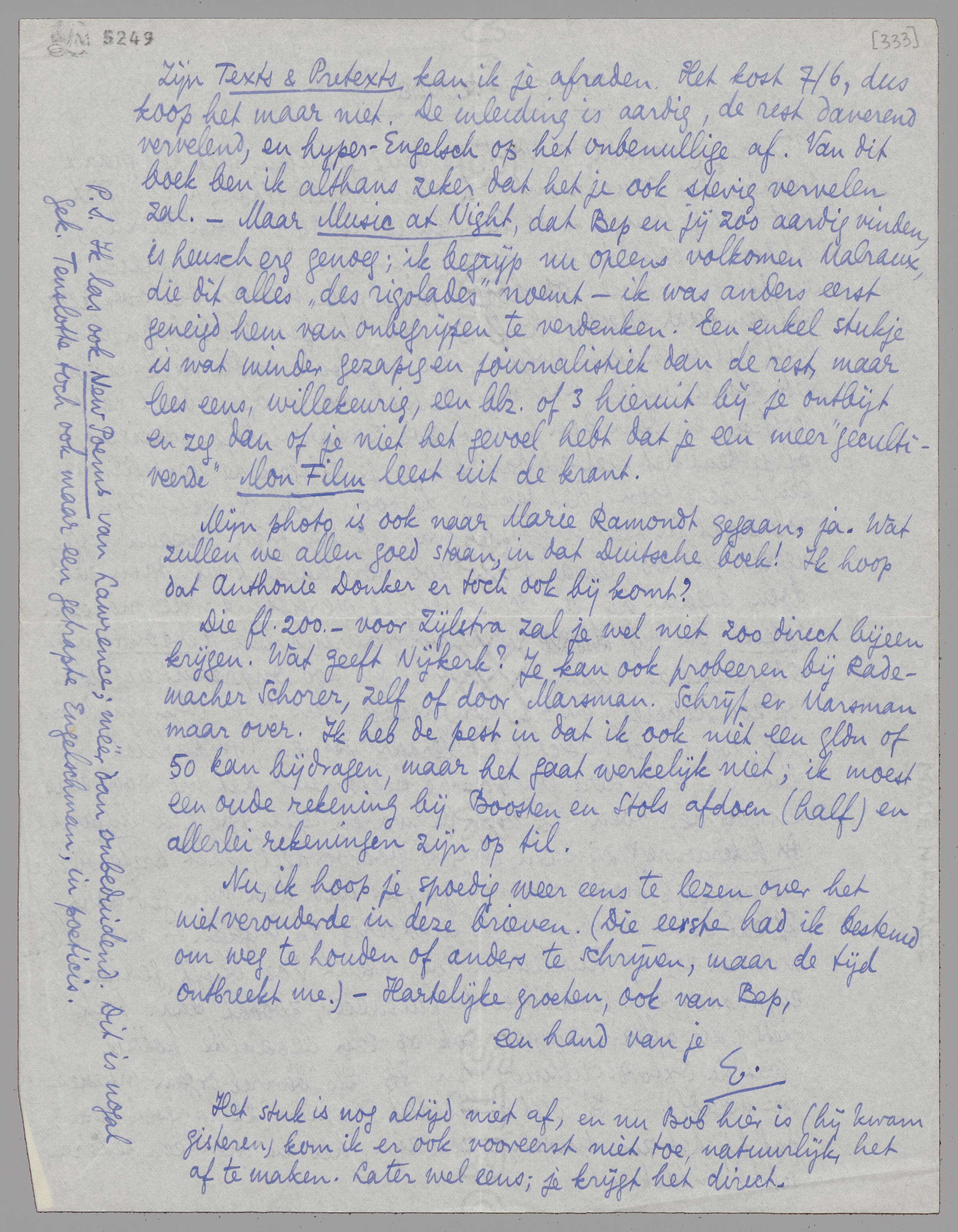 Zijn Texts & Pretexts kan ik je afraden. Het kost 7/6, dus koop het maar niet. De inleiding is aardig, de rest daverend vervelend, en hyper-Engelsch op het onbenullige af. Van dit boek ben ik althans zeker dat het je ook stevig vervelen zal. - Maar Music at Night, dat Bep en jij zoo aardig vinden, is heusch erg genoeg; ik begrijp nu opeens volkomen Malraux, die dit alles ‘des rigolades’ noemt - ik was anders eerst geneigd hem van onbegrijpen te verdenken. Een enkel stukje is wat minder gezapig en journalistiek dan de rest, maar lees eens, willekeurig, een blz. of 3 hieruit bij je ontbijt en zeg dan of je niet het gevoel hebt dat je een meer ‘gecultiveerde’ Mon Film leest uit de krant.
