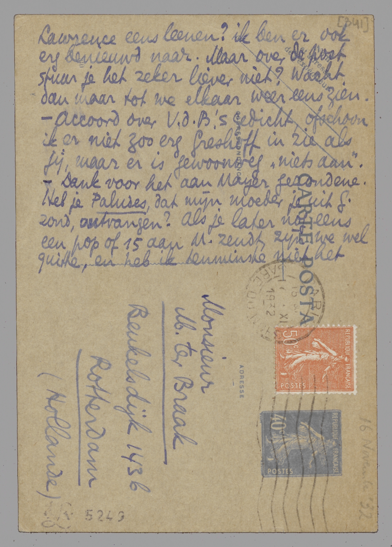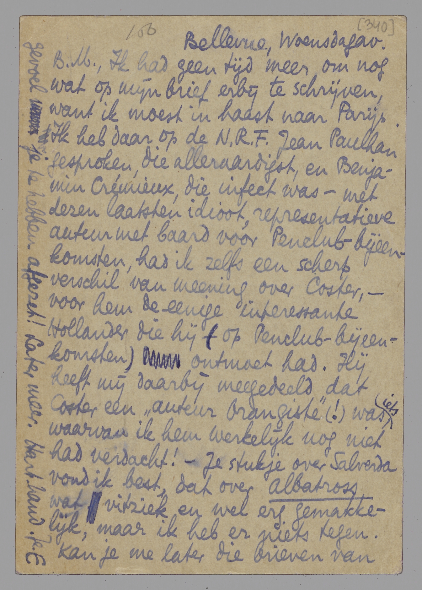 Ik had geen tijd meer om nog wat op mijn brief erbij te schrijven, want ik moest in haast naar Parijs. Ik heb daar op de N.R.F. Jean Paulhan gesproken, die alleraardigst, en Benjamin Crémieux, die infect was - met dezen laatsten idioot, representatieve auteur met baard voor Penclub-bijeenkomsten, had ik zelfs een scherp verschil van meening over Coster, - voor hem de eenige interessante Hollander die hij (op Penclub-bijeenkomsten) ontmoet had. Hij heeft mij daarbij meegedeeld dat Coster een ‘auteur Orangiste’(!) was, iets waarvan ik hem werkelijk nog niet had verdacht! - Je stukje over Salverda vond ik best, dat over Albatross wat vitziek en wel erg gemakkelijk, maar ik heb er niets tegen. Kan je me later die brieven van Lawrence eens leenen? ik ben er ook erg benieuwd naar. Maar over de post stuur je het zeker liever niet? Wacht dan maar tot we elkaar weer eens zien. - Accoord over V.d.B.'s gedicht, ofschoon ik er niet zoo erg Greshoff in zie als jij, maar er is gewoonweg ‘niets aan’. - Dank voor het aan Maijer gezondene. Heb je Paludes, dat mijn moeder je uit G. zond, ontvangen? Als je later nog eens een pop of 15 aan M. zendt, zijn we wel quitte, en heb ik tenminste niet het gevoel je te hebben afgezet! Later meer. Hart. hand. Je