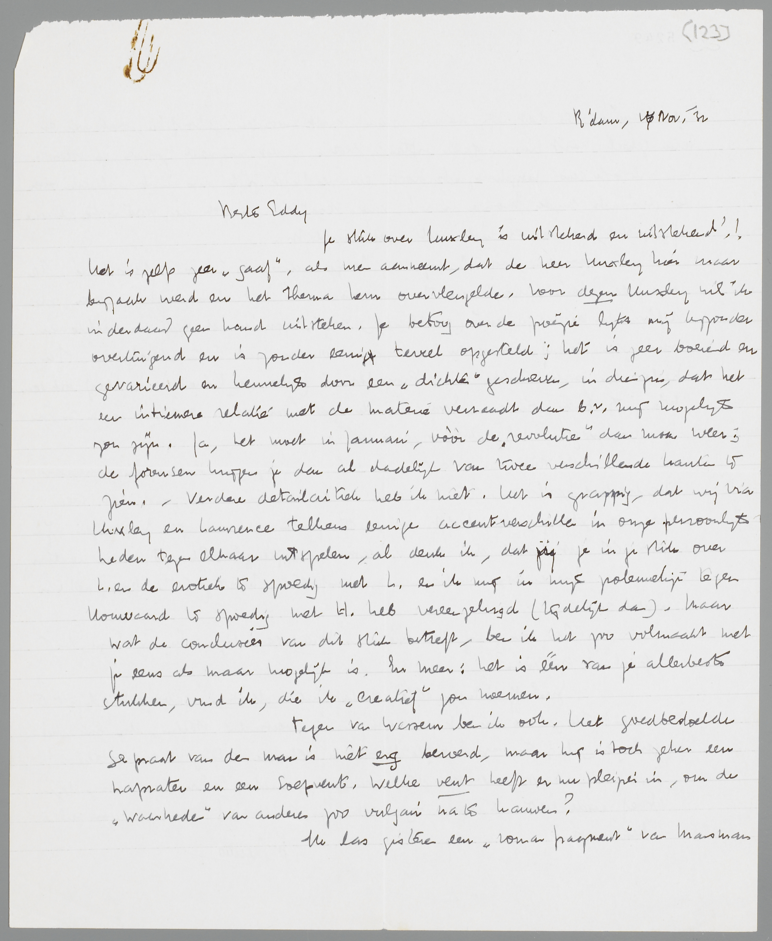 Je stuk over Huxley is uitstekend en uitstekend!! Het is zelfs zeer ‘gaaf’, als men aanneemt, dat de heer Huxley hier maar bijzaak werd en het thema hem overvleugelde. Voor dezen Huxley wil ik inderdaad geen hand uitsteken. Je betoog over de poëzie lijkt mij bijzonder overtuigend en is zonder eenig teveel opgesteld; het is zeer boeiend en gevarieerd en kennelijk door een ‘dichter’ geschreven, in dien zin, dat het een intiemere relatie met de materie verraadt dan b.v. mij mogelijk zou zijn. Ja, het moet in Januari, vóór de ‘revolutie’ dan maar weer; de forensen krijgen je dan al dadelijk van twee verschillende kanten te zien. - Verdere detailcritiek heb ik niet. Het is grappig, dat wij via Huxley en Lawrence telkens eenige accentverschillen in onze persoonlijkheden tegen elkaar uitspelen, al denk ik, dat jij je in je stuk over L. en de erotiek te spoedig met L. en ik mij in mijn polemiekje tegen Houwaard te spoedig met H. heb vereenzelvigd (tijdelijk dan). Maar wat de conclusies van dit stuk betreft, ben ik het zoo volmaakt met je eens als maar mogelijk is. En meer: het is één van je allerbeste stukken, vind ik, die ik ‘creatief’ zou noemen.