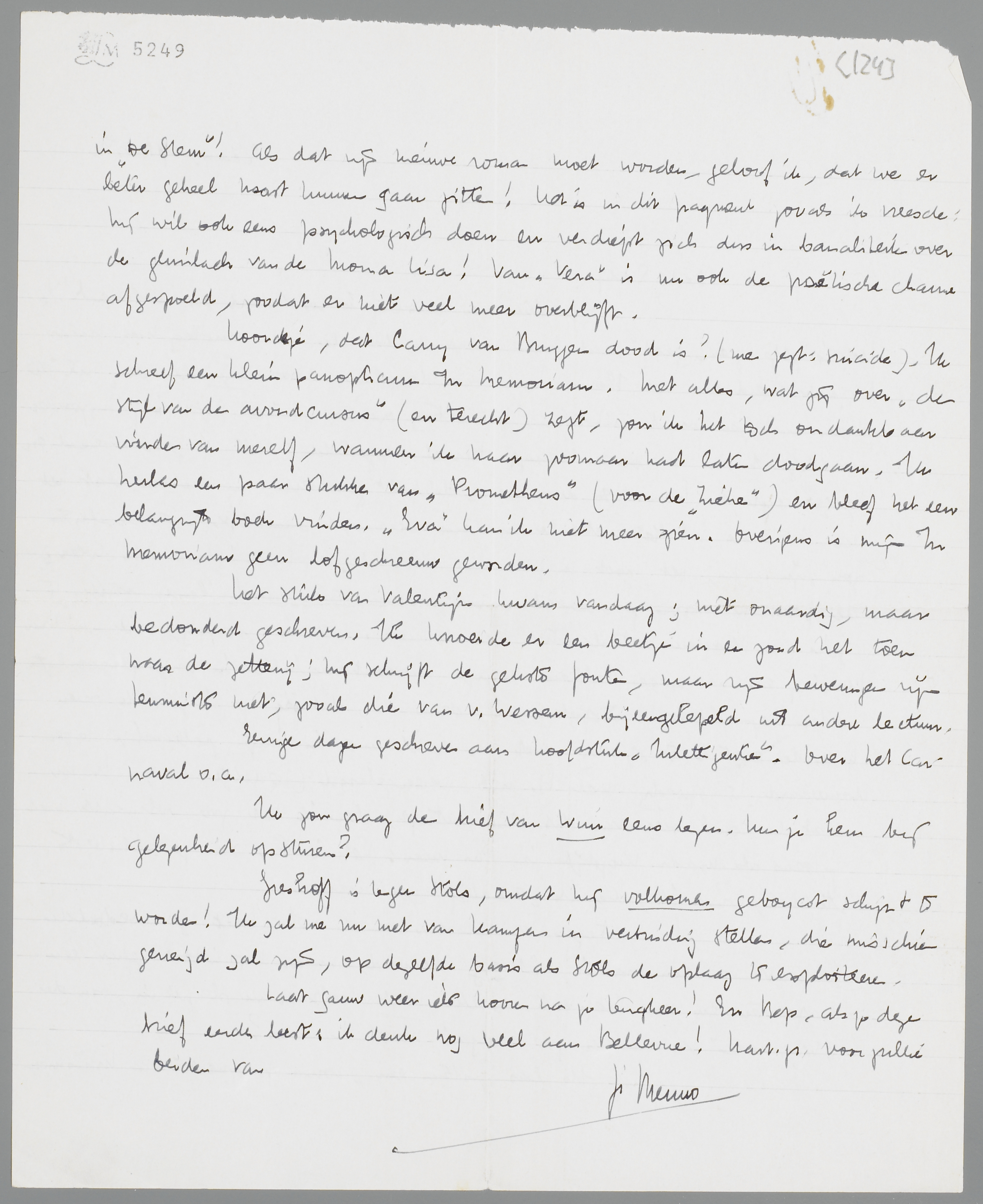 Hoorde je, dat Carry van Bruggen dood is? (men zegt: suicide). Ik schreef een klein panopticum in Memoriam. Met alles, wat jij over ‘den stijl van den avondcursus’ (en terecht) zegt, zou ik het toch ondankbaar vinden van mezelf, wanneer ik haar zoomaar had laten doodgaan. Ik herlas een paar stukken van Prometheus (voor de Zieke) en bleef het een belangrijkbvoek vinden. Eva kan ik niet meer zien. Overigens is mijn In Memoriam geen lofgeschreeuw geworden.