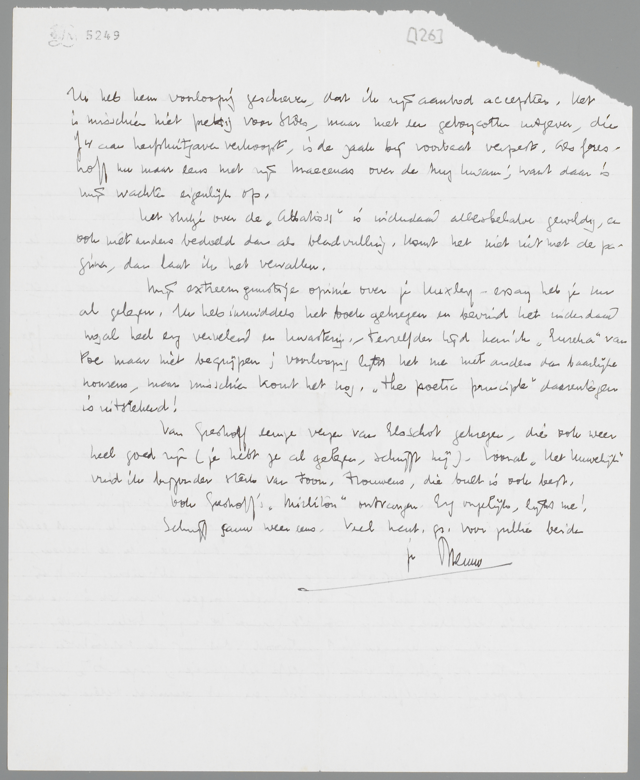 Mijn extreem gunstige opinie over je Huxley-essay heb je nu al gelezen. Ik heb inmiddels het boek gekregen en bevind het inderdaad nogal heel erg vervelend en kwasterig. - Terzelfdertijd kan ik Eureka van Poe maar niet begrijpen; voorloopig lijkt het me niet anders dan baarlijke nonsens, maar misschien komt het nog. The poetic principle daarentegen is uitstekend!