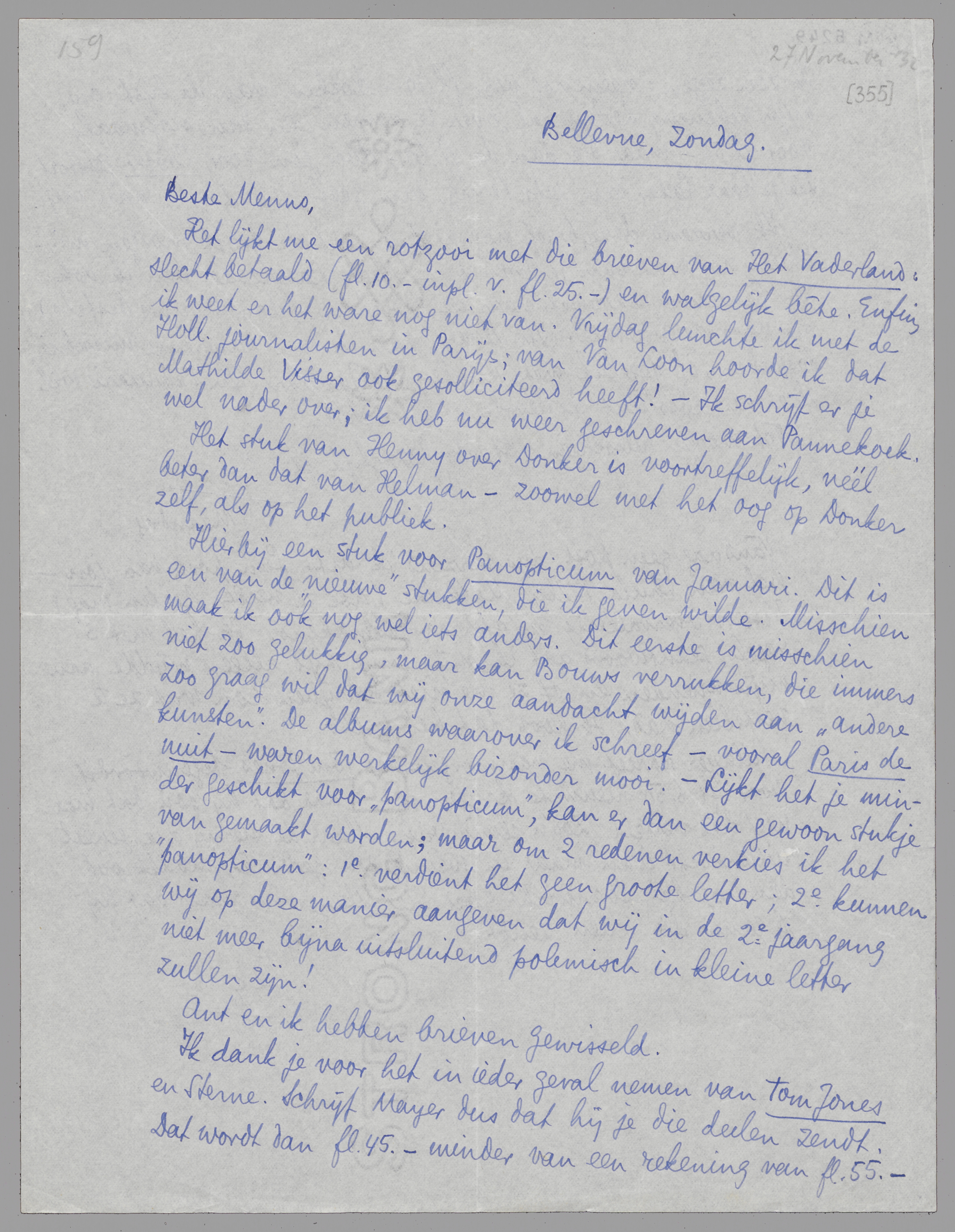 Hierbij een stuk voor Panopticum van Januari. Dit is een van de ‘nieuwe’ stukken, die ik geven wilde. Misschien maak ik ook nog wel iets anders. Dit eerste is misschien niet zoo gelukkig, maar kan Bouws verrukken, die immers zoo graag wil dat wij onze aandacht wijden aan ‘andere kunsten’. De albums waarover ik schreef - vooral Paris de Nuit - waren werkelijk bizonder mooi. - Lijkt het je minder geschkt voor ‘panopticum’, kan er dan een gewoon stukje van gemaakt worden; maar om 2 redenen verkies ik het ‘panopticum’: 1e verdient het geen groote letter; 2e kunnen wij op deze manier aangeven dat wij in de 2e jaargang niet meer bijna uitsluitend polemisch in kleine letter zullen zijn!