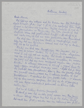 Het lijkt me een rotzooi met die brieven van Het Vaderland: slecht betaald (fl. 10.- inpl. v. fl. 25.-) en walgelijk bête. Enfin, ik weet er het ware nog niet van. Vrijdag lunchte ik met de Holl. journalisten in Parijs; van Van Loon hoorde ik dat Mathilde Visser ook gesolliciteerd heeft! - Ik schrijf er je wel nader over; ik heb nu weer geschreven aan Pannekoek.