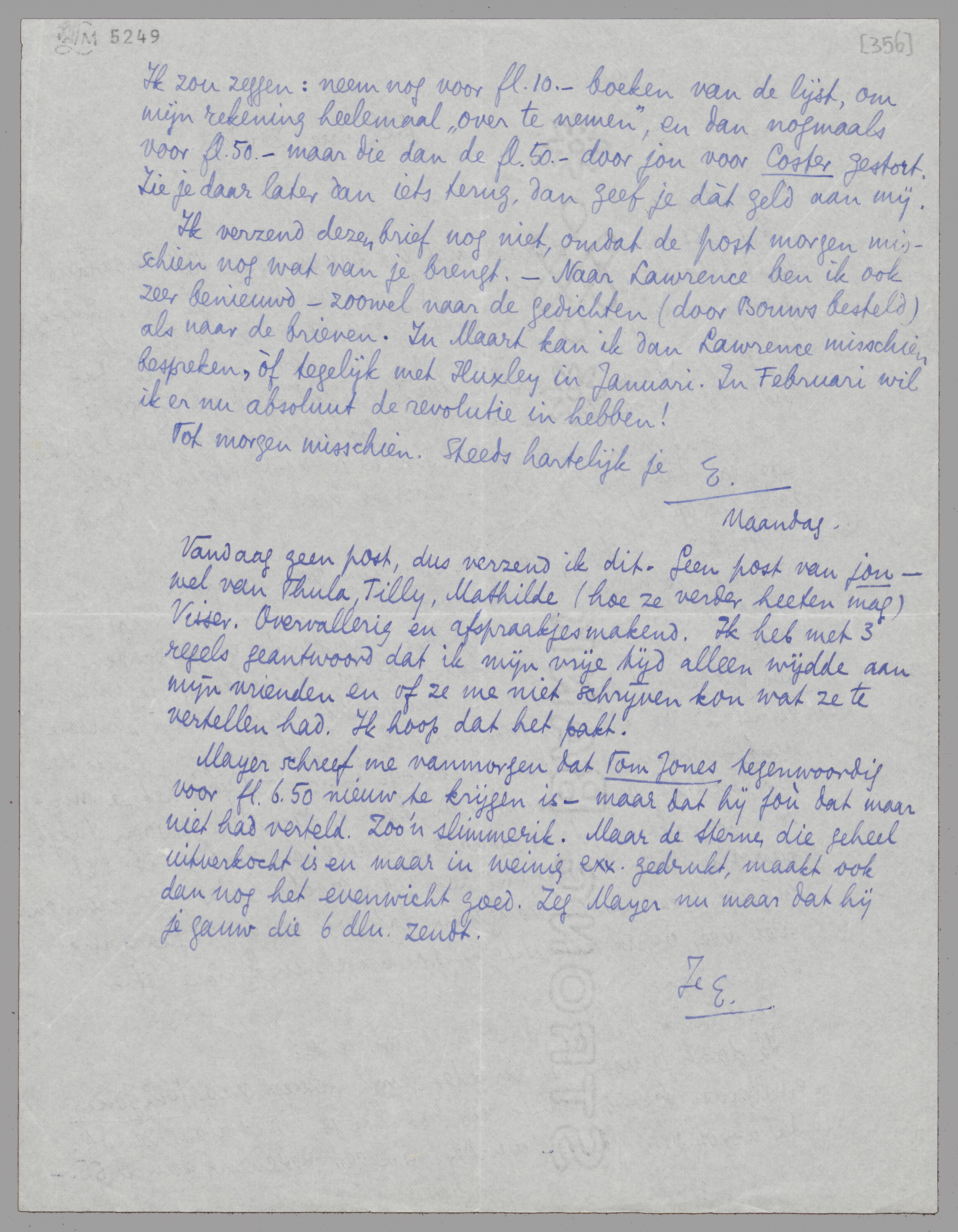 Ik dank je voor het in ieder geval nemen van Tom Jones en Sterne. Schrijf Mayer dus dat hij je die deelen zendt. Dat wordt dan fl. 45.- minder van een rekening van fl. 55.- Ik zou zeggen: neem nog voor fl. 10.- boeken van de lijst, om mijn rekening heelemaal ‘over te nemen’, en dan nogmaals voor fl. 50.- maar die dan de fl. 50.- door jou voor Coster gestort. Zie je daar later dan iets terug, dan geef je dàt geld aan mij.