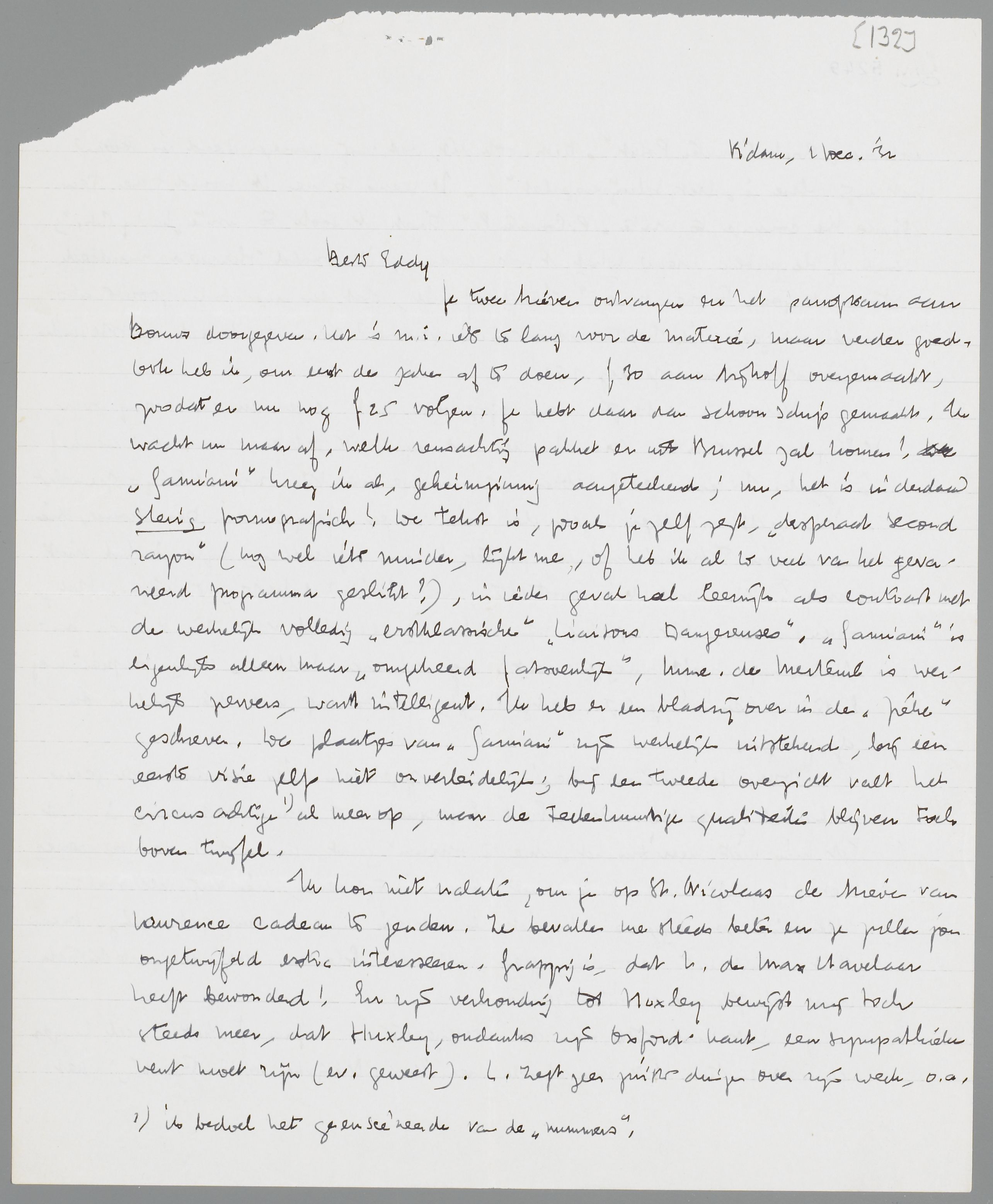 Ik kon niet nalaten, om je op St. Nicolaas de brieven van Lawrence cadeau te zenden. Ze bevallen me steeds beter en ze zullen jou ongetwijfeld extra interesseren. Grappig is, dat L. de Max Havelaar heeft bewonderd! En zijn verhouding tot Huxley bewijst mij toch steeds meer, dat Huxley, ondanks zijn Oxford-kant, een sympathieke vent moet zijn (ev. geweest). L. zegt zeer juiste dingen over zijn werk, o.a. ook over Point Counter Point. O.m. ook dit, dat mij genoegen deed in verband met mijn these in Het Schrijverspalet: ‘It seems to me it would take ten times the courage to write P. Counter P. that it took to write Lady Ch.; and if the public knew what it was reading, it would throw a hundred stones at you, to one at me.’ Ik geloof niet, dat een man als L. zooiets als compliment zegt; ik ben trouwens van de waarheid ervan overtuigd. Uitstekende critiek op Aldous op pag. 783!