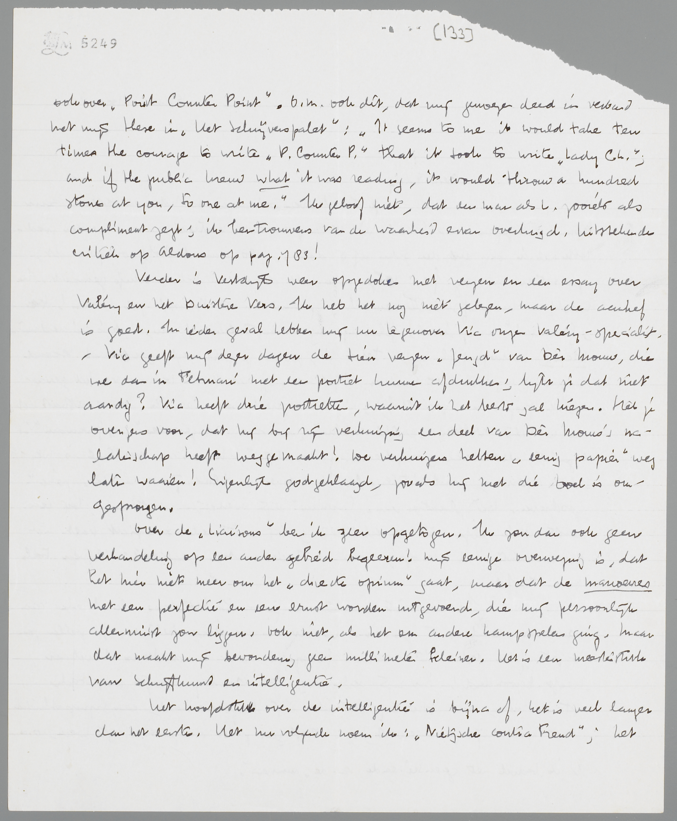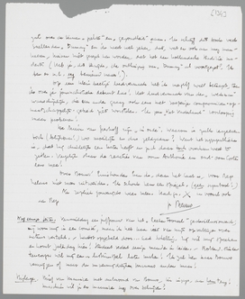 Het hoofdstuk over de intelligentie is bijna af, het is veel langer dan het eerste. Het nu volgende noem ik: Nietzsche contra Freud; het zal over de termen ‘ziekte’ en ‘gezondheid’ gaan. Ik schrijf dit boek veel sneller dan Dumay en ik weet wel zeker, dat, wat er ook aan mag mankeeren, hiervan niet gezegd kan worden, dat het een hollandsche traditie nadert. (Heb je, dit terzijde, de ontluizing van Dumay al voortgezet? Ik ben er n.l. erg benieuwd naar!).