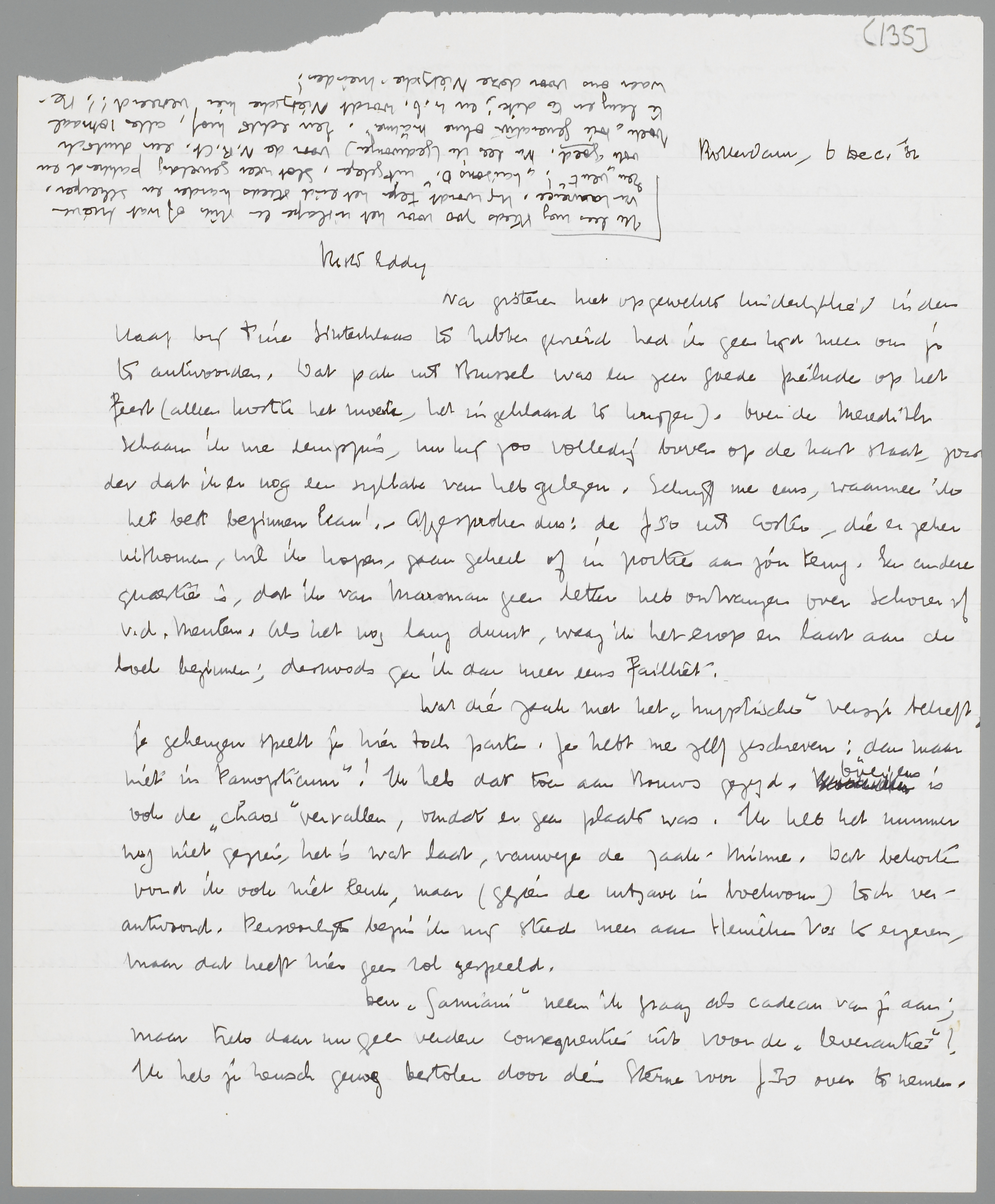 Na gisteren met opgewekte kinderlijkheid in den Haag bij Tine Sinterklaas te hebben gevierd had ik geen tijd meer om je te antwoorden. Dat pak uit Brussel was een zeer goede prélude op het feest (alleen kostte het moeite, het ingeklaard te krijgen). Over de Meredith schaam ik me eenigszins, nu hij zoo volledig boven op de kast staat, zonder dat ik er nog een syllabe van heb gelezen. Schrijf me eens, waarmee ik het best beginnen kan! - Afgesproken dus: de ƒ 50 uit Coster, die er zeker uitkomen, wil ik hopen, gaan geheel of in porties aan jou terug. Een andere quaestie is, dat ik van Marsman geen letter heb ontvangen over Schorer of v.d. Meulen. Als het nog lang duurt, waag ik het erop en laat aan de boel beginnen; desnoods ga ik dan weer eens failliet.