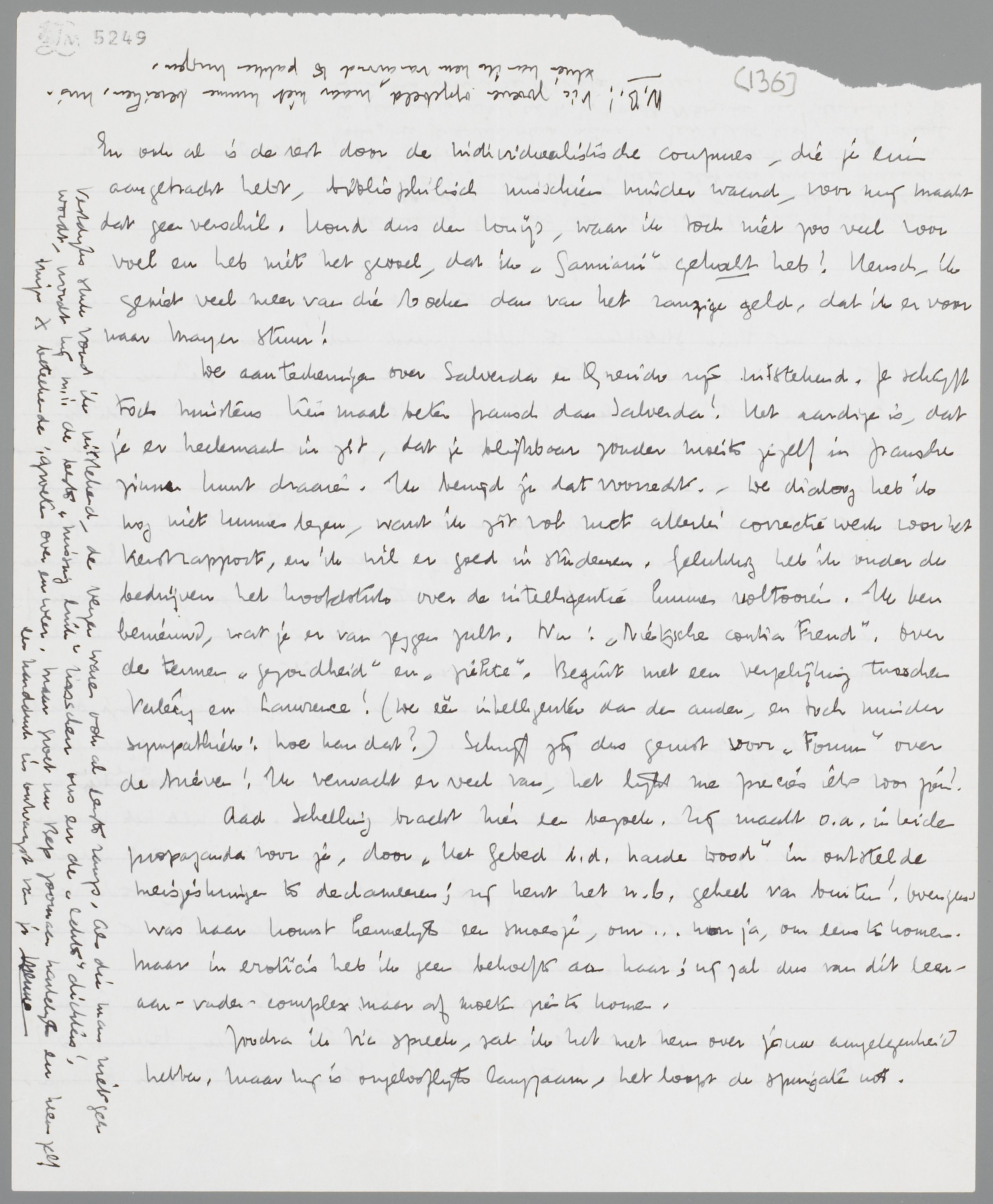 De aanteekeningen over Salverda en Querido zijn uitstekend. Je schrijft toch minstens tien maal beter fransch dan Salverda! Het aardige is, dat je er heelemaal in zit, dat je blijkbaar zonder moeite jezelf in fransche zinnen kunt draaien. Ik benijd je dat voorrecht.- De dialoog heb ik nog niet kunnen lezen, want ik zit vol met allerlei correctiewerk voor het Kerstrapport, en ik wil er goed in studeeren. Gelukkig heb ik onder de bedrijven het hoofdstuk over de intelligentie kunnen voltooien. Ik ben benieuwd, wat je er van zeggen zult. Nu: Nietzsche contra Freud. Over de termen ‘gezondheid’ en ‘ziekte’. Begint met een vergelijking tusschen Valéry en Lawrence! (De één intelligenter dan de ander, en toch minder sympathiek: hoe kan dat?) Schrijf jij dus gerust voor Forum over de brieven! Ik verwacht er veel van, het lijkt me precies iets voor jou!