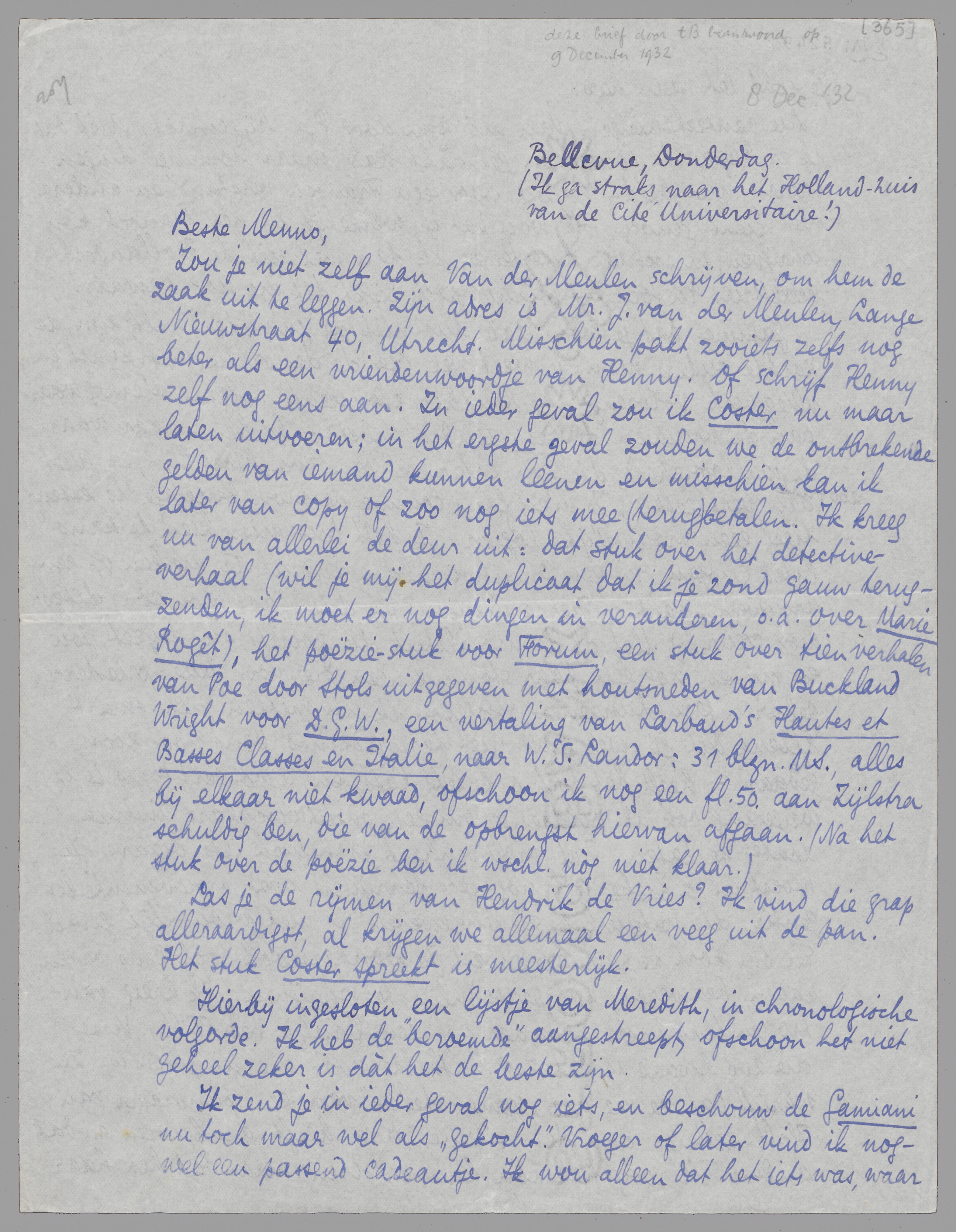 Zou je niet zelf aan Van der Meulen schrijven, om hem de zaak uit te leggen. Zijn adres is Mr. J. van der Meulen, Lange Nieuwstraat 40, Utrecht. Misschien pakt zooiets zelfs nog beter als een vriendenwoordje van Henny. Of schrijf Henny zelf nog eens aan. In ieder geval zou ik Coster nu maar laten uitvoeren; in het ergste geval zouden we de ontbrekende gelden van iemand kunnen leenen en misschien kan ik later van copy of zoo nog iets mee (terug) betalen. Ik kreeg nu van allerlei de deur uit: dat stuk over het detective-verhaal (wil je mij het duplicaat dat ik je zond gauw terugzenden, ik moet er nog dingen in veranderen, o.a. over Marie Rogêt), het poëzie-stuk voor Forum, een stuk over tien verhalen van Poe door Stols uitgegeven met houtsneden van Buckland Wright voor D.G.W., een vertaling van Larbaud's Hautes et Basses Classes en Italie, naar W.S. Landor: 31 blzn. Ms., alles bij elkaar niet kwaad, ofschoon ik nog een fl. 50.- aan Zijlstra schuldig ben, die van de opbrengst hiervan afgaan. (Na het stuk over de poëzie ben ik wschl. nòg niet klaar.)