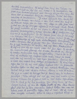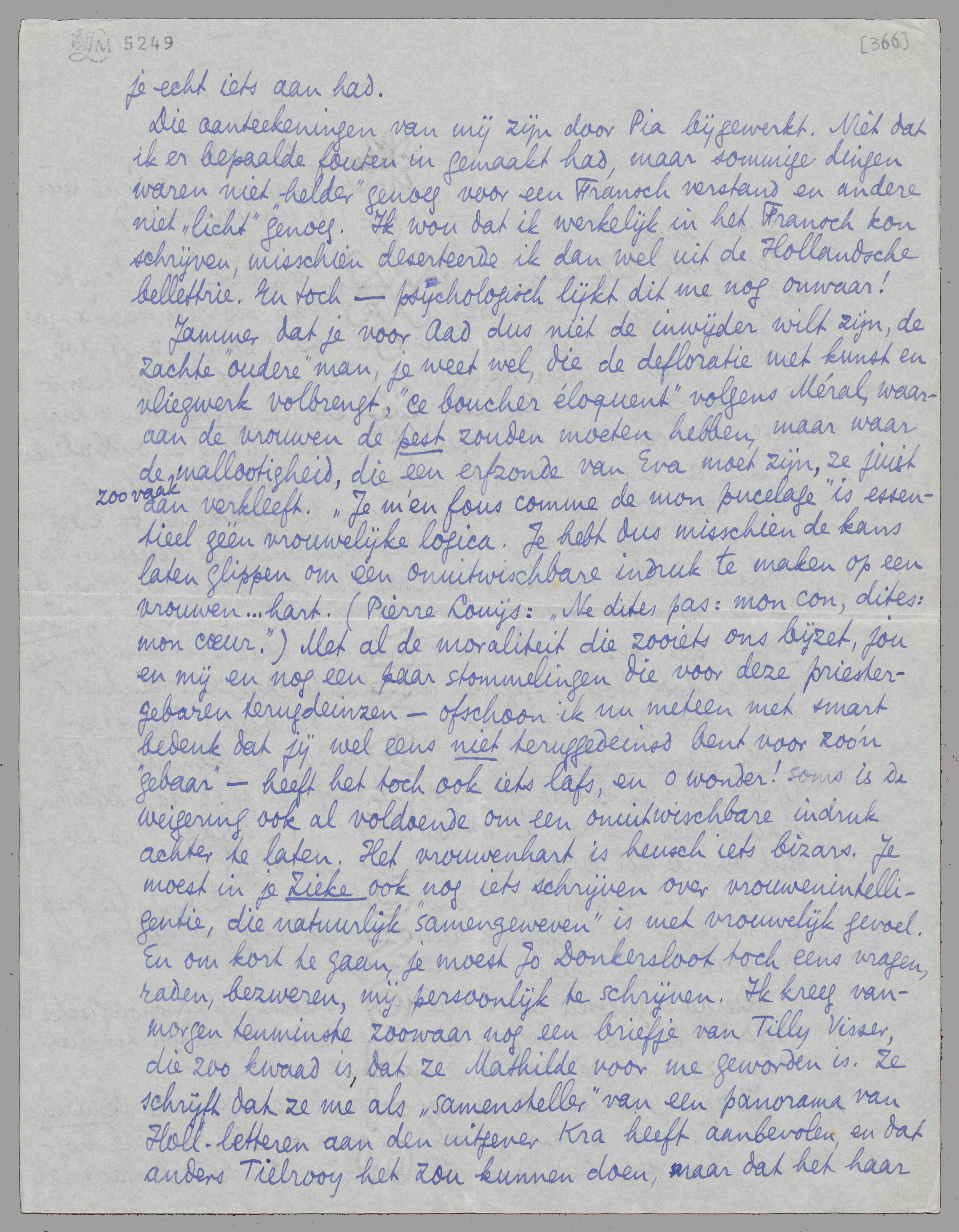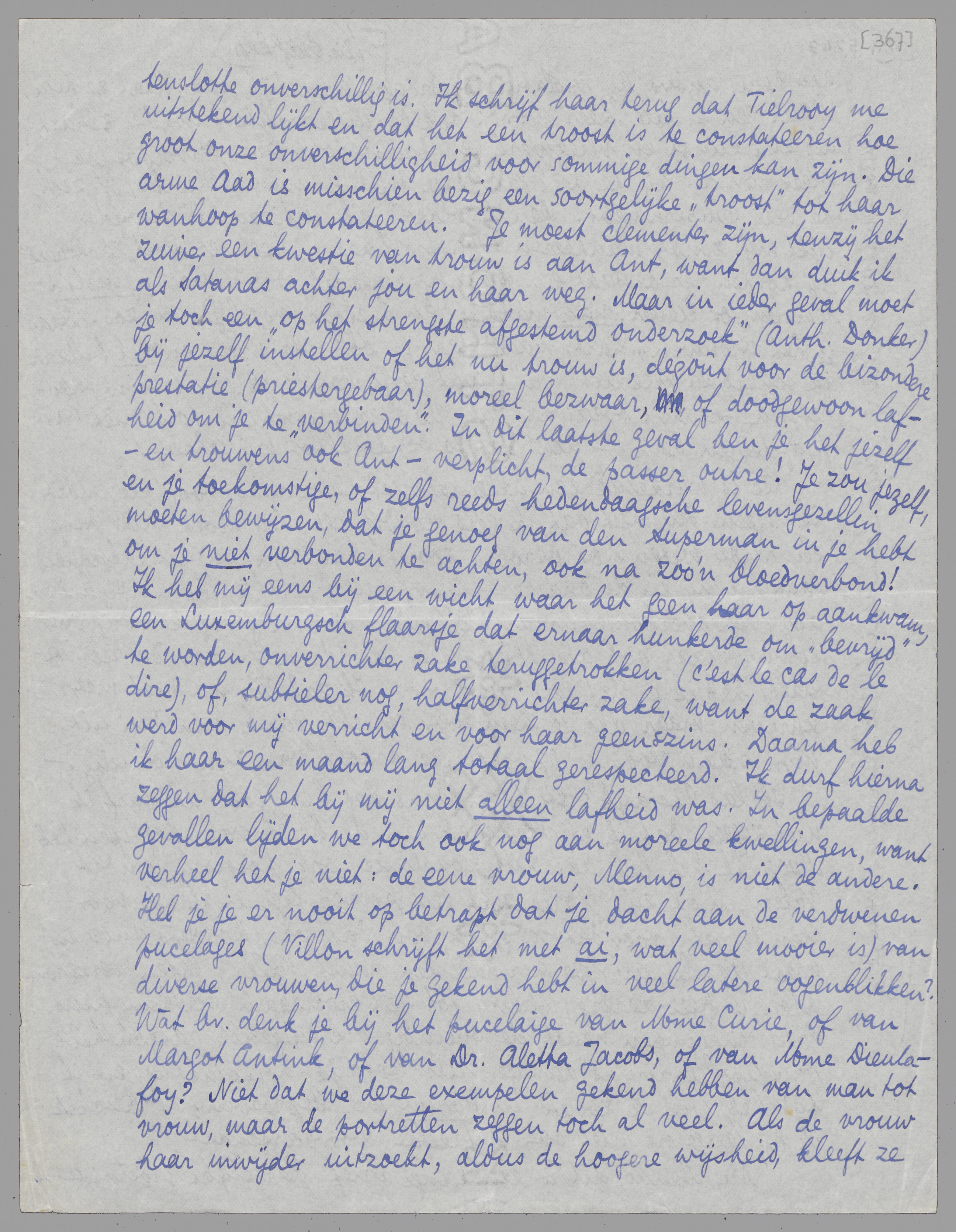 Jammer dat je voor Aad dus niet de inwijder wilt zijn, de zachte ‘oudere’ man, je weet wel, die de defloratie met kunst en vliegwerk volbrengt, ‘de boucher éloquent’ volgens Méral, waaraan de vrouwen de pest zouden moeten hebben, maar waar de mallootigheid, die een erfzonde van Eva moet zijn, ze juist zoo vaak aan verkleeft. ‘Je m'en fous comme de mon pucelage’ is essentieel géén vrouwelijke logica. Je hebt dus misschien de kans laten glippen om een onuitwischbare indruk te maken op een vrouwen... hart. (Pierre Louijs: ‘Ne dites pas: mon con, dites: mon coeur.’) Met al de moraliteit die zooiets ons bijzet, jou en mij en nog een paar stommelingen die voor deze priestergebaren terugdeinzen - ofschoon ik nu meteen met smart bedenk dat jij wel eens niet teruggedeinsd bent voor zoo'n ‘gebaar’ - heeft het toch ook iets lafs, en o wonder! soms is de weigering ook al voldoende om een onuitwischbare indruk achter te laten. Het vrouwenhart is heusch iets bizars. Je moest in je Zieke ook nog iets schrijven over vrouwenintelligentie, die natuurlijk ‘samengeweven’ is met vrouwelijk gevoel. En om kort te gaan, je moest Jo Donkersloot toch eens vragen, raden, bezweren, mij persoonlijk te schrijven. Ik kreeg vanmorgen terminste zoowaar nog een briefje van Tilly Visser, die zoo kwaad is, dat ze Mathilde voor me geworden is. Ze schrijft dat ze me als ‘samensteller’ van een panorama van Holl. letteren aan den uitgever Kra heeft aanbevolen, en dat anders Tielrooy het zou kunnen doen, maar dat het haar tenslotte onverschillig is. Ik schrijf haar terug dat Tielrooy me uitstekend lijkt en dat het een troost is te constateeren hoe groot onze onverschilligheid voor sommige dingen kan zijn. Die arme Aad is misschien bezig een soortgelijke ‘troost’ tot haar wanhoop te constateeren. Je moest clementer zijn, tenzij het zuiver een kwestie van trouw is aan Ant, want dan duik ik als Satanas achter jou en haar weg. Maar in ieder geval moet je toch een ‘op het strengste afgestemd onderzoek’ (Anth. Donker) bij jezelf instellen of het nu trouw is, dégoût voor de bizondere prestatie (priestergebaar), moreel bezwaar, of doodgewoon lafheid om je te ‘verbinden’. In dit laatste geval ben je het jezelf - en trouwens ook Ant - verplicht, de passer outre! Je zou jezelf, en je toekomstige, of zelfs reeds hedendaagsche levensgezellin moeten bewijzen, dat je genoeg van den Superman in je hebt om je niet verbonden te achten, ook na zoo'n bloedverbond! Ik heb mij eens bij een wicht waar het geen haar op aankwam, een Luxemburgsch flaarsje dat ernaar hunkerde om ‘bevrijd’ te worden, onverrichter zake teruggetrokken (c'est le cas de le dire), of, subtieler nog, halfverrichter zake, want de zaak werd voor mij verricht en voor haar geenszins. Daarna heb ik haar een maand lang totaal gerespecteerd. Ik durf hierna zeggen dat het bij mij niet alleen lafheid was. In bepaalde gevallen lijden we toch ook nog aan moreele kwellingen, want verheel het je niet: de eene vrouw, Menno, is niet de andere. Heb je je er nooit op betrapt dat je dacht aan de verdwenen pucelages (Villon schrijft het met ai, wat veel mooier is) van diverse vrouwen, die je gekend hebt in veel latere oogenblikken? Wat bv. denk je bij het pucelaige van Mme Curie, of van Margot Antink, of van Dr. Aletta Jacobs, of van Mme Dieulafoy? Niet dat we deze exempelen gekend hebben van man tot vrouw, maar de portretten zeggen toch al veel. Als de vrouw haar inwijder uitzoekt, aldus de hoogere wijsheid, kleeft ze aan hem; anders, bij violatie, opgedrongen huwelijk, (zie brief Bep) enz., ‘haat’ ze hem. Maar een enkele keer wordt ook de uitgezochte inwijder gehaat, als zijn kunst en vliegwerk en priesteroptreden onvoldoende bleek, bv. als hij te veel fantazie tegelijk manifesteerde, of zelfs, te veel temperament. Den Doolaard als uitgezochte inwijder lijkt mij zonder mankeeren catastrophaal. Neen, er moet ‘zachtheid’ bij komen, er bestaat een prachtig maleisch woord voor: djinekin = temmen, of liever: mak maken; van beestjes, vogeltjes en zoo. Daar is het vrouwen...hart, maar daar is óók: de vrouwenziel! Maar ik scheid er mee uit, want wat geeft het of ik je al mijn theoretische kennis toezwaai, als Aad er misschien tòch niet van profiteeren kan. - Ach! dat Jo Donkersloot mij schreef!