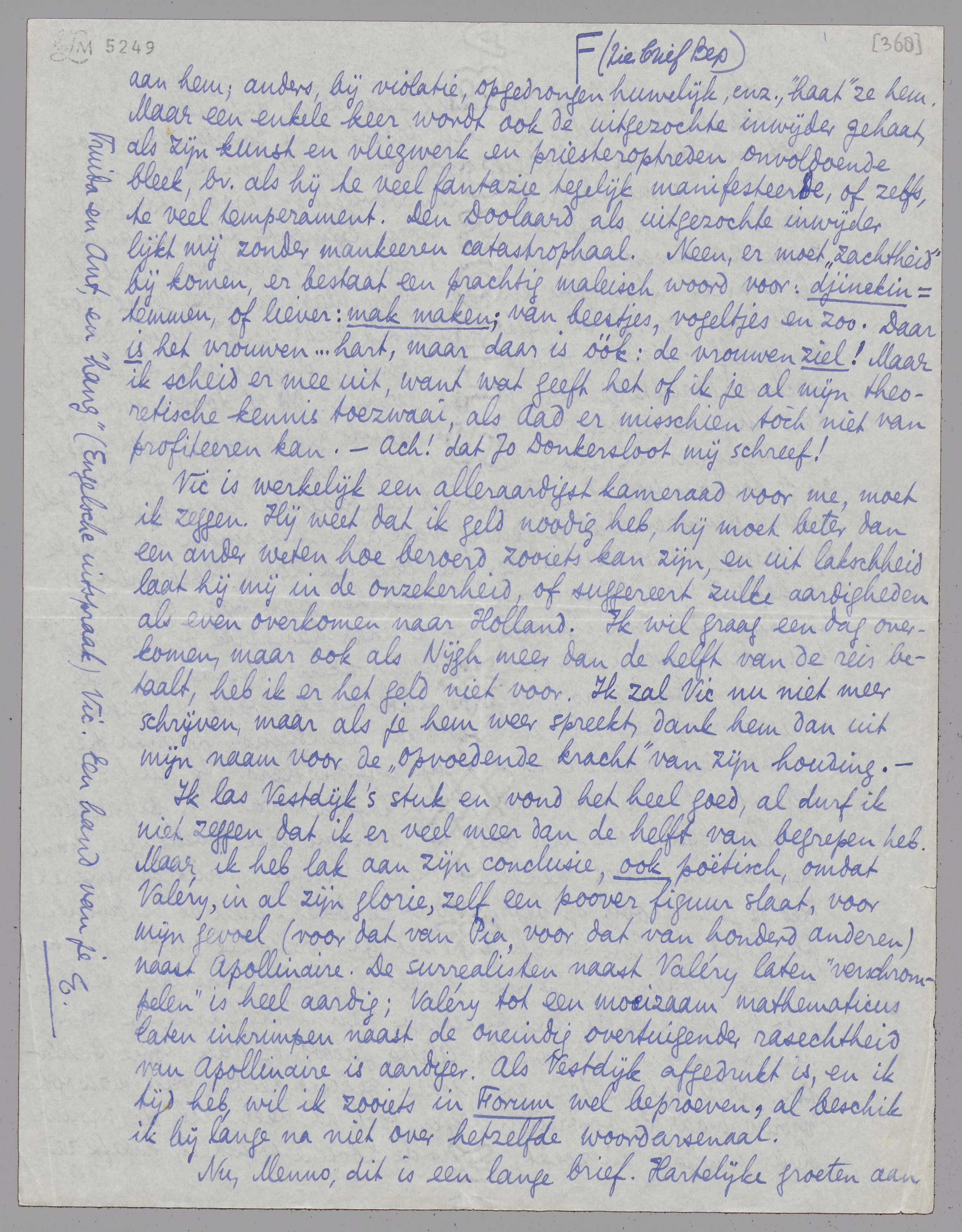 Ik las Vestdijk's stuk en vond het heel goed, al durf ik niet zeggen dat ik er veel meer dan de helft van begrepen heb. Maar ik heb lak aan zijn conclusie, ook poëtisch, omdat Valéry, in al zijn glorie, zelf een poover figuur slaat, voor mijn gevoel (voor dat van Pia, voor dat van honderd anderen) naast Apollinaire. De surrealisten naast Valéry laten ‘verschrompelen’ is heel aardig; Valéry tot een moeizaam mathematicus laten inkrimpen naast de oneindig overtuigender rasechtheid van Apollinaire is aardiger. Als Vestdijk afgedrukt is, en ik tijd heb, wil ik zooiets in Forum wel beproeven, al beschik ik bij lange na niet over hetzelfde woordarsenaal.