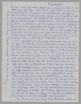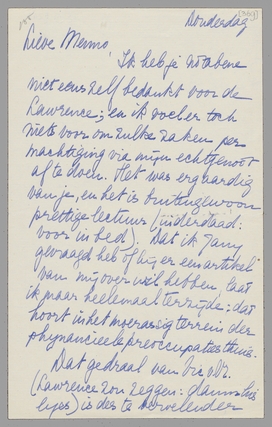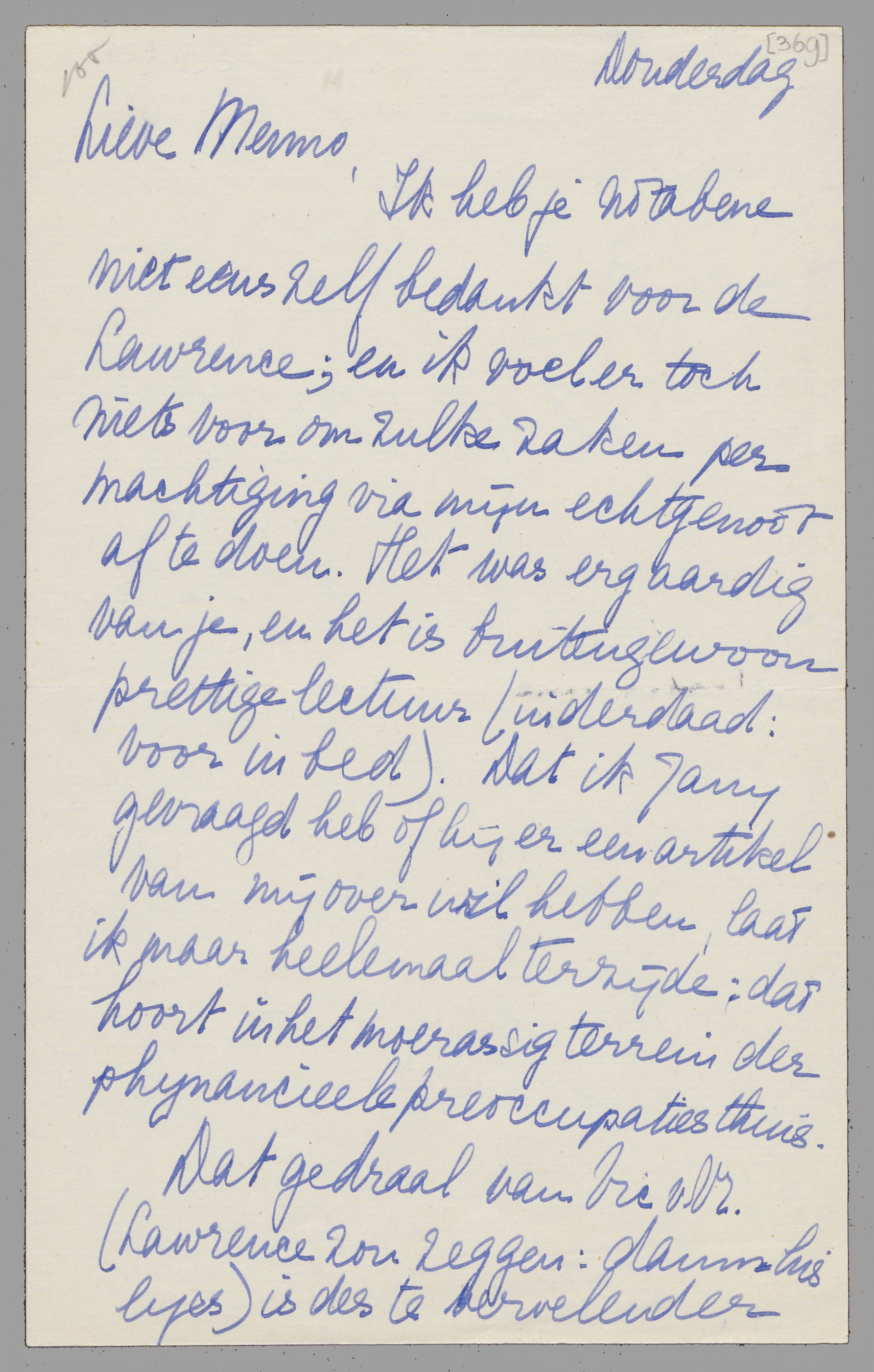 Ik heb je notabene niet eens zelf bedankt voor de Lawrence; en ik voel er toch niet voor om zulke zaken per machtiging via mijn echtgenoot af te doen. Het was erg aardig van je en het is buitengewoon prettige lectuur (inderdaad: voor in bed). Dat ik Jany gevraagd heb of hij er een artikel van mij over wil hebben, laat ik maar heelemaal terzijde: dat hoort in het moerassig terrein der phinancieele preoccupaties thuis.
