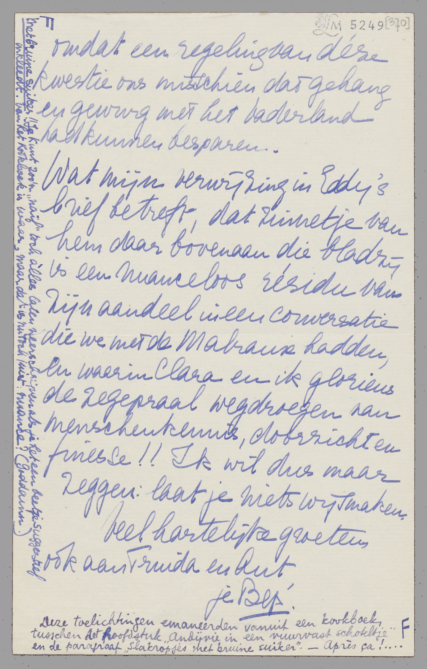Wat mijn verwijzing in Eddy's brief betreft, dat zinnetje van hem daar bovenaan die bladzij is een nuanceloos résidu van zijn aandeel in een conversatie die we met de Malraux hadden, en waarin Clara en ik glorieus de zegepraal wegdroegen van menschenkennis, doorzicht en finesse!! Ik wil dus maar zeggen: laat je niets wijsmaken.