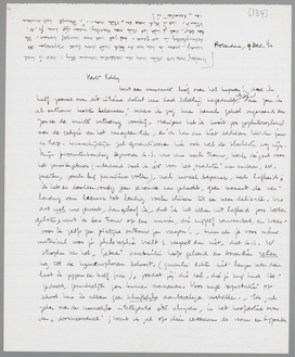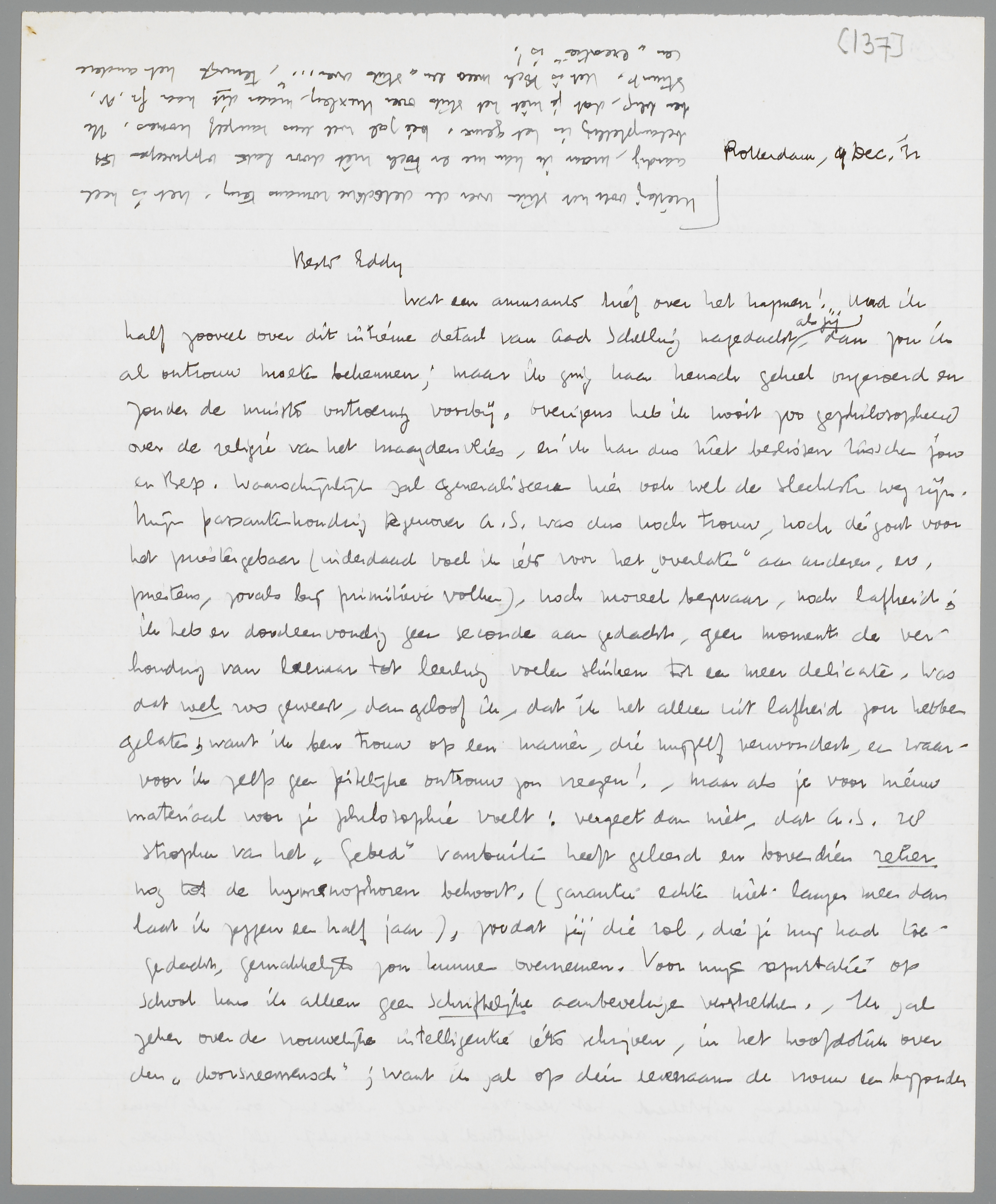 Wat een amusante brief over het hymen! Had ik half zooveel over dit intieme detail van Aad Schelling nagedacht als jij, dan zou ik al ontrouw moeten bekennen; maar ik ging haar heusch geheel ongeroerd en zonder de minste ontroering voorbij. Overigens heb ik nooit zoo gephilosopheerd over de religie van het maagdenvlies, en ik kan dus niet beslissen tusschen jou en Bep. Waarschijnlijk zal generaliseeren hier ook wel de slechtste weg zijn. Mijn passantenhouding tegenover A.S. was dus noch trouw, noch dégout voor het priestergebaar (inderdaad voel ik iets voor het ‘overlaten’ aan anderen, ev. priesters, zooals bij primitieve volken), noch moreel bezwaar, noch lafheid; ik heb er doodeenvoudig geen seconde aan gedacht, geen moment de verhouding van leeraar tot leerling voelen slinken tot een meer delicate. Was dat wel zoo geweest, dan geloof ik, dat ik het alleen uit lafheid zou hebben gelaten; want ik ben trouw op een manier, die mijzelf verwondert, en waarvoor ik zelfs geen feitelijke ontrouw zou vreezen! - , maar als je voor nieuw materiaal voor je philosophie voelt: vergeet dan niet, dat A.S. 28 strophen van het Gebed vanbuiten heeft geleerd en bovendien zeker nog tot de hymenophoren behoort, (garantie echter niet langer meer dan laat ik zeggen een half jaar), zoodat jij die rol, die je mij had toegedacht, gemakkelijk zou kunnen overnemen. Voor mijn reputatie op school kan ik alleen geen schriftelijke aanbevelingen verstrekken. - Ik zal zeker over de vrouwelijke intelligentie iets schrijven, in het hoofdstuk over den ‘doorsneemensch’; want ik zal op dien eerenaam de vrouw een bijzonder goede kans toekennen.