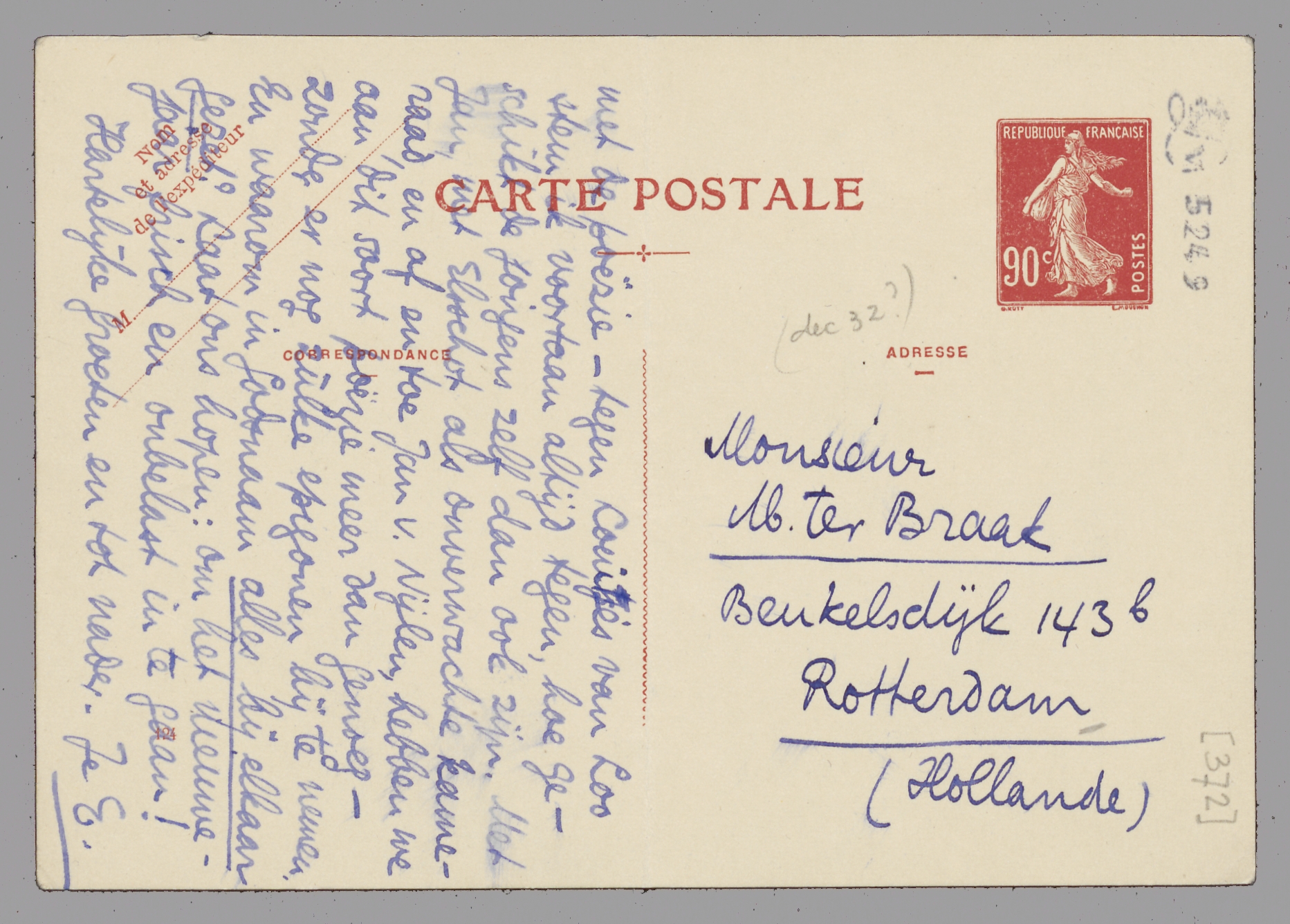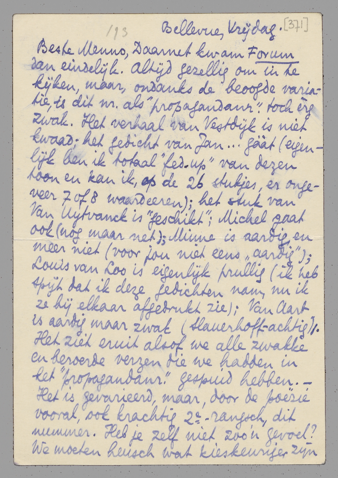 Daarnet kwam Forum dan eindelijk. Altijd gezellig om in te kijken, maar, ondanks de beoogde variatie, is dit nr. als ‘propagandanr.’ toch èrg zwak. Het verhaal van Vestdijk is niet kwaad; het gedicht van Jan... gààt (eigenlijk ben ik totaal ‘fed-up’ van dezen toon en kan ik, op de 26 stukjes, er ongeveer 7 of 8 waardeeren); het stuk van Van Uytvanck is ‘geschikt’; Michel gaat ook (nog maar net); Minne is aardig en meer niet (voor jou niet eens ‘aardig’); Louis van Loo is eigenlijk prullig (ik heb spijt dat ik deze gedichten nam nu ik ze bij elkaar afgedrukt zie); Van Aart is aardig maar zwak (Slauerhoff-achtig). Het ziet eruit alsof we alle zwakke en beroerde verzen die we hadden in het ‘propagandanr.’ gespuid hebben. - Het is gevarieerd, maar, door de poëzie vooral, ook krachtig 2e-rangsch, dit nummer. Heb je zelf niet zoo'n gevoel? We moeten heusch wat kieskeuriger zijn met de poëzie - tegen Louitjes van Loo stem ik voortaan altijd tegen, hoe geschikt de jongens zelf dan ook zijn. Met Jan, met Elsschot als onverwachte kameraad, en af en toe Jan v. Nijlen, hebben we aan dit soort poëzie meer dan genoeg - zonder er nog zùlke epigonen bij te nemen. En waarom in Godsnaam alles bij elkaar gezet? Laat ons hopen: om het nieuwejaar frisch en onbelast in te gaan!