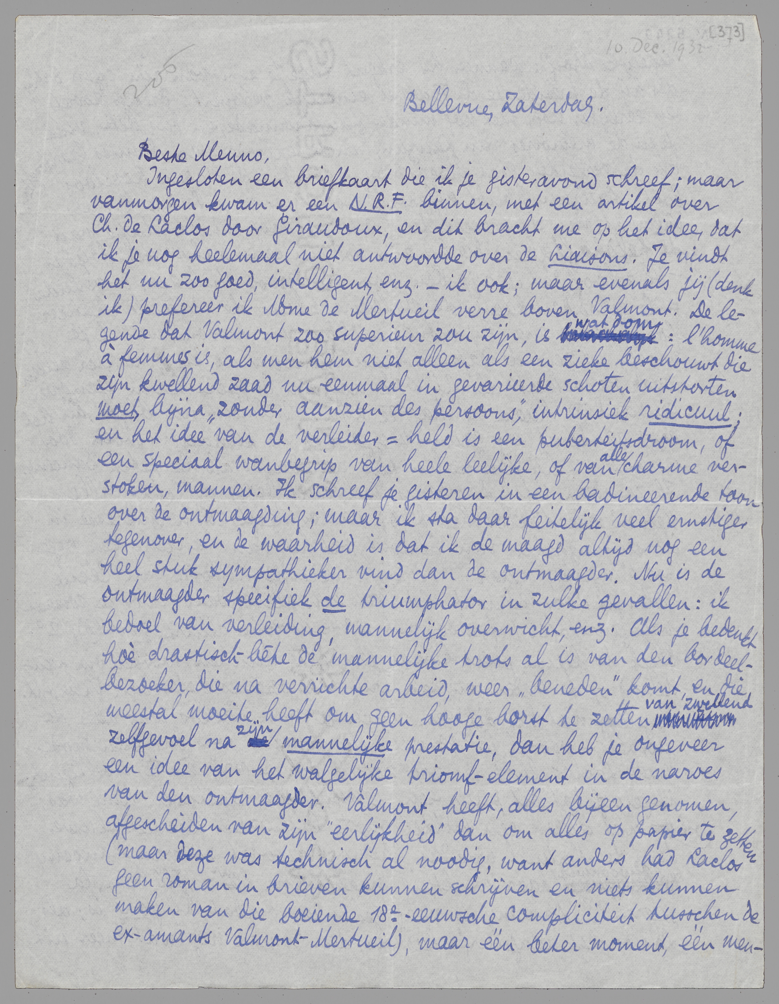 Ingesloten een briefkaart die ik je gisteravond schreef; maar vanmorgen kwam er een N.R.F. binnen, met een artikel over Ch. de Laclos door Giraudoux, en dit bracht me op het idee, dat ik je nog heelemaal niet antwoordde over de Liaisons. Je vindt het nu zoo goed, intelligent, enz. - ik ook; maar evenals jij (denk ik) prefereer ik Mme de Mertueil verre boven Valmont. De legende dat Valmont zoo superieur zou zijn, is wat dom: l'homme à femmes is, als men hem niet alleen als een zieke beschouwt die zijn kwellend zaad nu eenmaal in gevarieerde schoten uitstorten moet, bijna ‘zonder aanzien des persoons’, intrinsiek ridicuul; en het idee van de verleider = held is een puberteitsdroom, of een speciaal wanbegrip van heele leelijke, of van alle charme verstoken, mannen. Ik schreef je gisteren in een badineerende toon over de ontmaagding; maar ik sta daar feitelijk veel ernstiger tegenover, en de waarheid is dat ik de maagd altijd nog een heel stuk sympathieker vind dan de ontmaagder. Nu is de ontmaagder specifiek de triumphator in zulke gevallen: ik bedoel van verleiding, mannelijk overwicht, enz. Als je bedenkt hoè drastisch-bête de mannelijke trots al is van den bordeelbezoeker, die na verrichte arbeid, weer ‘beneden’ komt, en die meestal moeite heeft om geen hooge borst te zetten van zwellend zelfgevoel na zijn mannelijke prestatie, dan heb je ongeveer een idee van het walgelijke triomf-element in de naroes van den ontmaagder. Valmont heeft, alles bijeen genomen, afgescheiden van zijn ‘eerlijkheid’ dan om alles op papier te zetten (maar deze was technisch al noodig, want anders had Laclos geen roman in brieven kunnen schrijven en niets kunnen maken van die boeiende 18e-eeuwsche compliciteit tusschen de ex-amants Valmont-Mertueil), maar één beter moment, één menschelijke troef: wanneer hij erkent dupe te zijn van zijn eigen pathos, als hij de présidente de Tourvel eindelijk verovert. Precies zooiets, en eerlijker nog, met nòg minder fanfaronnade, en dus beter, vind je in de mémoires van Lauzun, in de episode van Prinses Czartoryska, als de verleider gaat bloedspugen, omdat de vrouw hopeloos lijkt. Lauzun houdt effectief nòg meer van Prinses C., als Valmont van de presidente - d.w.z. is nòg minder dupe van de heldhaftigheid die hij zijn rol nu eenmaal verschuldigd is. - Ik geloof dat ik rijp ben voor een groot stuk over de verleider = de gebraden haan, de vulgaire pauw, de ridicule chance-fokker, enz. enz. bij uitnemendheid, en kortom, wat ik je vroeger al zei: de dappere haan tegenover de kip, die zich alleen maar ‘racheteert’ als hij ook nog een dappere haan tegenover een andere haan vermag te zijn. Valmont nu blijkt, als het erop aankomt, erg gauw weggeprikt te kunnen worden door iemand die hij den heelen tijd aanduidt als le petit Danceny. Ik zou dien petit Danceny wel eens beter belicht willen hebben dan Laclos het deed; Laclos heeft zóó'n interesse in de slimmigheden van Valmont, dat hij van Danceny een vage ‘poëet’ maakt, maar: 1e. is de verleidingshistorie van Cécile Volanges door Valmont niets dan een heldendaad voor de commisvoyageurstafel (ofschoon met 18e-eeuwsche allure verteld); 2e. bleek de kleine poëet kwaad genoeg te kunnen worden om handelend op te treden, en dan prikt hij opeens beter dan Valmont. Ik geloof niet dat dit een concessie van Laclos was aan de moraal - vooral in 18e-eeuwsche romans was dat geen mode, maar Laclos lijkt me voor zooiets ook te vrij èn te intelligent - ik geloof dat dit puur een menschelijke reactie in hem was; ook niet alleen een middel om te laten zien hoeveel sluwer Mme de Mertueil was dan Valmont, zoodat zij van Danceny gewoonweg haar werktuig maakte (na haar: ‘Hé bien, la guerre!’) Danceny is vaag gehouden omdat hij jong is; als Laclos het aangedurfd had om den roman nog wat meer uit te breiden, en niet, après tout, toch te concentreeren op het duo Mertueil-Valmont, had hij hem ook wat beter kunnen doen zien; want zoowel hij als Cécile Volanges zijn de moeite waard. Wat de jeugd doet in zoo'n verleidingsatmosfeer, is nog wel gecompliceerder te maken, en uit te werken, dan hier gebeurd is. De reactie van Danceny is die van een boosgeworden kalf, omdat het andere kalf, Cécile, voor hem bedorven werd, maar dit boosgeworden kalf maakt een eind aan de prikkunsten van den hengst Valmont, en al was het alleen maar omdat die hengst dàt zoo beroerd moet hebben gevonden (en de bewonderaars van den hengst, die hem in een eventueel vervolg - zooals toen de mode was - zoo graag nog eens hadden zien optreden) pleit die daad voor zijn figuur. Kortom, de jonge Intnest is mij alleen onsympathiek, summa summarum, omdat zijn jeugd hem tranen doet plengen bij het kreng van den heer Dalberg. Ik zou een vervolg willen lezen, met de verdere avonturen van hem en van de bedorven Engelvlucht, uit het klooster losgebroken.