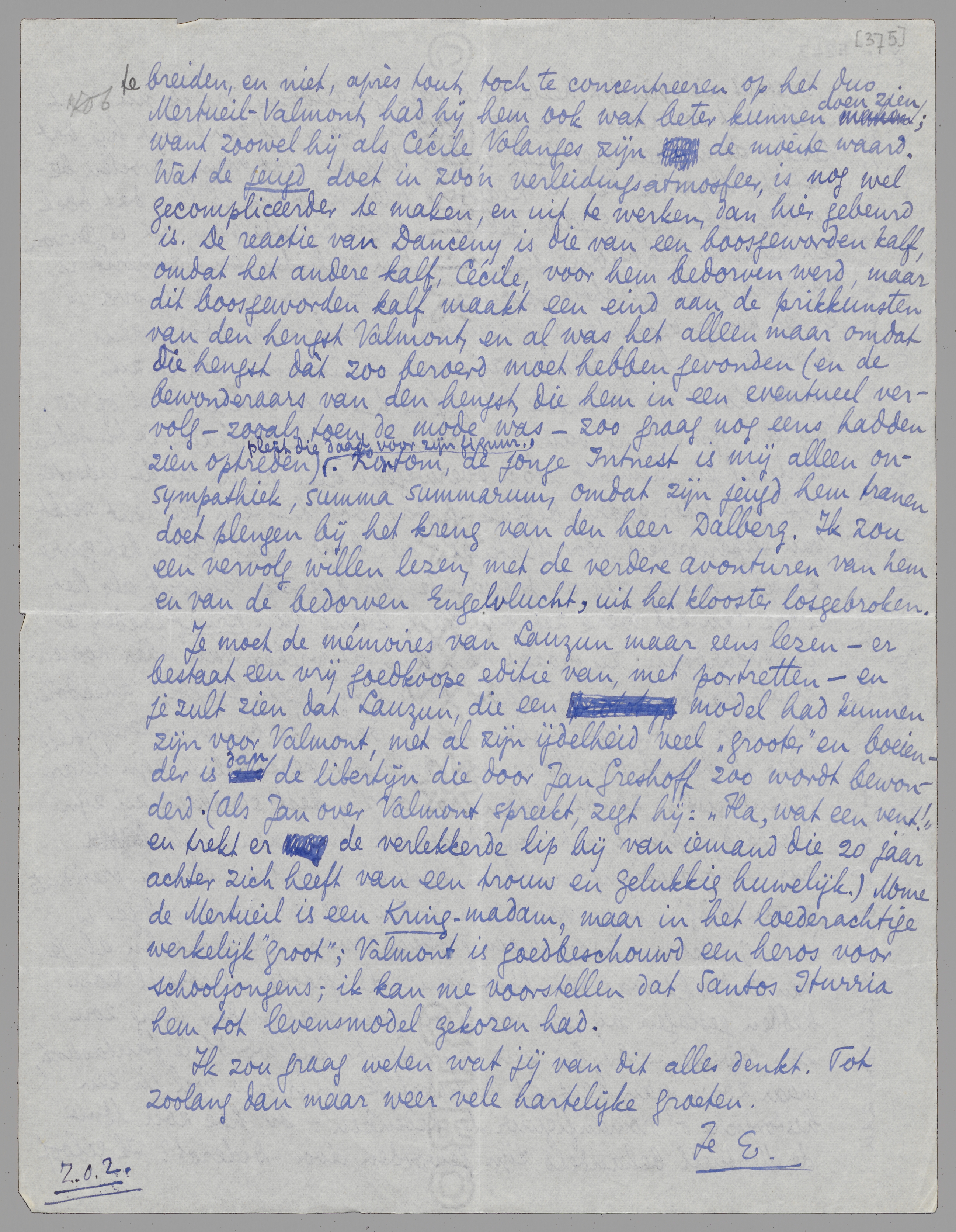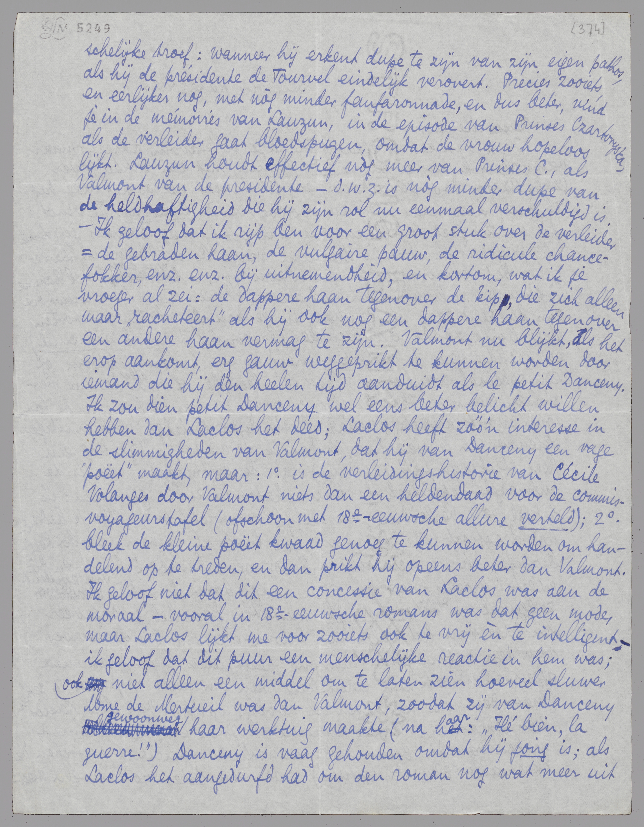 Je moet de mémoires van Lauzun maar eens lezen - er bestaat een vrij goedkoope editie van, met portretten - en je zult zien dat Lauzun, die een model had kunnen zijn voor Valmont, met al zijn ijdelheid veel ‘grooter’ en boeiender is dan de libertijn die door Jan Greshoff zoo wordt bewonderd. (Als Jan over Valmont spreekt, zegt hij: ‘Ha, wat een vent!’ en trekt er de verlekkerde lip bij van iemand die 20 jaar achter zich heeft van een trouw en gelukkig huwelijk.) Mme de Mertueil is een Kring-madam, maar in het loederachtige werkelijk ‘groot’; Valmont is goedbeschouwd een heros voor schooljongens; ik kan me voorstellen dat Santos Iturria hem tot levensmodel gekozen had.