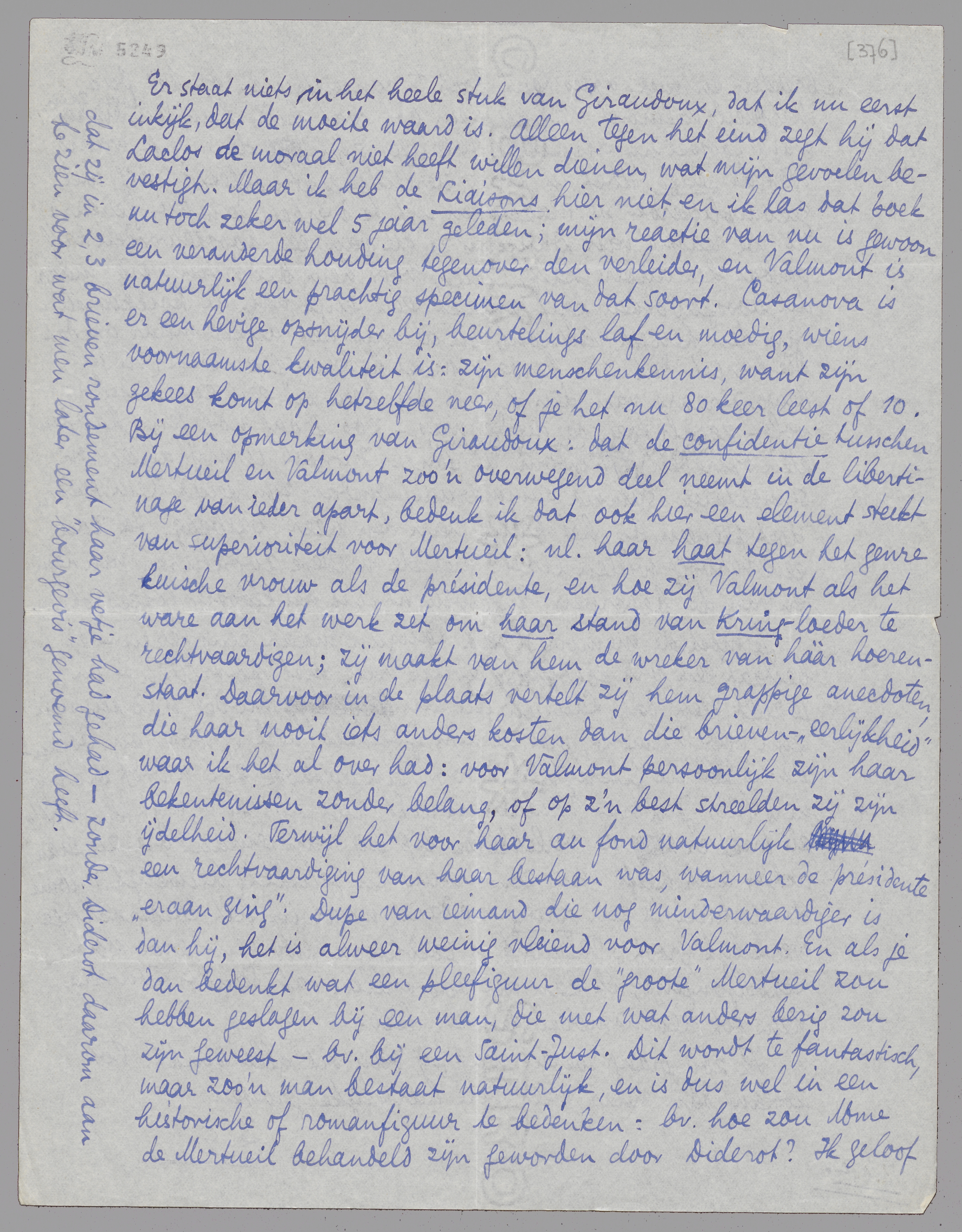 Er staat niets in het heele stuk van Giraudoux, dat ik nu eerst inkijk, dat de moeite waard is. Alleen tegen het eind zegt hij dat Laclos de moraal niet heeft willen dienen, wat mijn gevoelen bevestigt. Maar ik heb de Liaisons hier niet, en ik las dat boek nu toch zeker wel 5 jaar geleden; mijn reactie van nu is gewoon een veranderde houding tegenover den verleider, en Valmont is natuurlijk een prachtig specimen van dat soort. Casanova is er een hevige opsnijder bij, beurtelings laf en moedig, wiens voornaamste kwaliteit is: zijn menschenkennis, want zijn gekees komt op hetzelfde neer, of je het nu 80 keer leest of 10. Bij een opmerking van Giraudoux: dat de confidentie tusschen Mertueil en Valmont zoo'n overwegend deel neemt in de libertinage van ieder apart, bedenk ik dat ook hier een element steekt van superioriteit voor Mertueil: nl. haar haat tegen het genre kuische vrouw als de présidente, en hoe zij Valmont als het ware aan het werk zet om haar stand van Kring-loeder te rechtvaardigen; zij maakt van hem de wreker van hààr hoerenstaat. Daarvoor in de plaats vertelt zij hem grappige anecdoten, die haar nooit iets anders kosten dan die brieven - ‘eerlijkheid’ waar ik het al over had: voor Valmont persoonlijk zijn haar bekentenissen zonder belang, of op z'n best streelden zij zijn ijdelheid. Terwijl het voor haar au fond natuurlijk een rechtvaardiging van haar bestaan was, wanneer de présidente ‘eraan ging’. Dupe van iemand die nog minderwaardiger is dan hij, het is alweer weinig vleiend voor Valmont. En als je dan bedenkt wat een pleefiguur de ‘groote’ Mertueil zou hebben geslagen bij een man, die met wat anders bezig zou zijn geweest - bv. bij een Saint-Just. Dit wordt te fantastisch, maar zoo'n man bestaat natuurlijk, en is dus wel in een historische of romanfiguur te bedenken: bv. hoe zou Mme de Mertueil behandeld zijn geworden door Diderot? Ik geloof dat zij in 2,3 brieven rondement haar vetje had gehad - zonder Diderot daarom aan te zien voor wat men later een ‘bourgeois’ genoemd heeft.